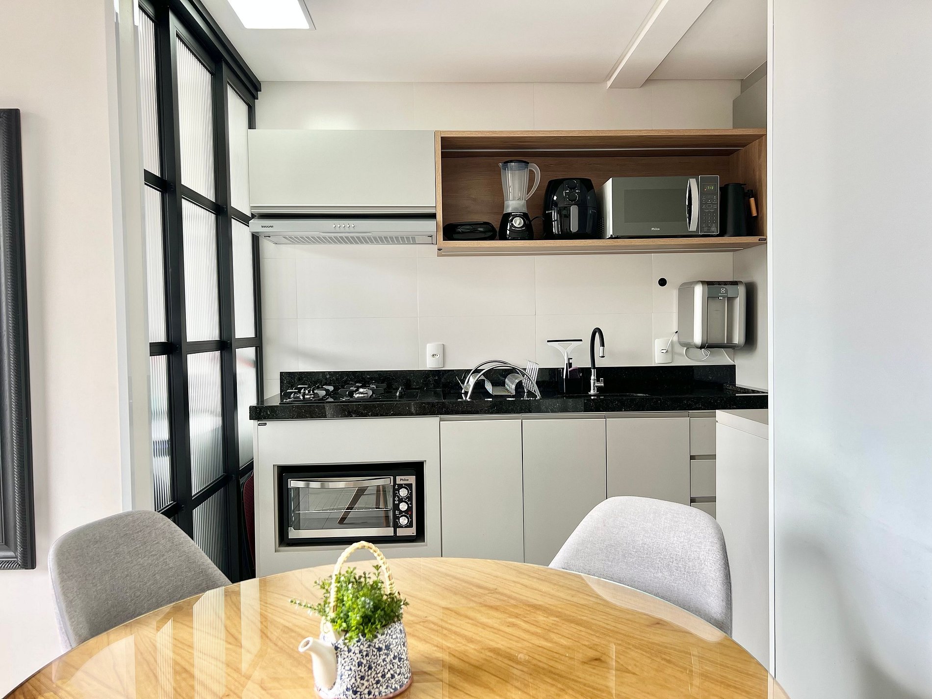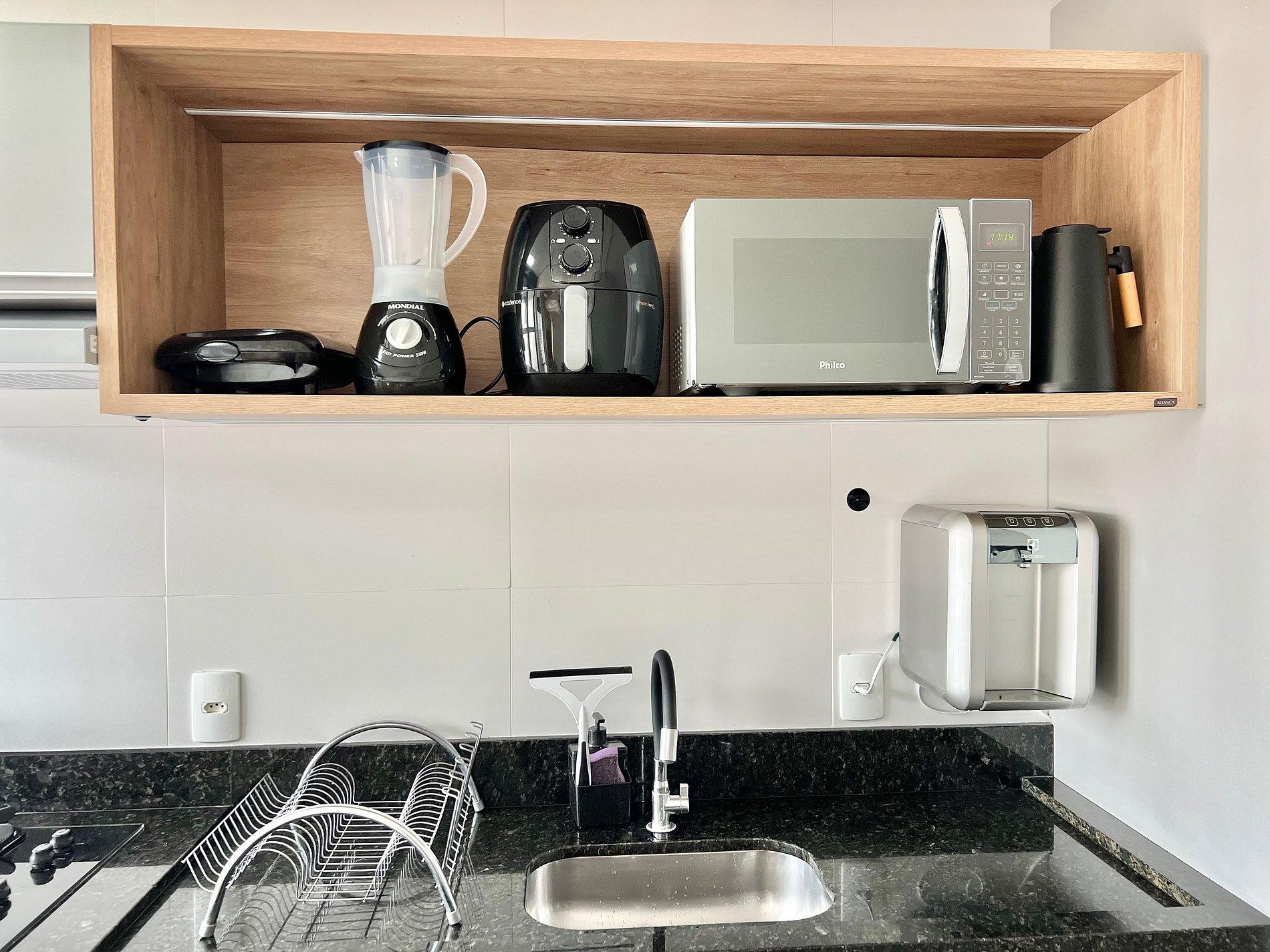Cozinha: fogão, forno, geladeira, cafeteira, liquidificador, micro-ondas e utensílios de cozinha, Air fryer, sanduicheira, chaleira elétrica.