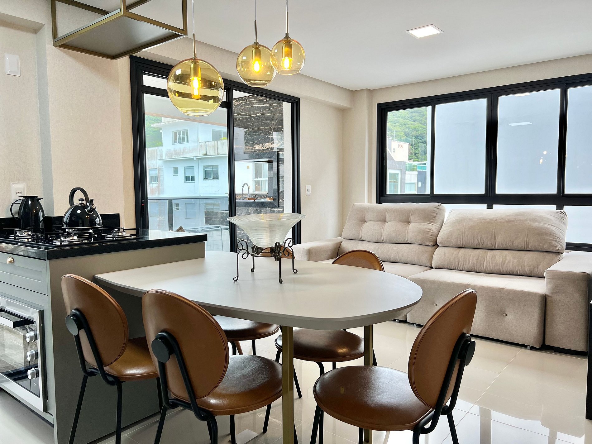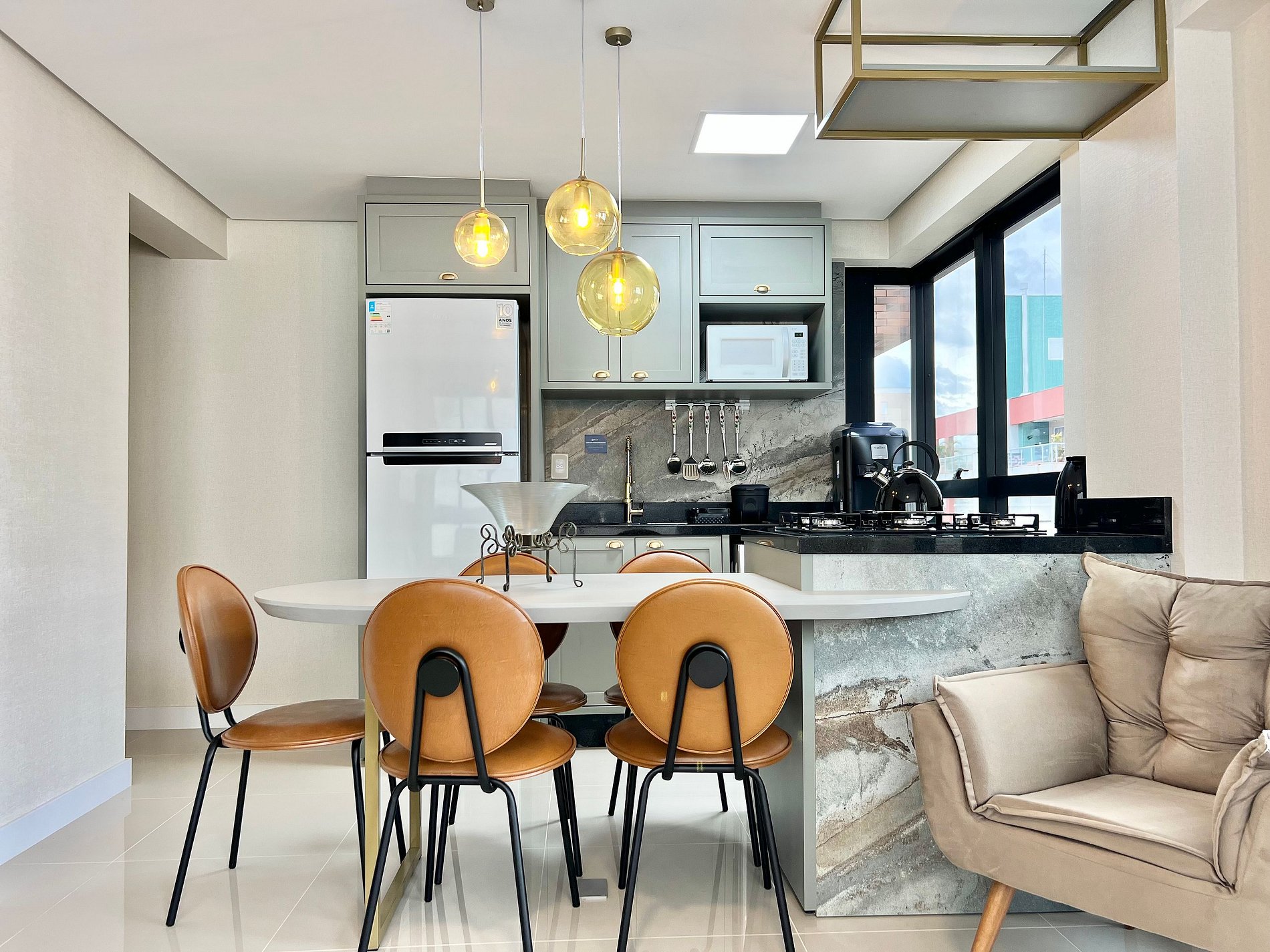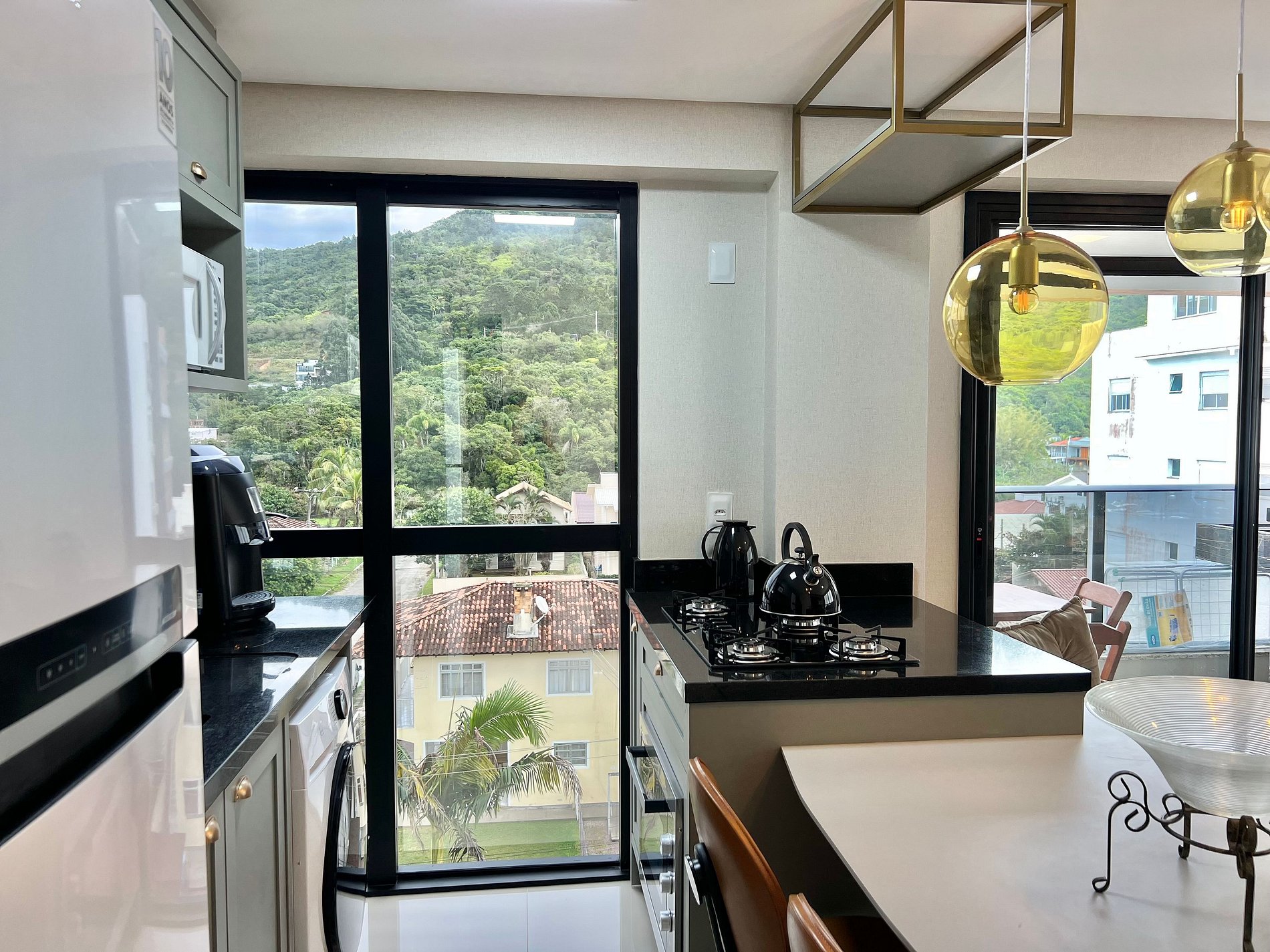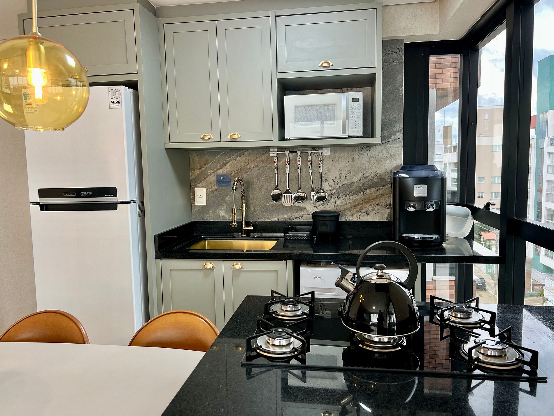 Cozinha: Fogão cooktop, geladeira, micro-ondas e utensílios de cozinha.
