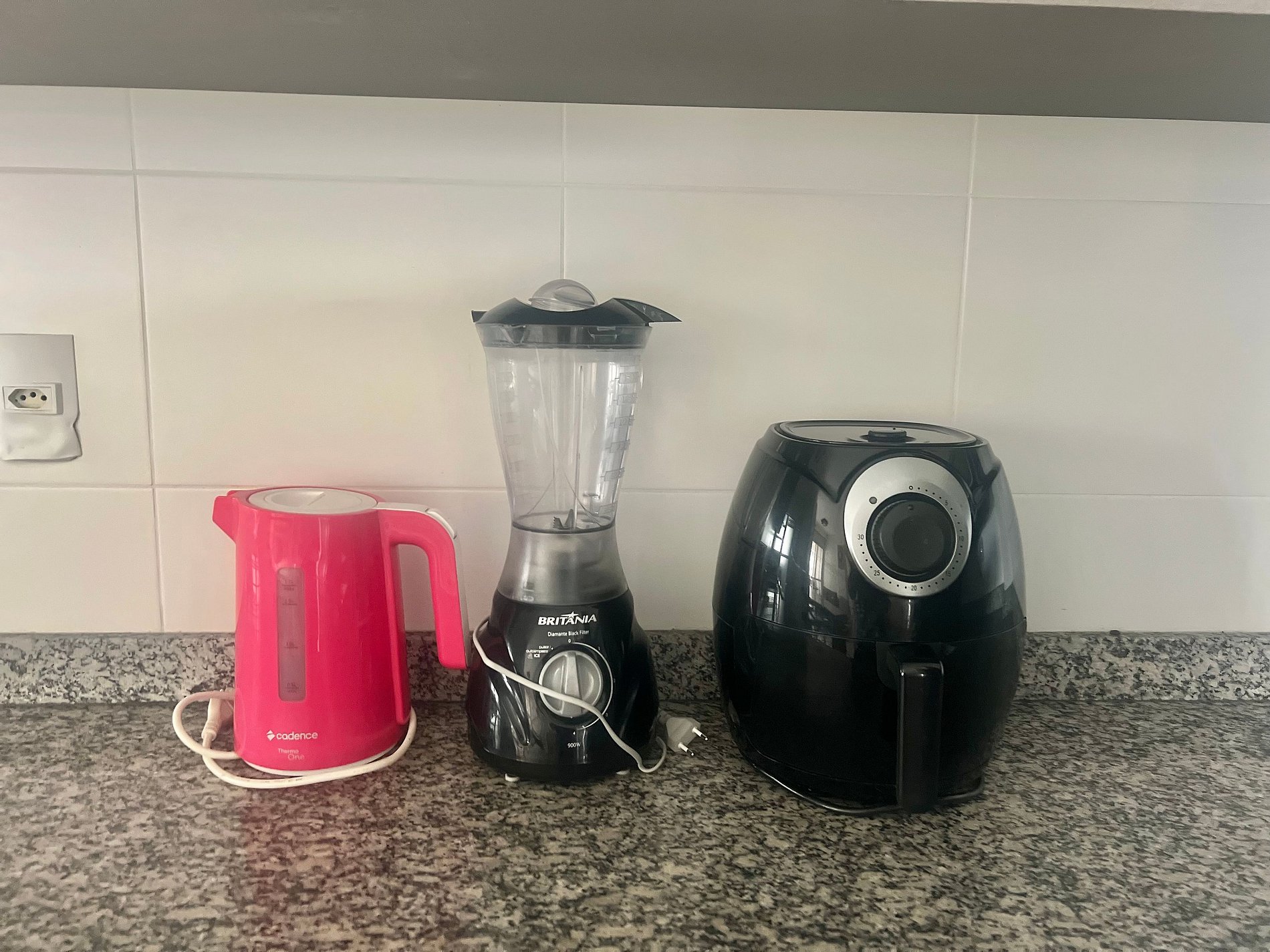 Geladeira, chaleira elétrica, micro-ondas e utensílios básicos de cozinha.