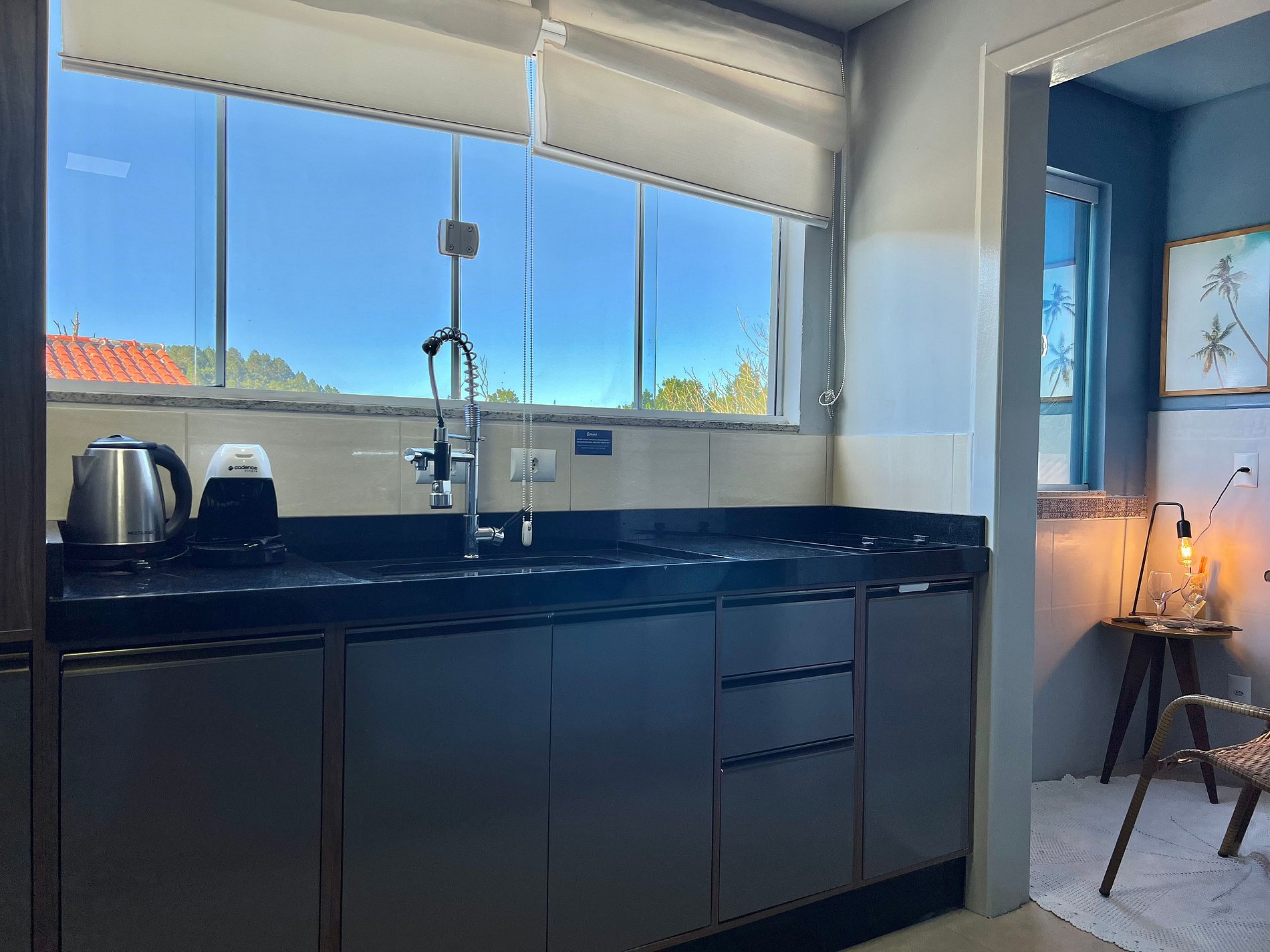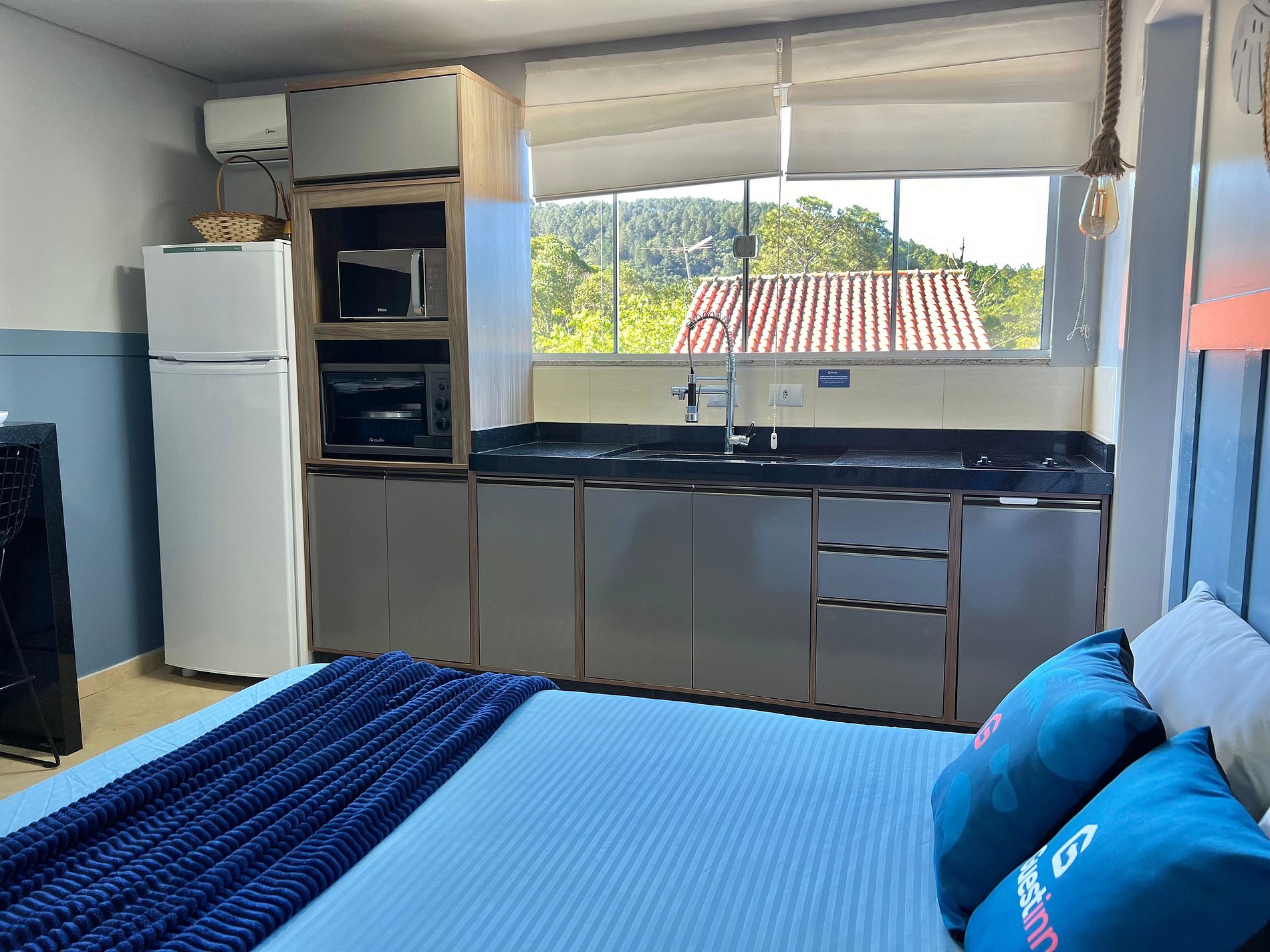 Na acomodação você irá encontrar: Cama casal e ar-condicionado. Cozinha: Fogão cooktop, geladeira, microondas, cafeteira, forno, utensílios de cozinha, Smart Tv, Internet Wifi.