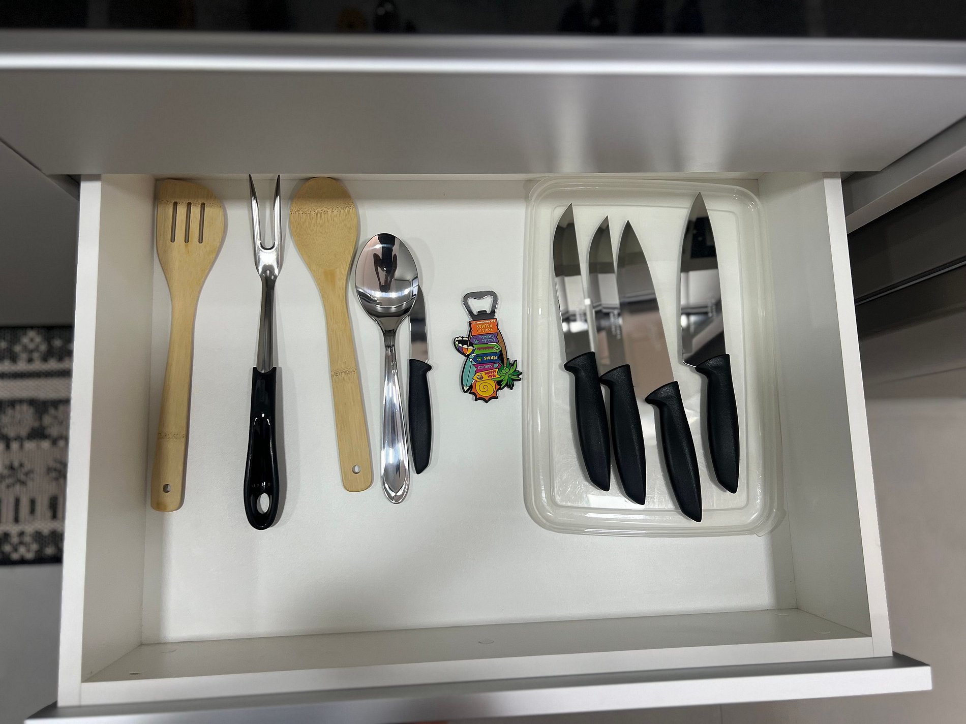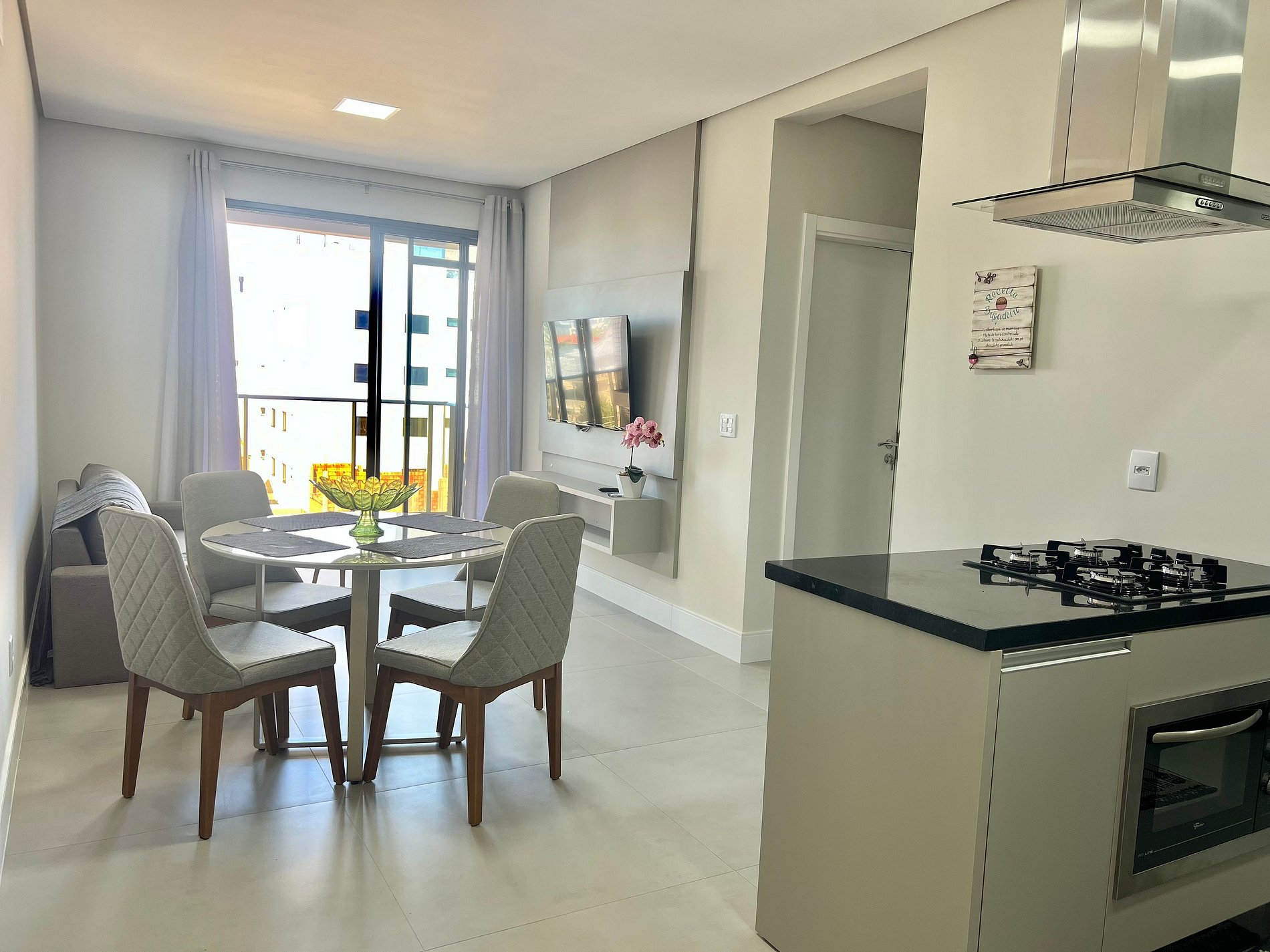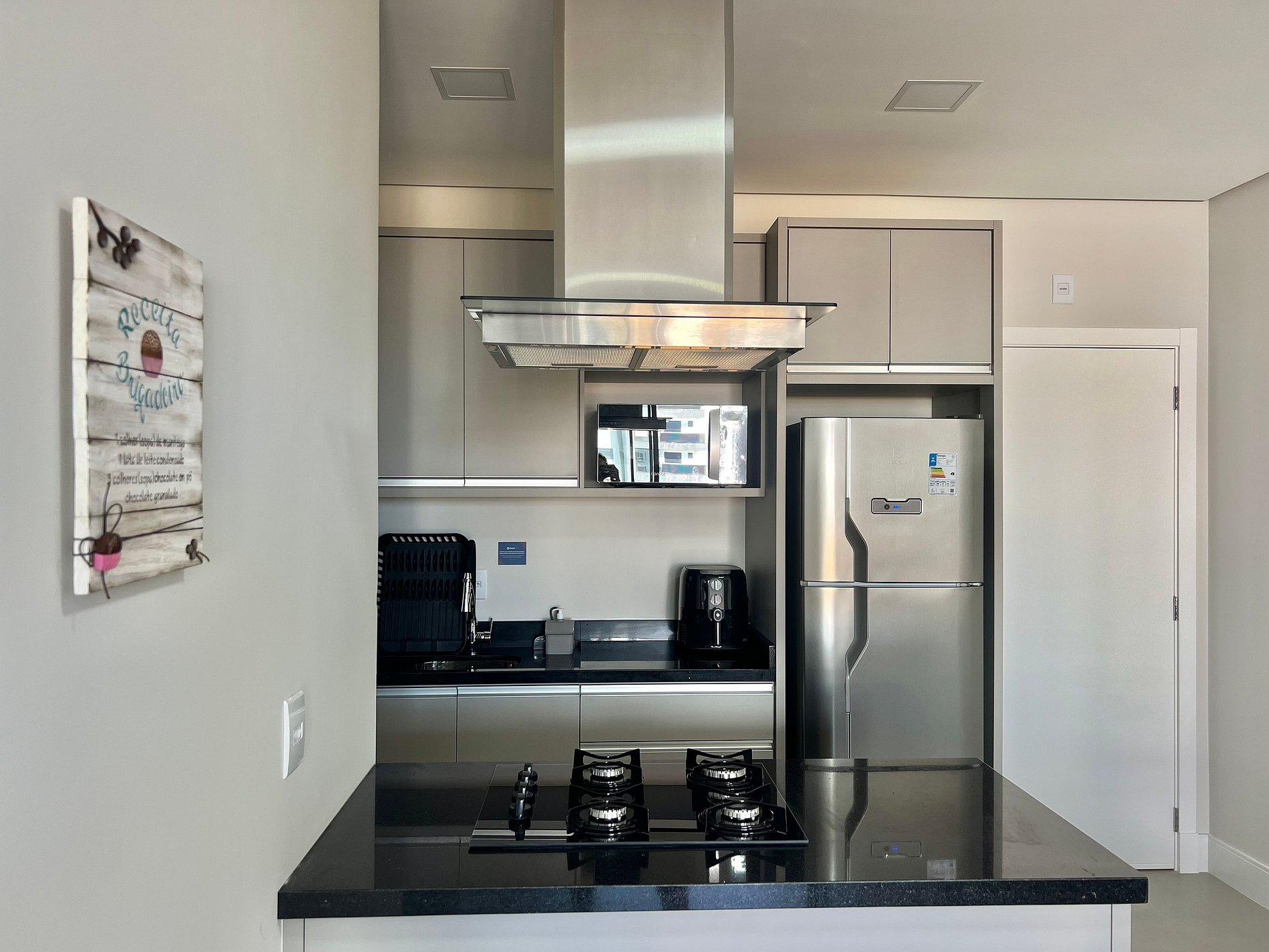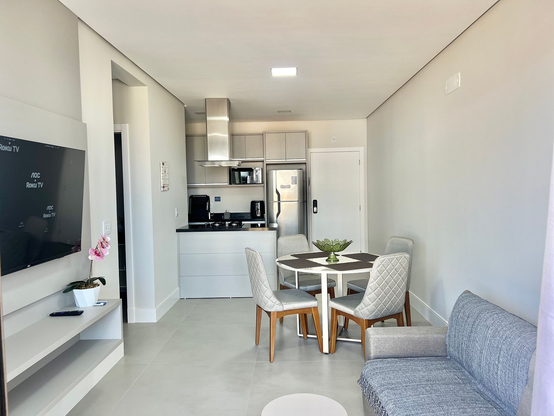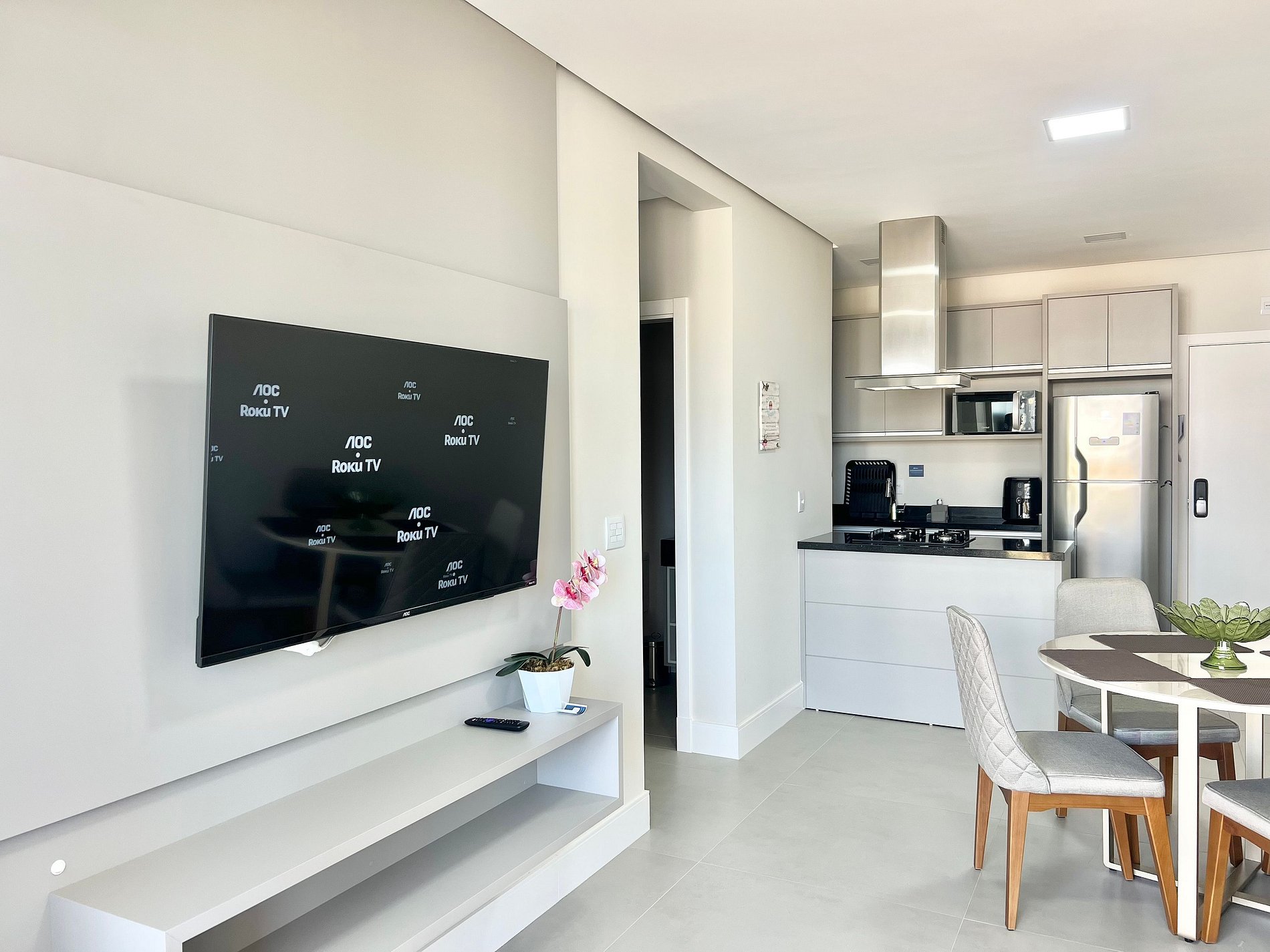 Smart tv, Geladeira Airfryer, chaleira elétrica, micro-ondas e utensílios básicos de cozinha.