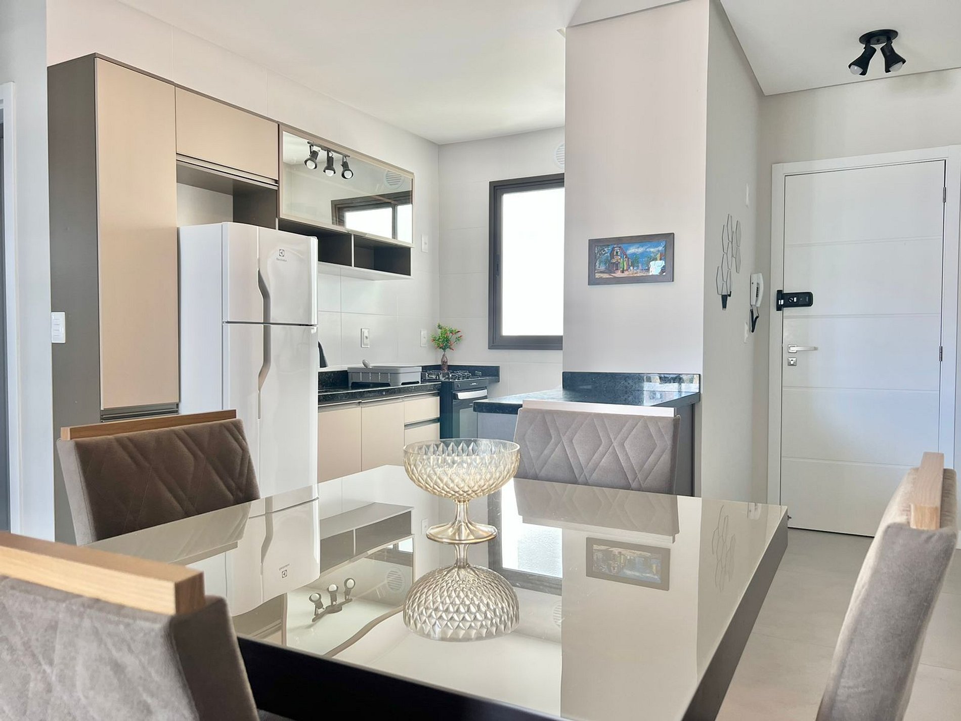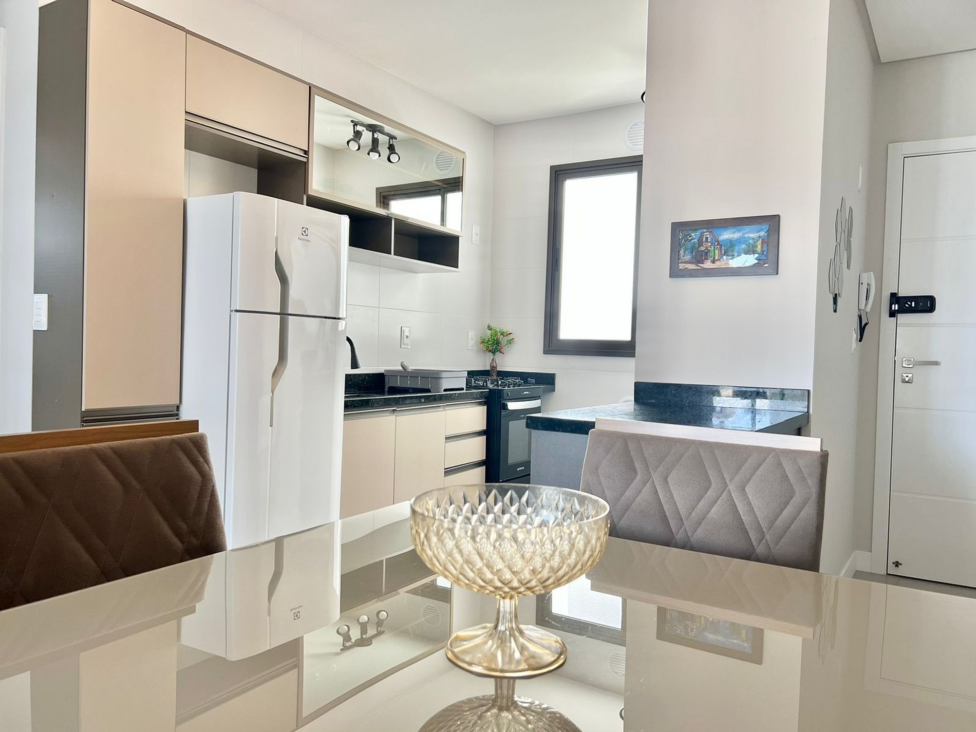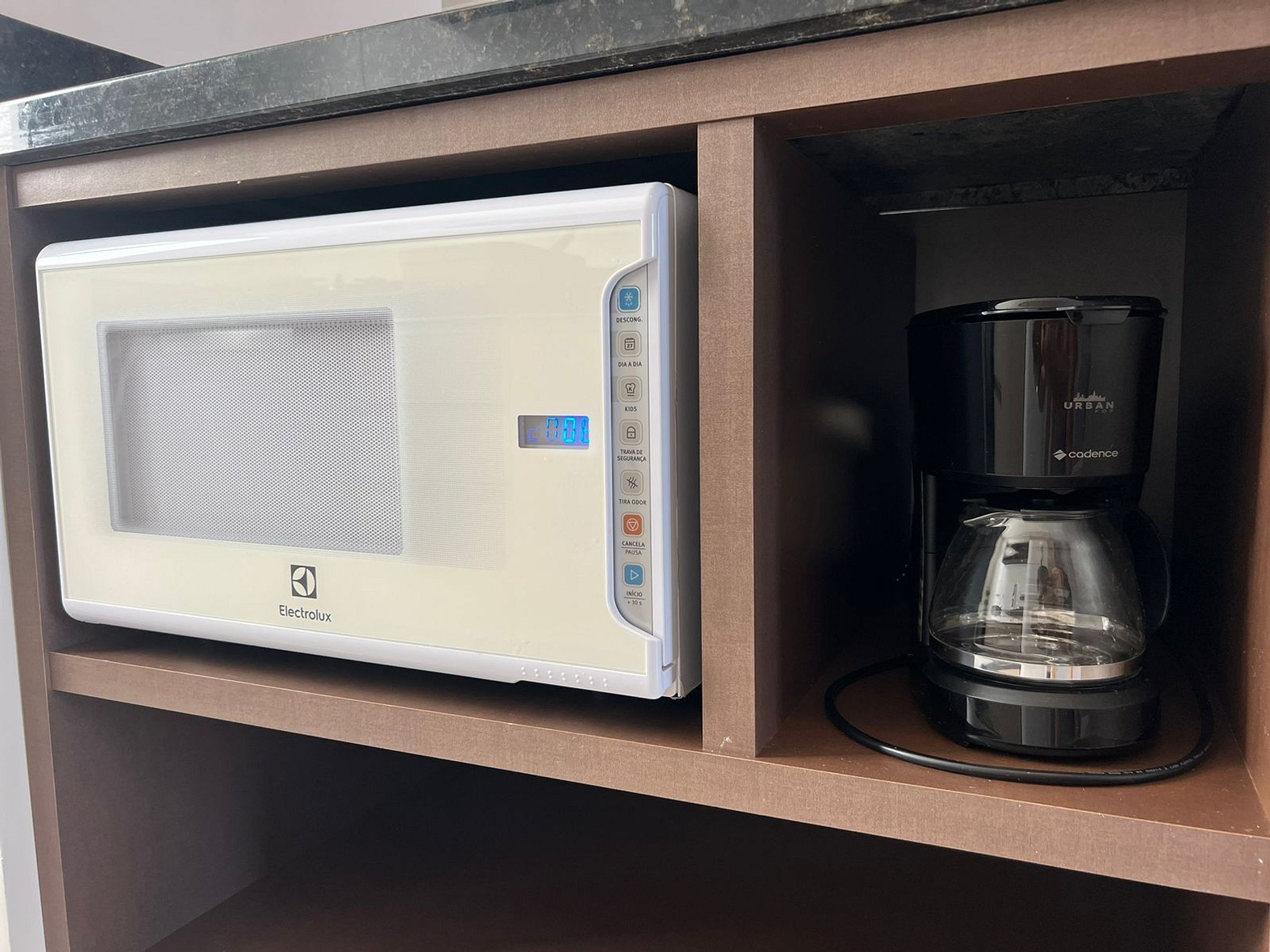 Cozinha: Fogão, forno, geladeira, cafeteira, liquidificador, micro-ondas e utensílios de cozinha.