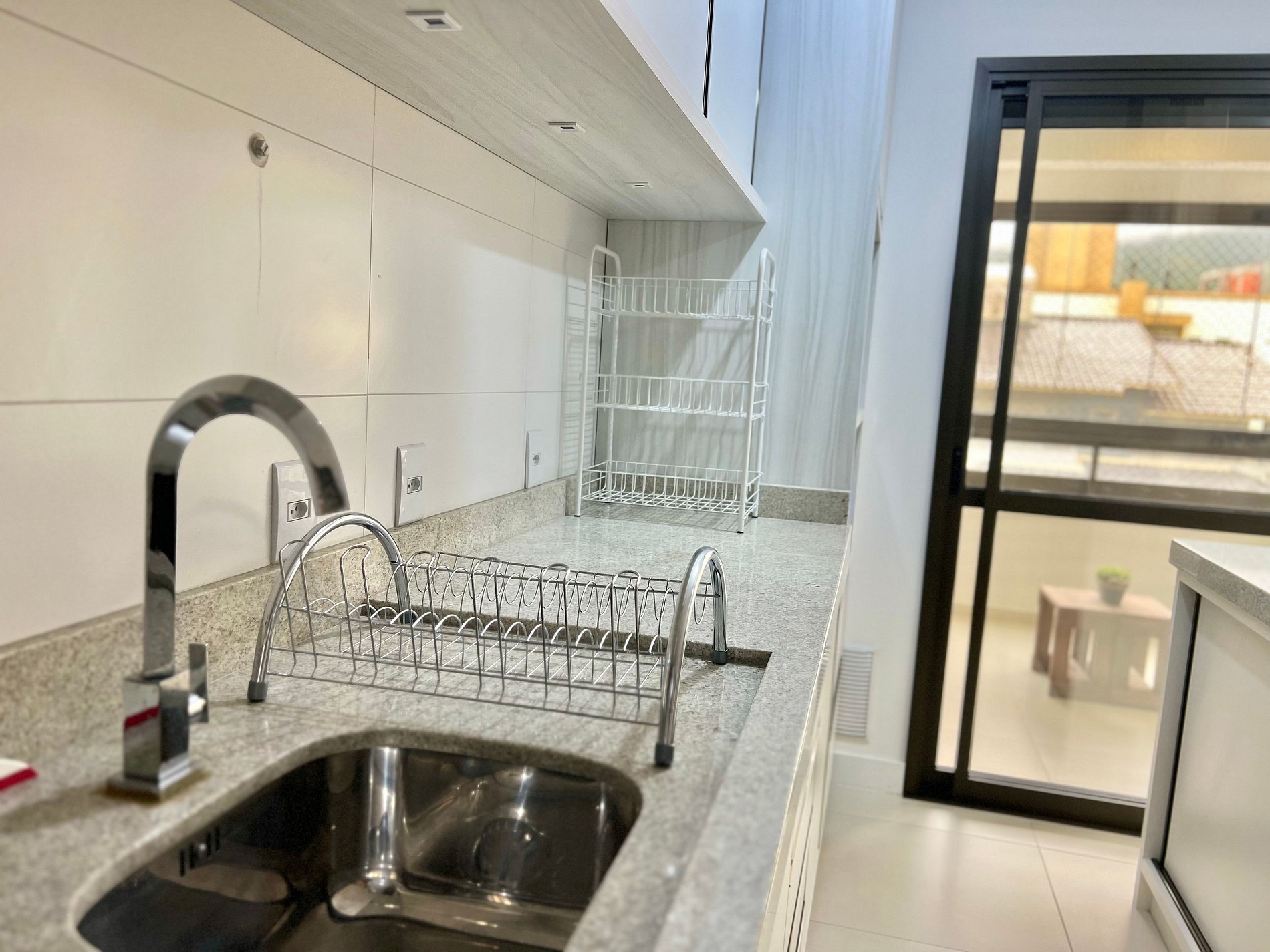 Cozinha: Fogão cooktop, geladeira, liquidificador, micro-ondas e utensílios de cozinha.