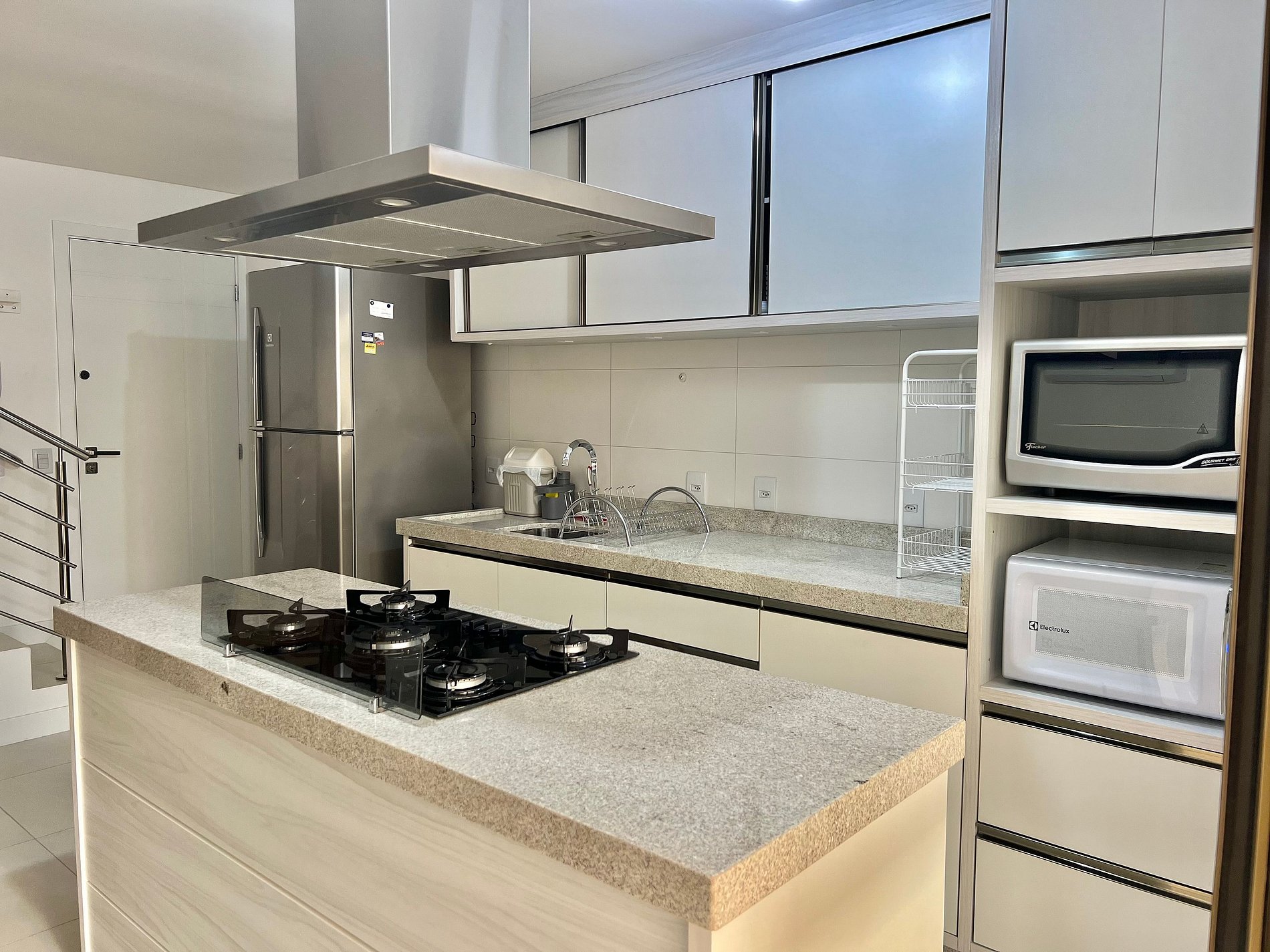 Cozinha: Fogão cooktop, geladeira, liquidificador, micro-ondas e utensílios de cozinha.