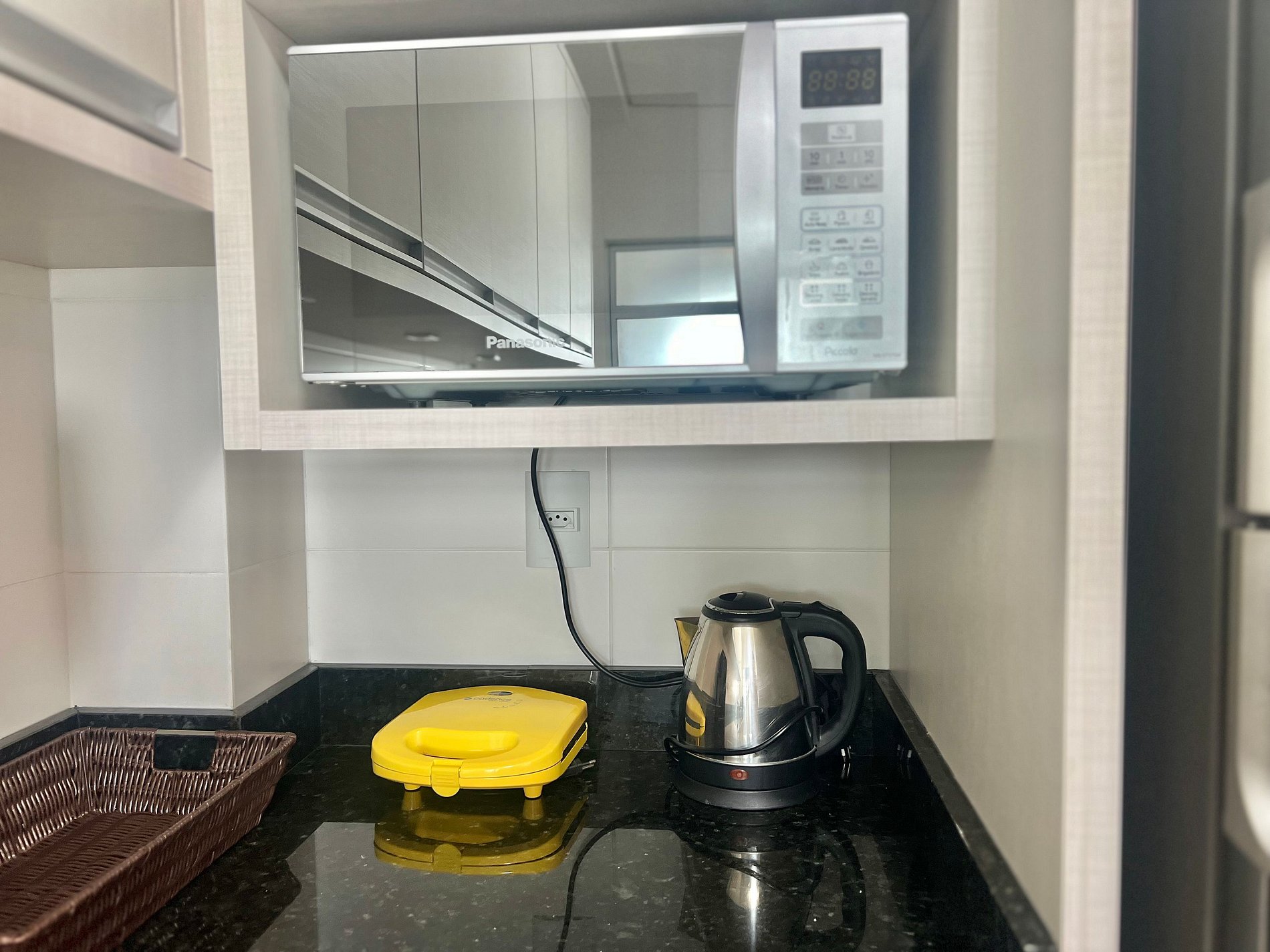 Cozinha: Fogão a gás, forno a gás, geladeira, liquidificador, micro-ondas, chaleira elétrica, sanduicheira e utensílios de cozinha.