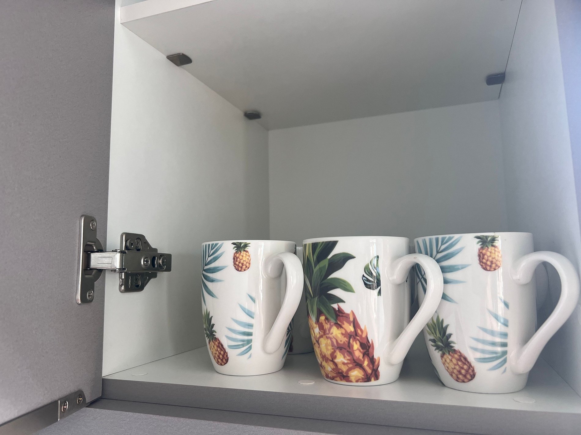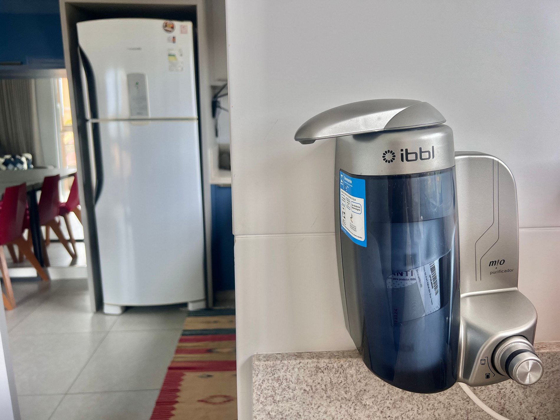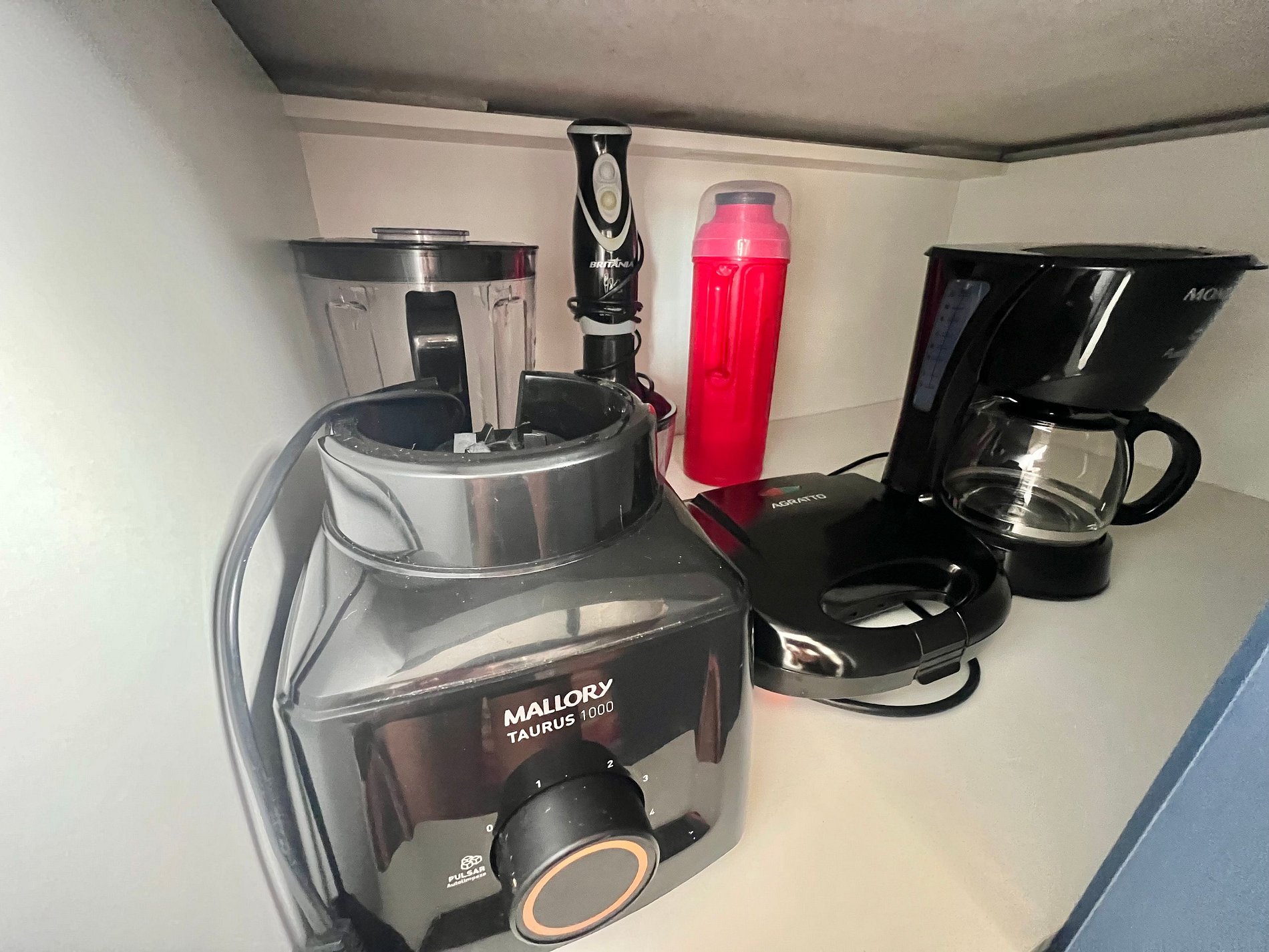 Cozinha: Fogão, geladeira, micro-ondas, forno, chaleira elétrica e utensílios de cozinha.