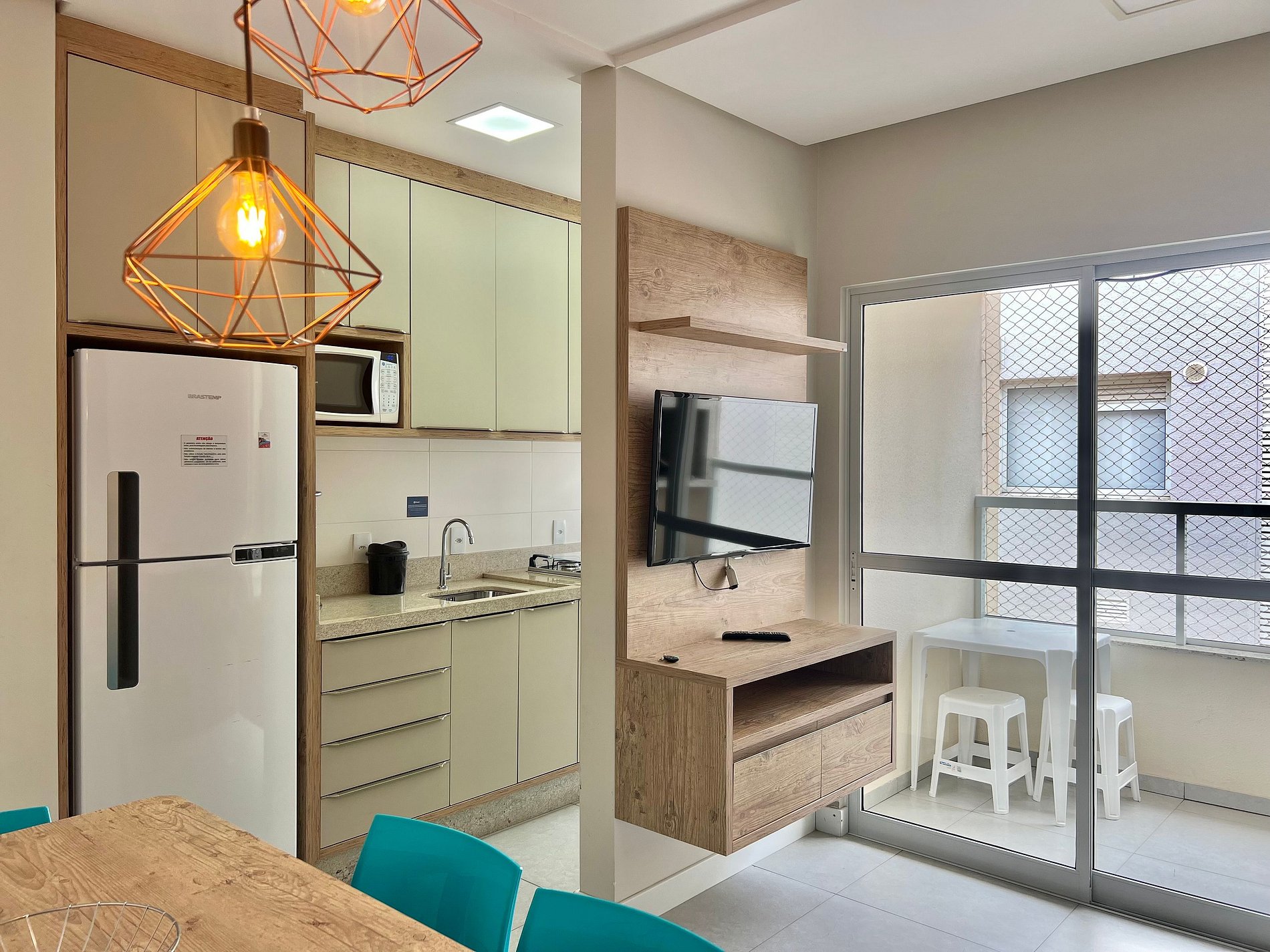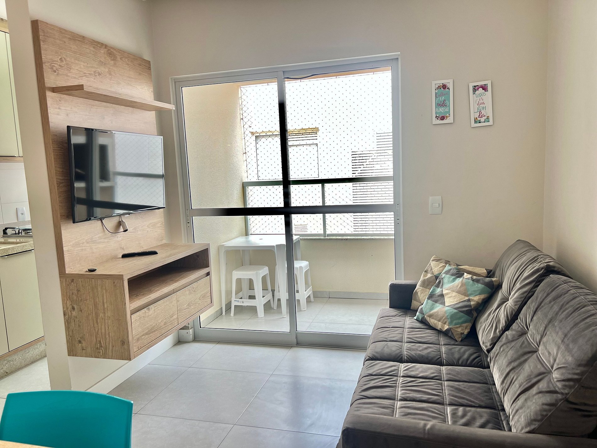 Apto possui 2 quartos, sendo 1 suíte, ambos possuem ar condicionado. Sala com TV Smart, Wi-fi, cozinha toda equipada e área de serviço com máquina de lavar, sacada com churrasqueira e mesa, 1 vaga de garagem coberta. Ambiente super preparado para receber os hóspedes da melhor forma.