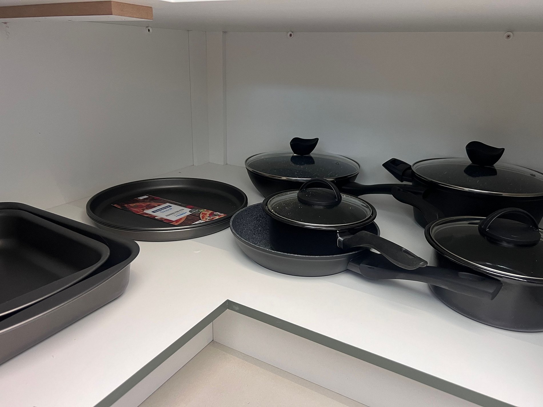 Cozinha: Geladeira, fogão, forno e utensílios de cozinha.