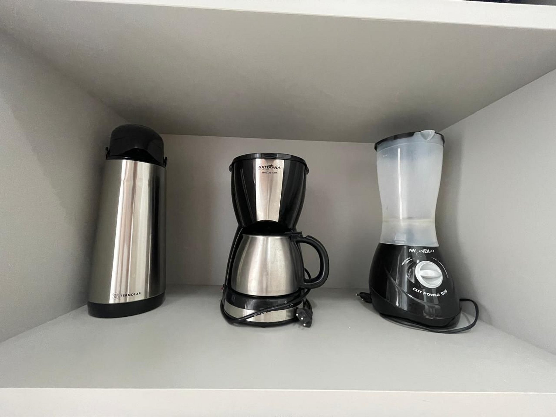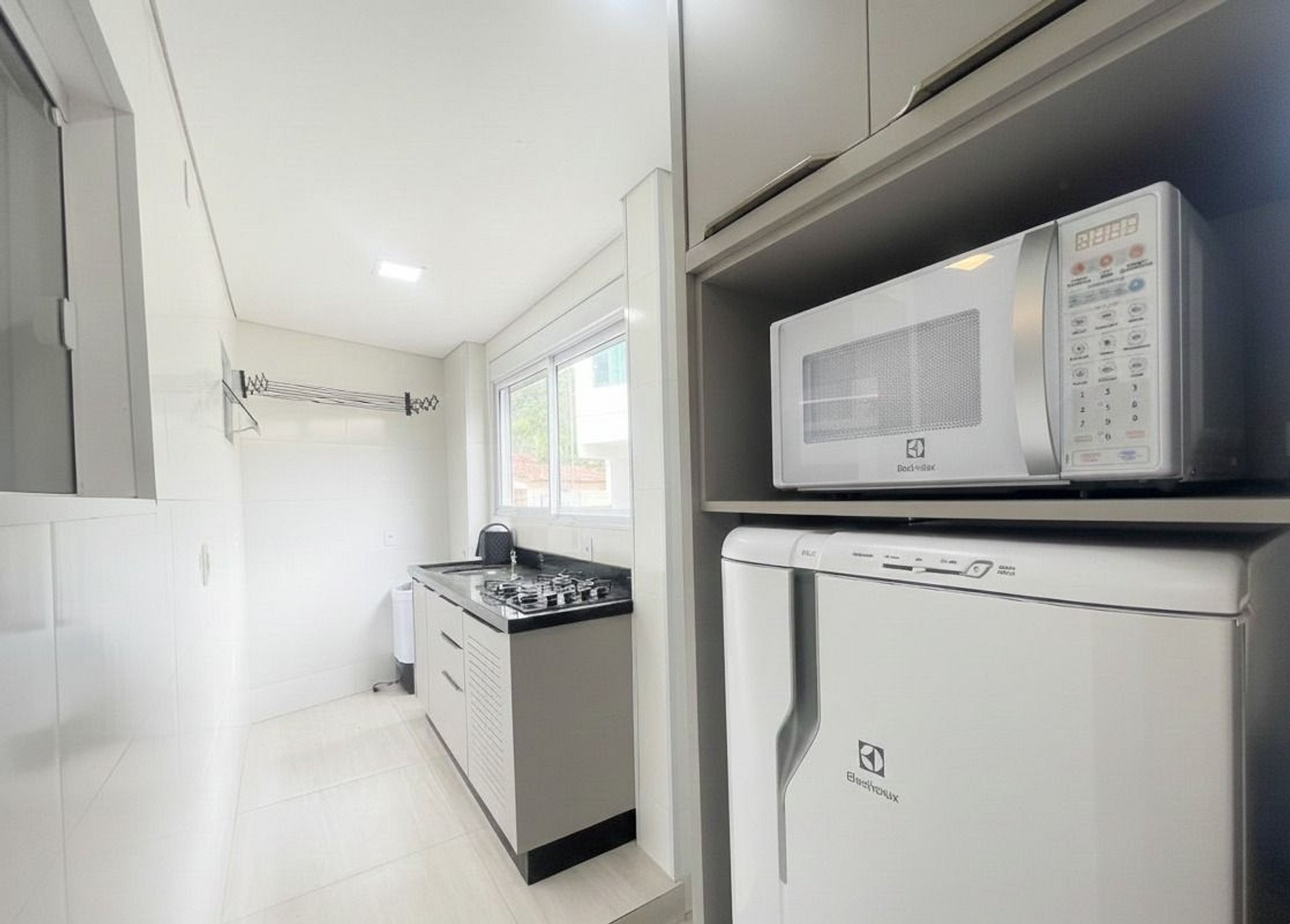 Cozinha: Fogão, geladeira, liquidificador, micro-ondas, sanduicheira, chaleira elétrica e utensílios de cozinha.