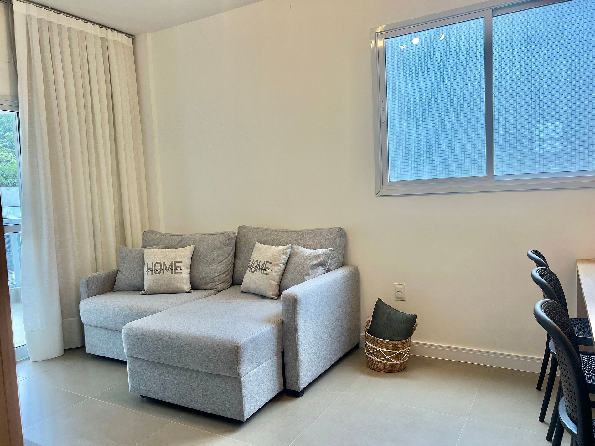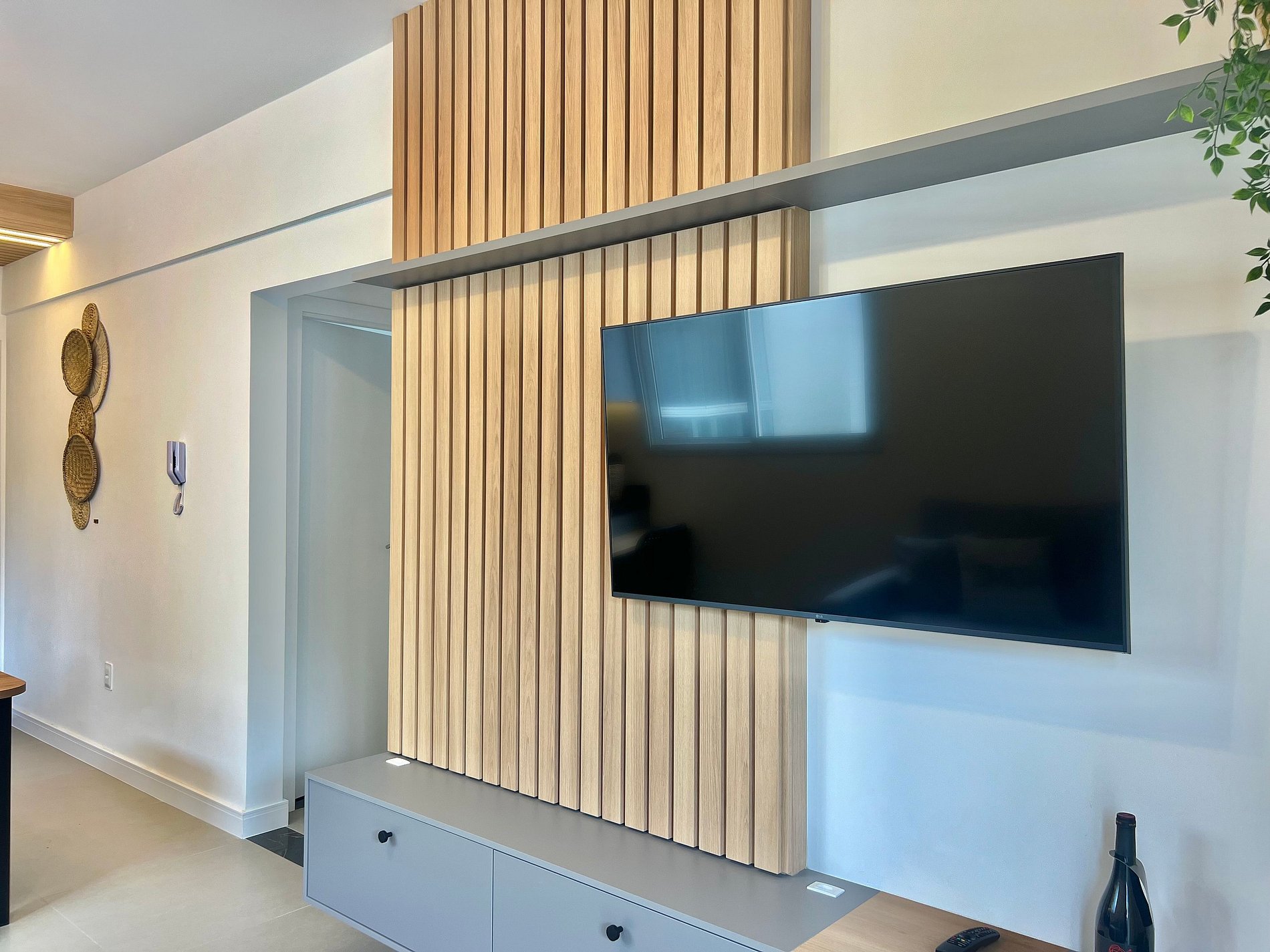 2 camas Queen, 1 sofá cama, ar-condicionado nos quartos, Smart TV na sala.