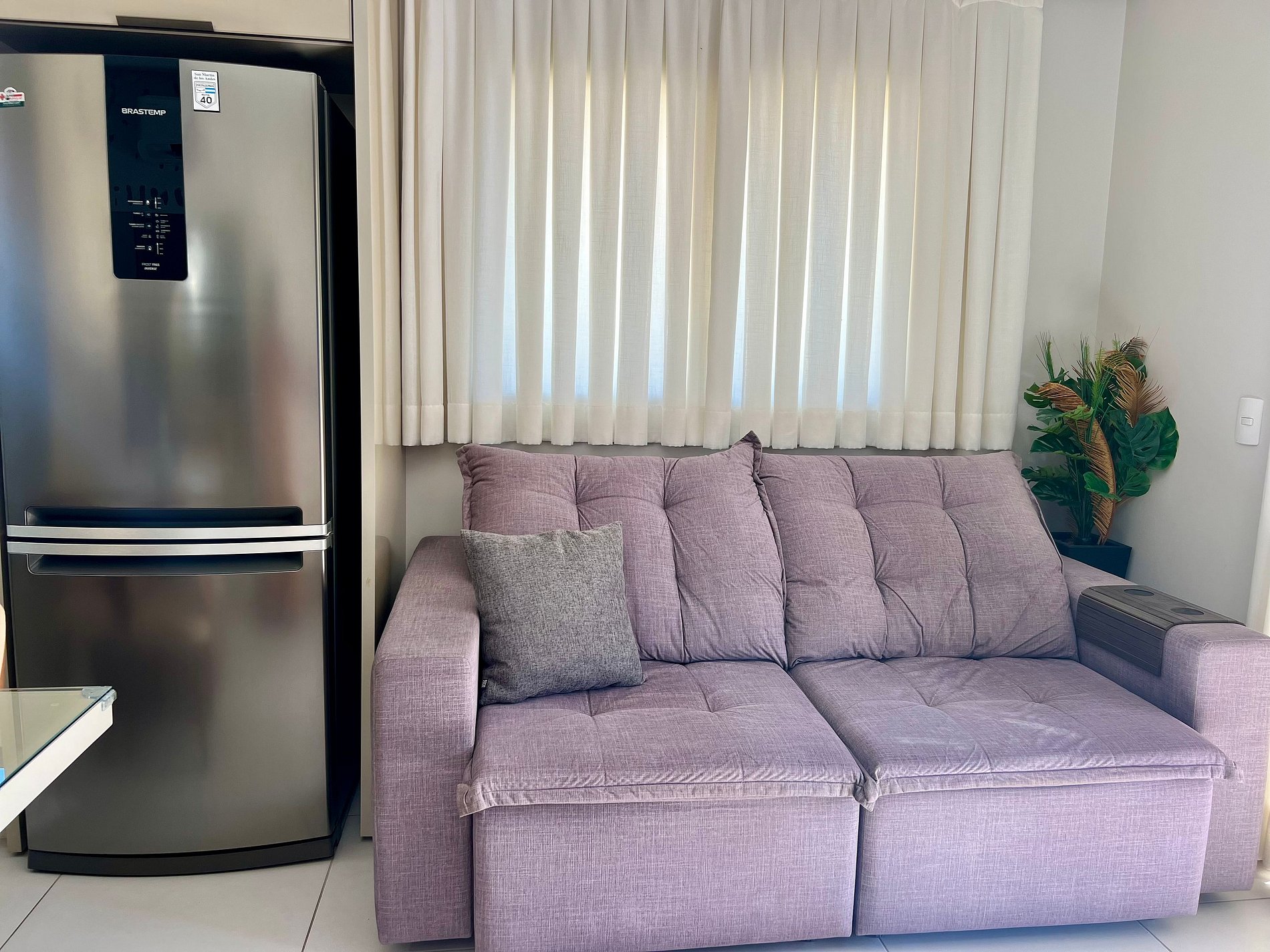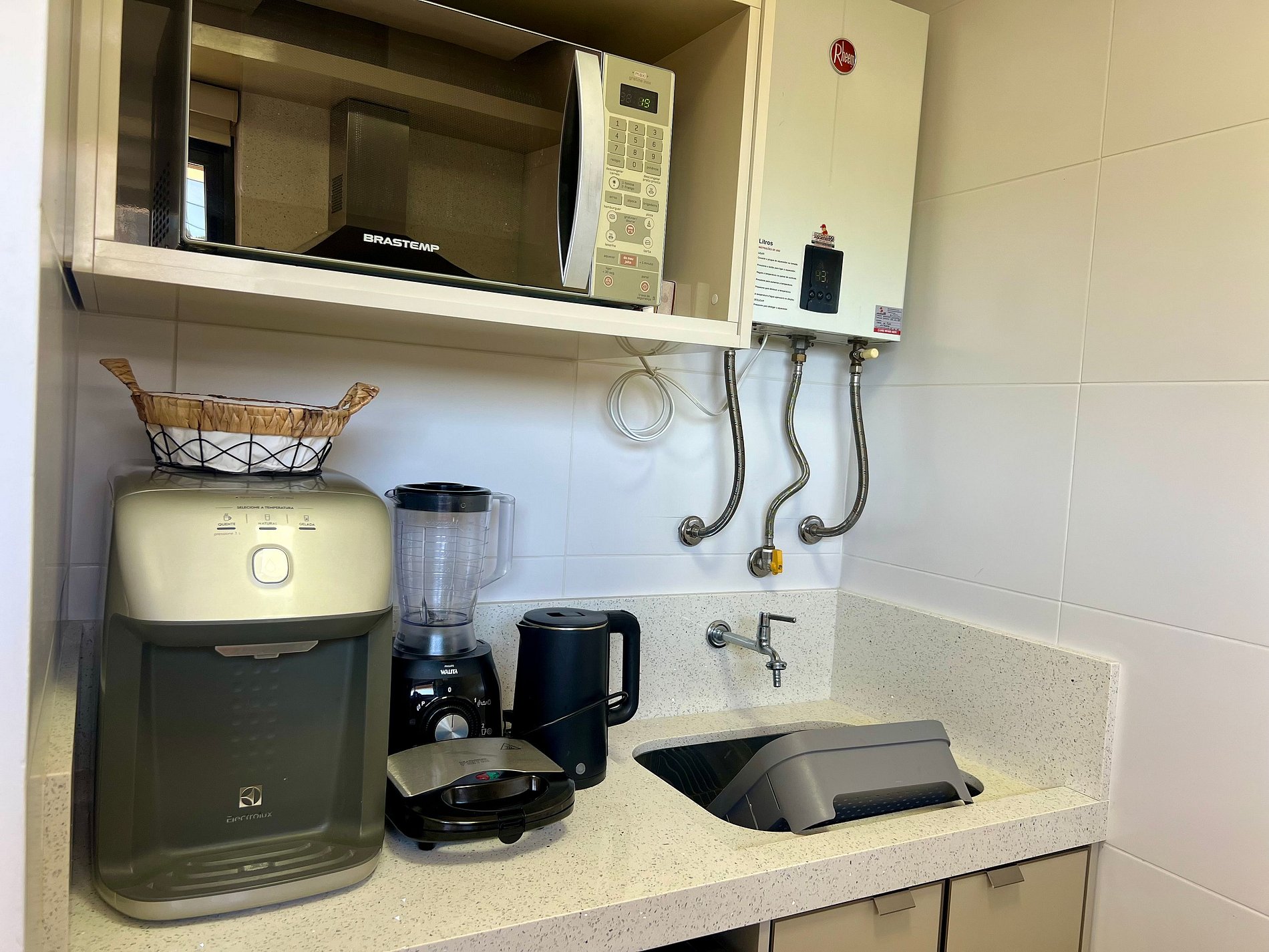 Cozinha: Fogão, geladeira, microondas, liquidificador, cafeteira, chaleira elétrica, sanduicheira e utensílios de cozinha.