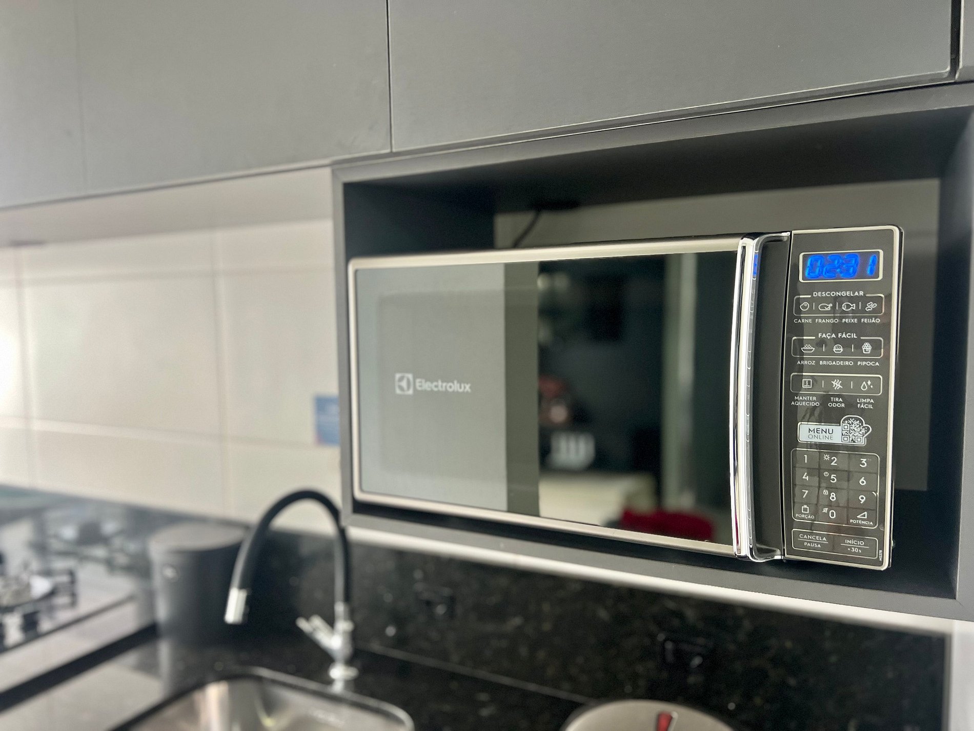 Cozinha: Fogão, geladeira, liquidificador, micro-ondas, forno e utensílios de cozinha.