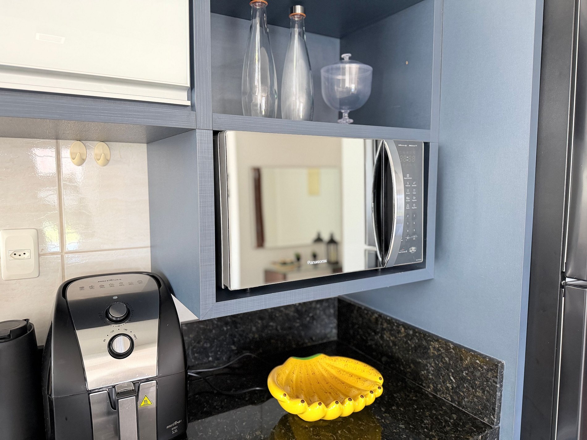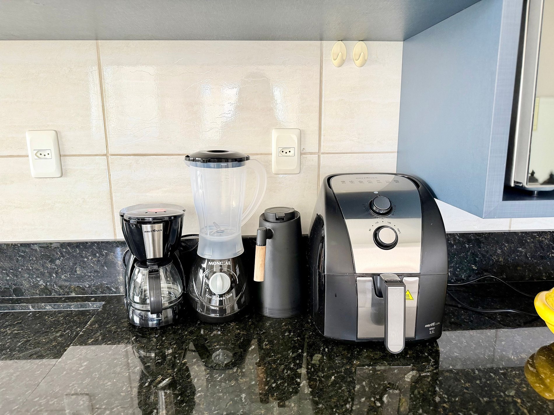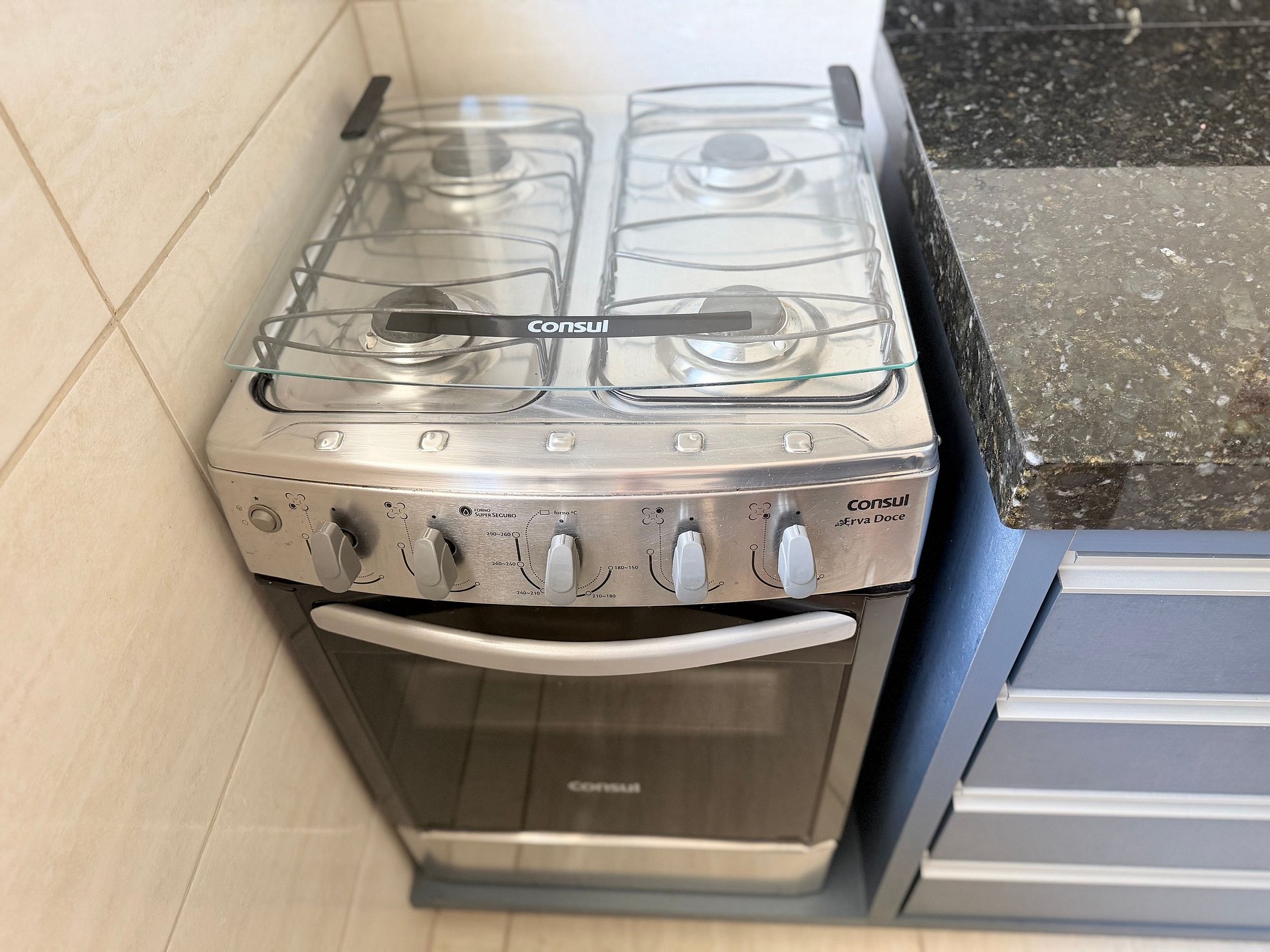 Cozinha: Fogão, geladeira, micro-ondas, chaleira elétrica e utensílios de cozinha,