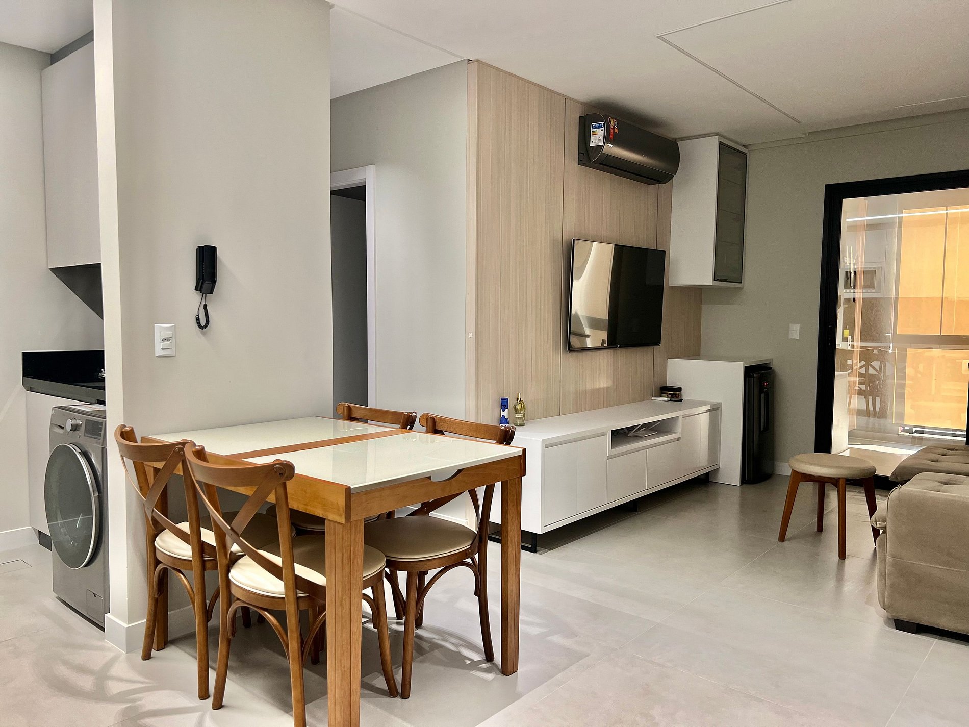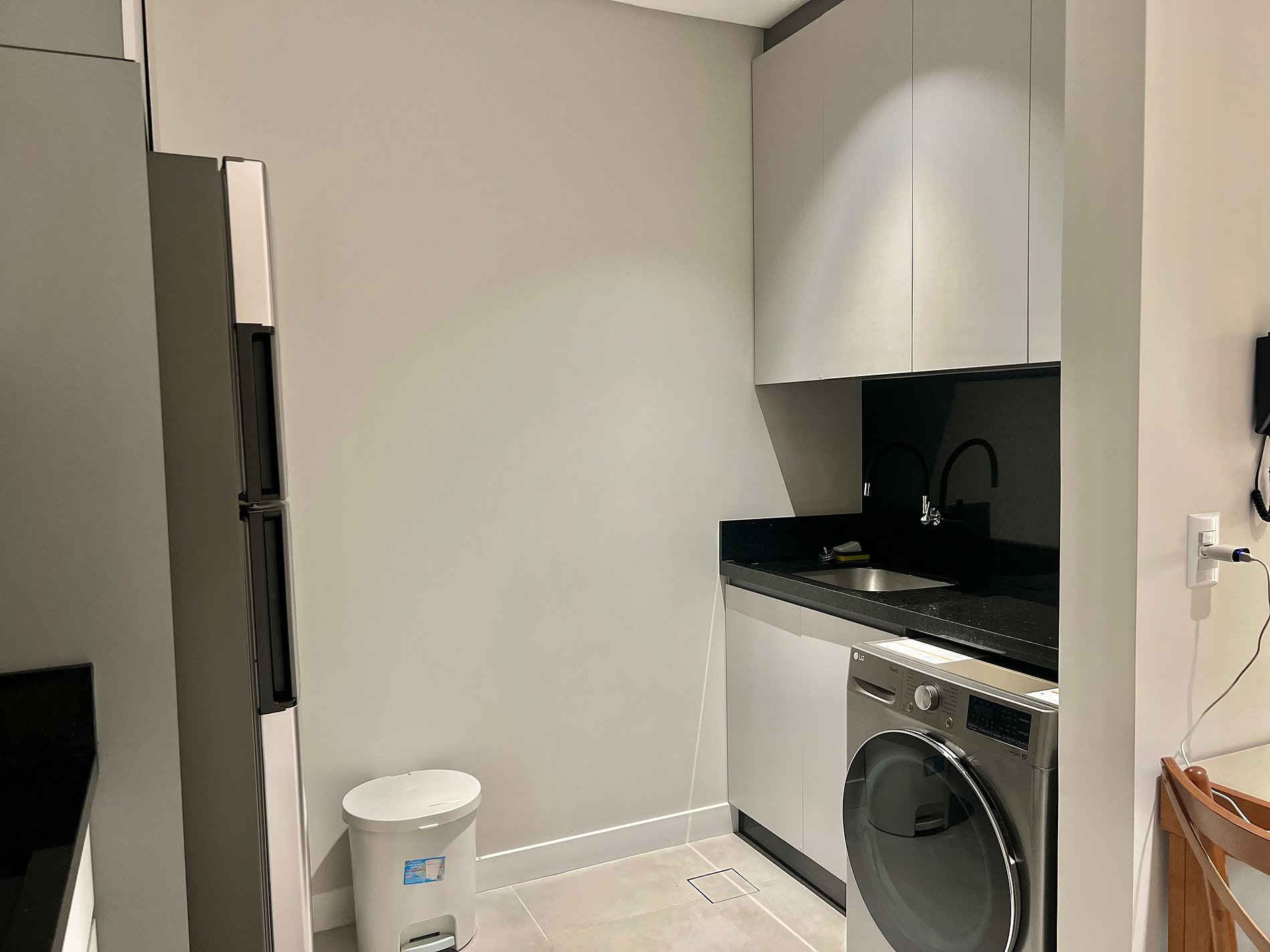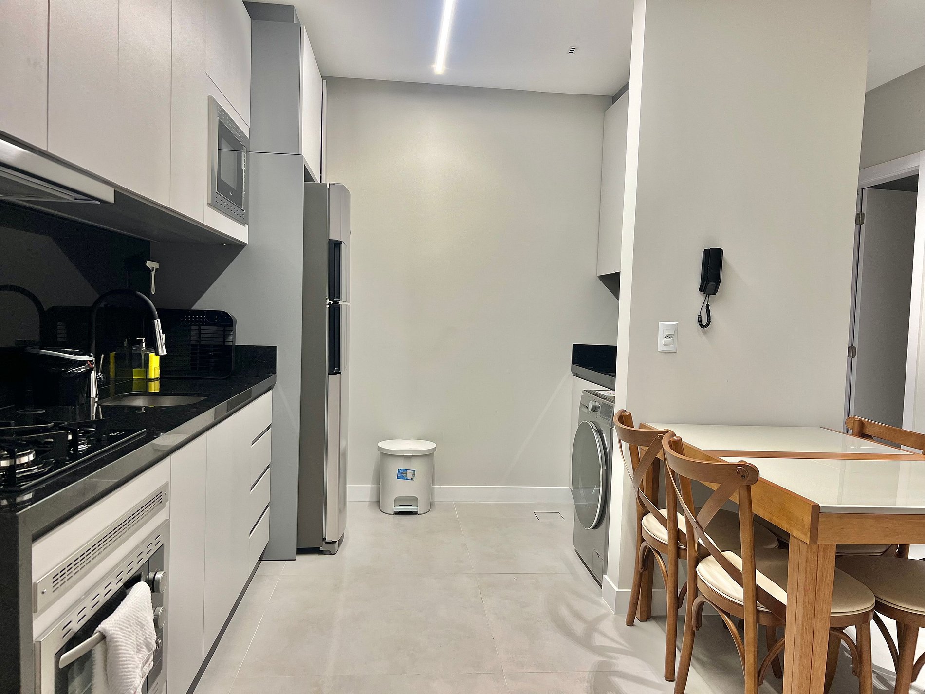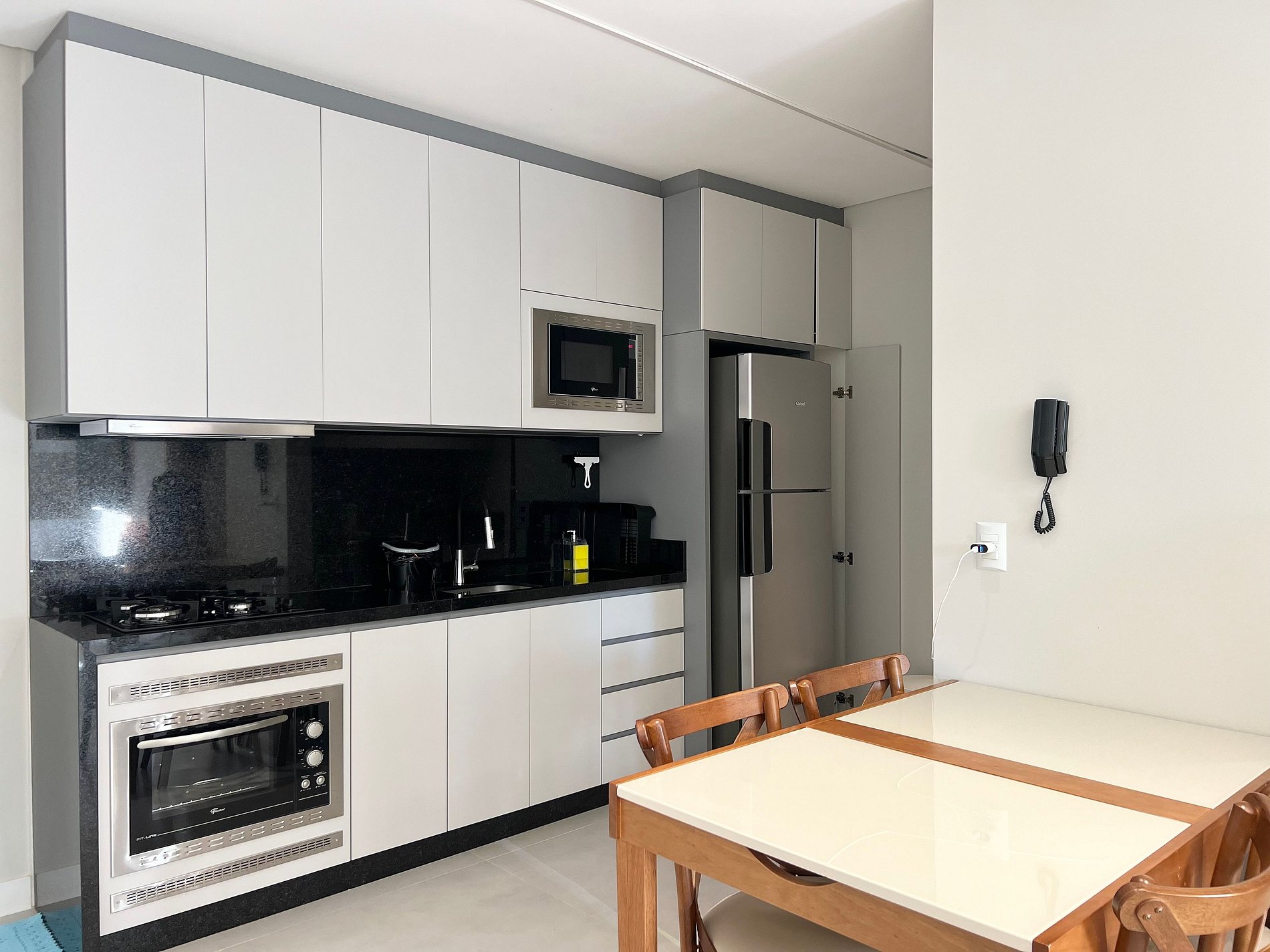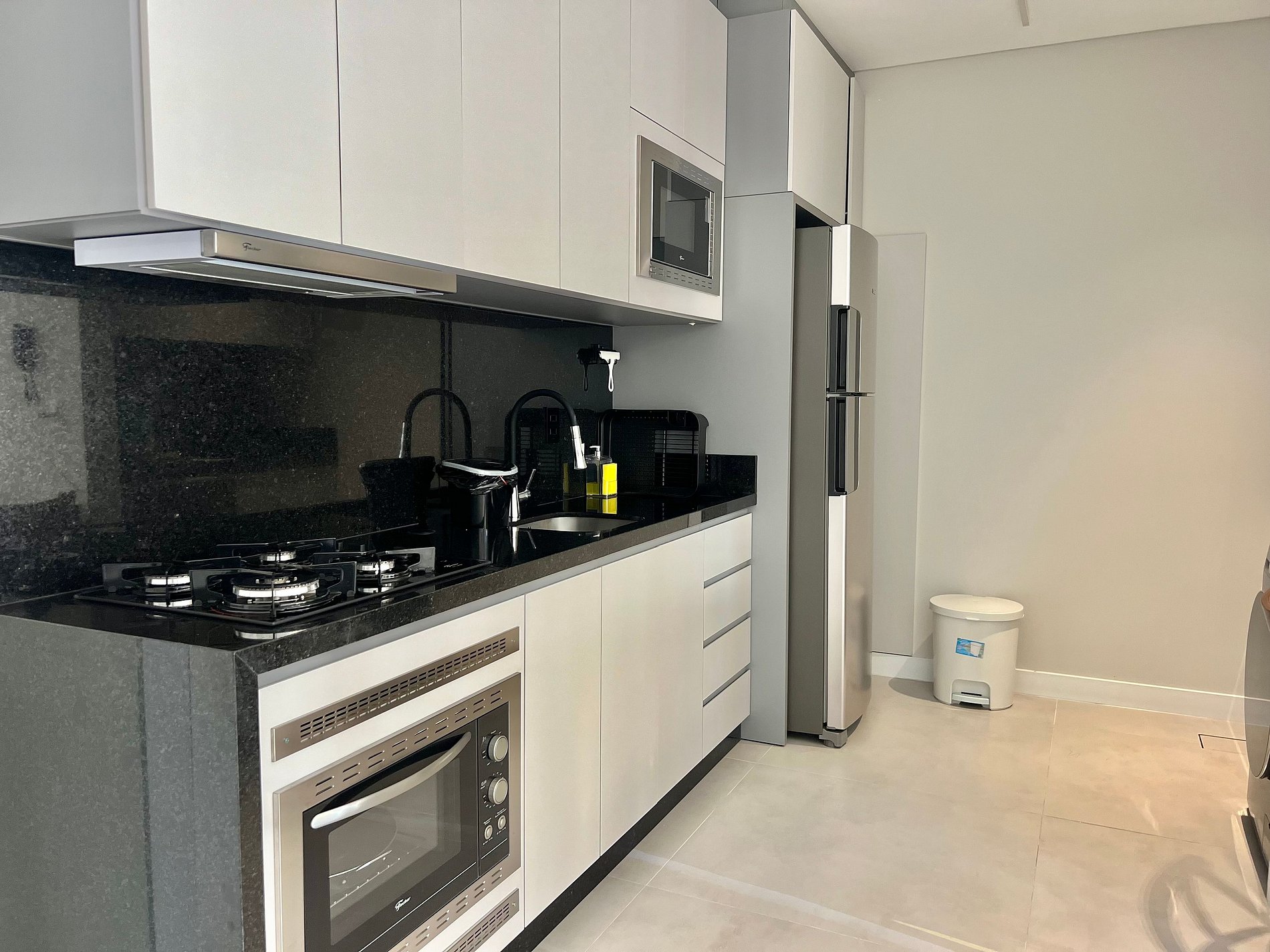 Cozinha: Fogão cooktop, geladeira, cafeteira, liquidificador, micro-ondas e utensílios de cozinha.