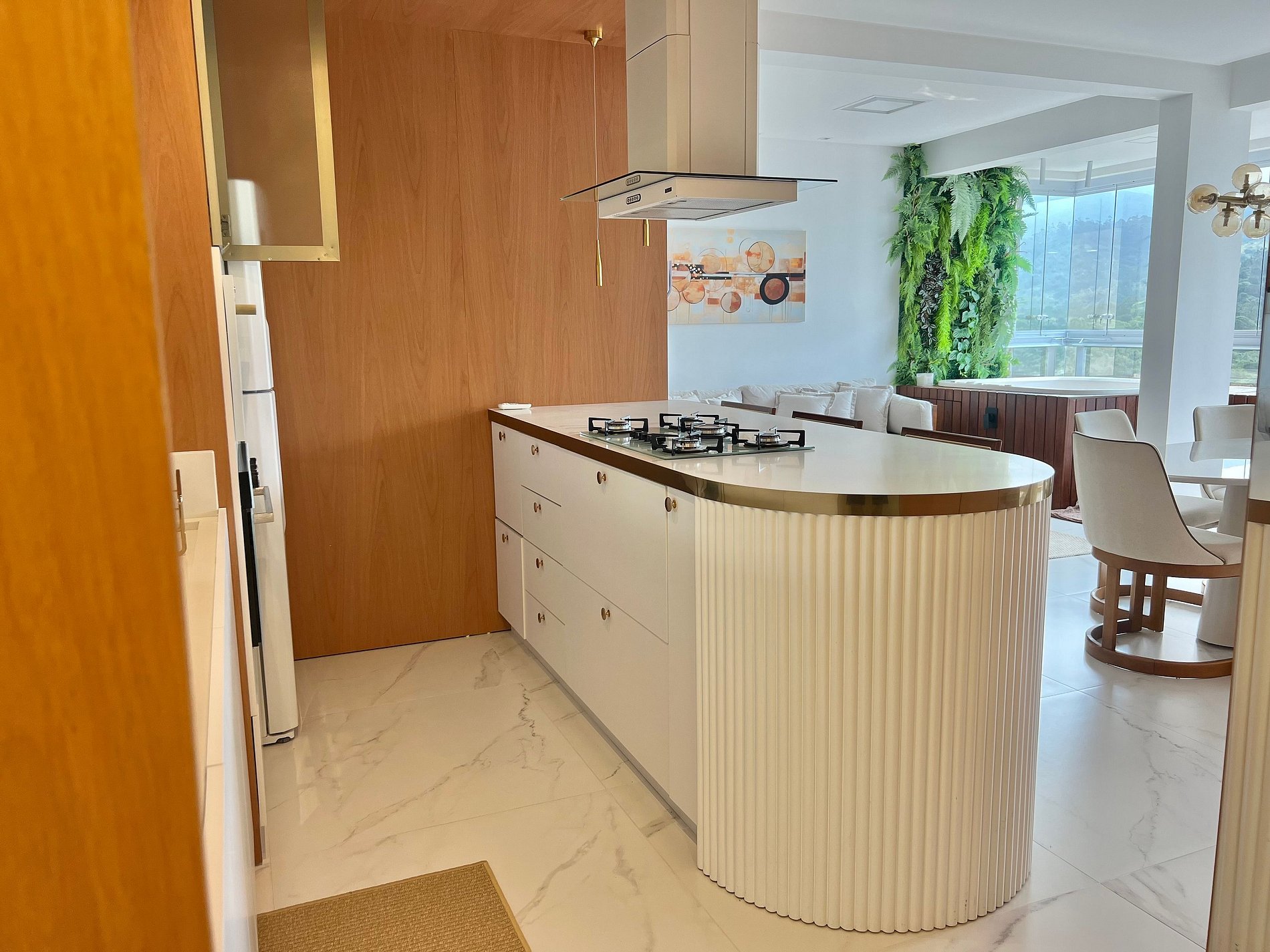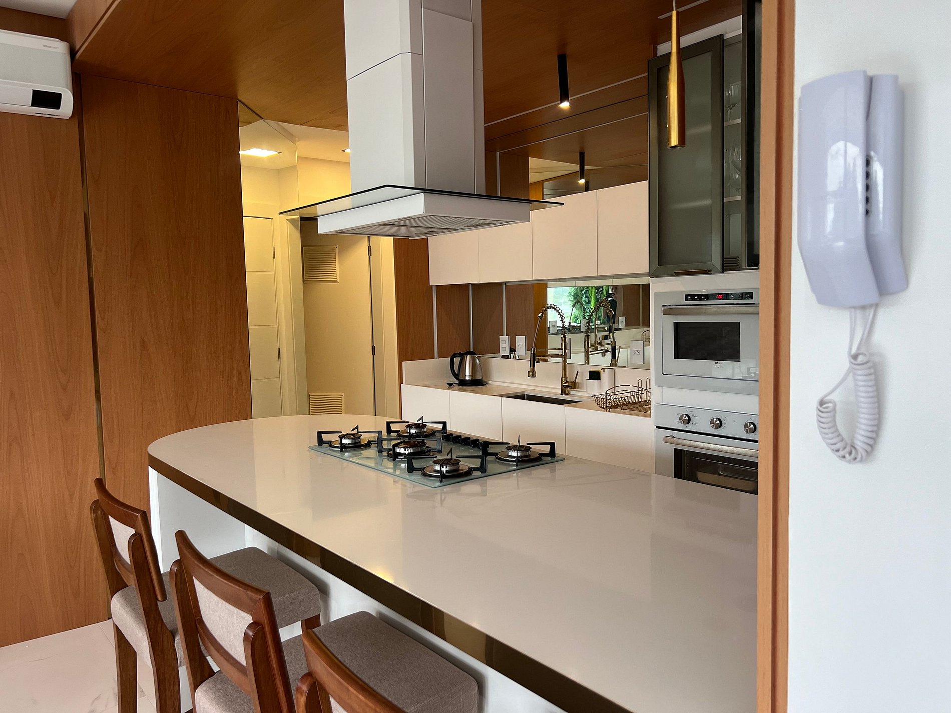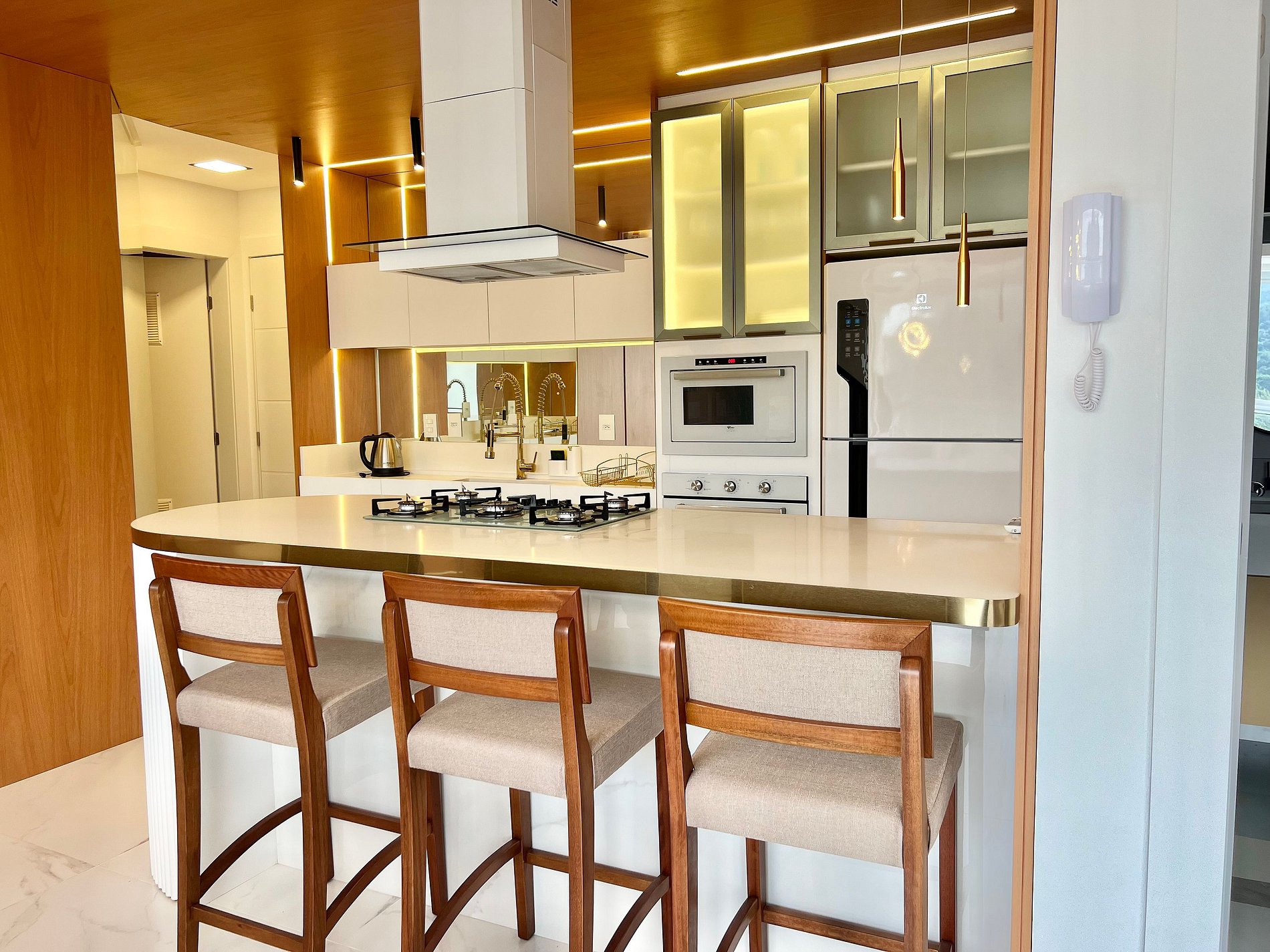 Cozinha: Fogão cooktop, geladeira, liquidificador, micro-ondas e utensílios de cozinha.