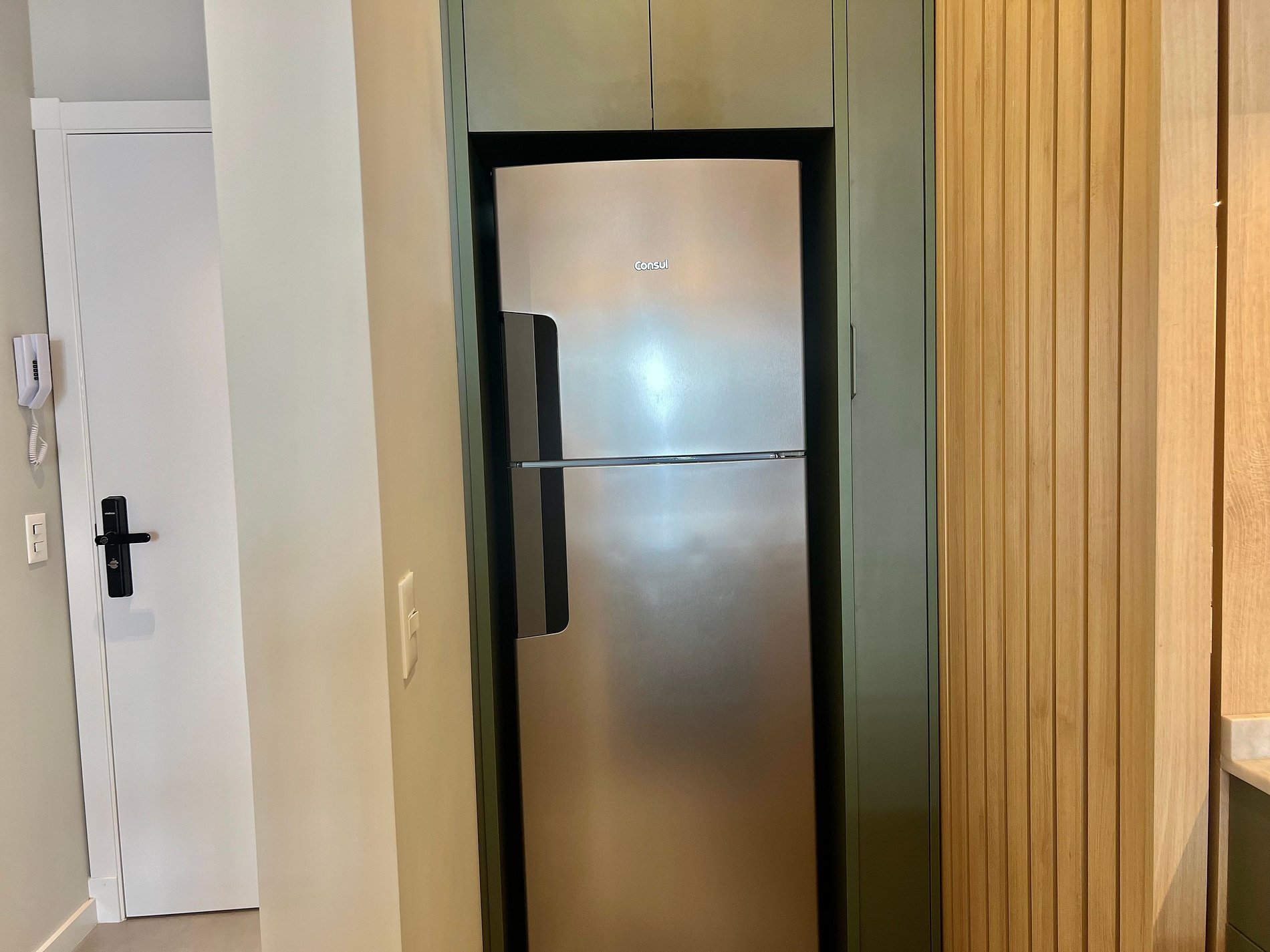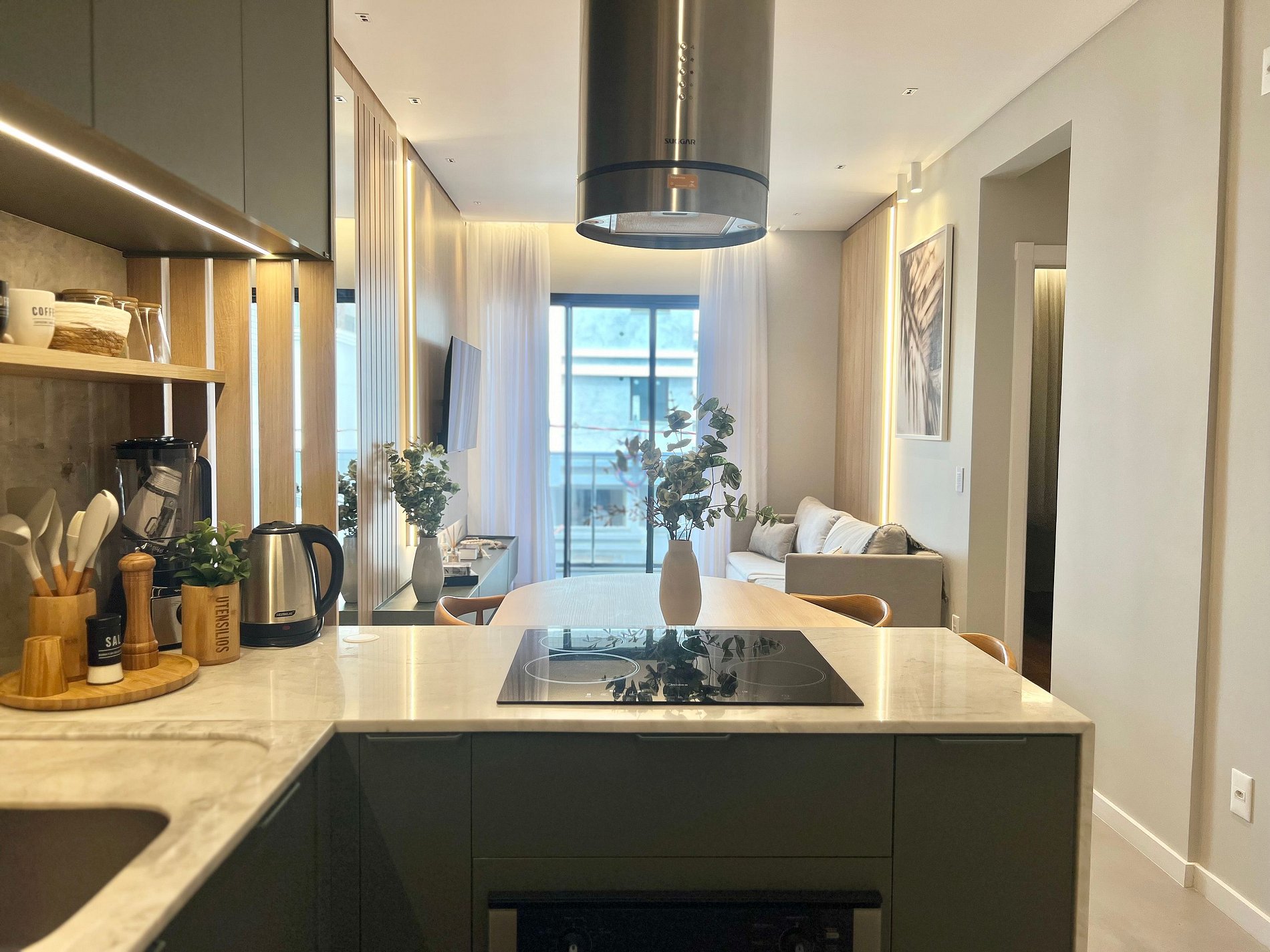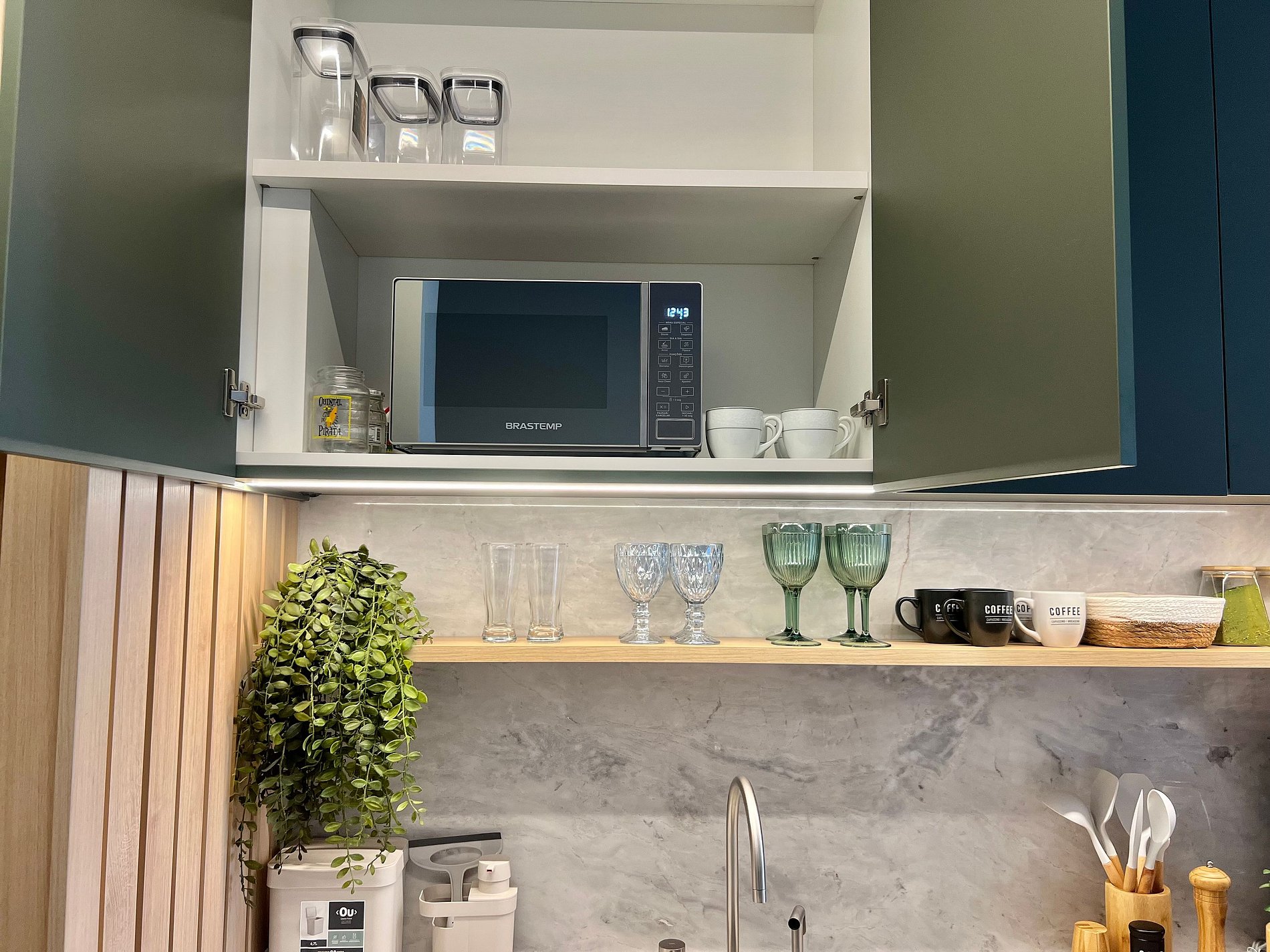 Cozinha: Fogão cooktop, geladeira, micro-ondas e utensílios de cozinha.