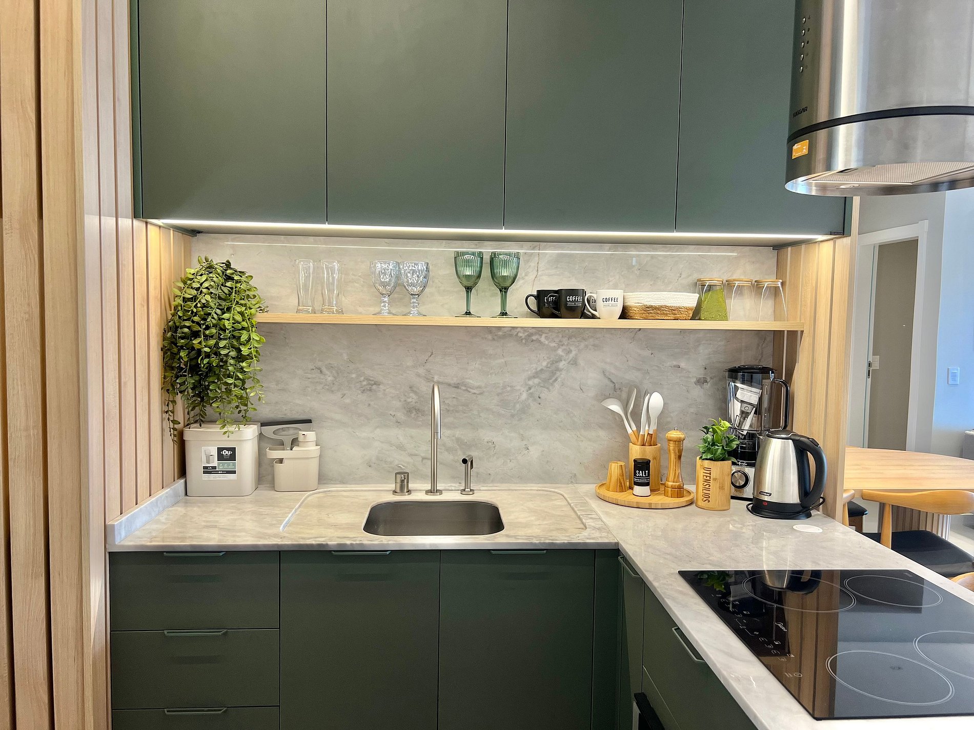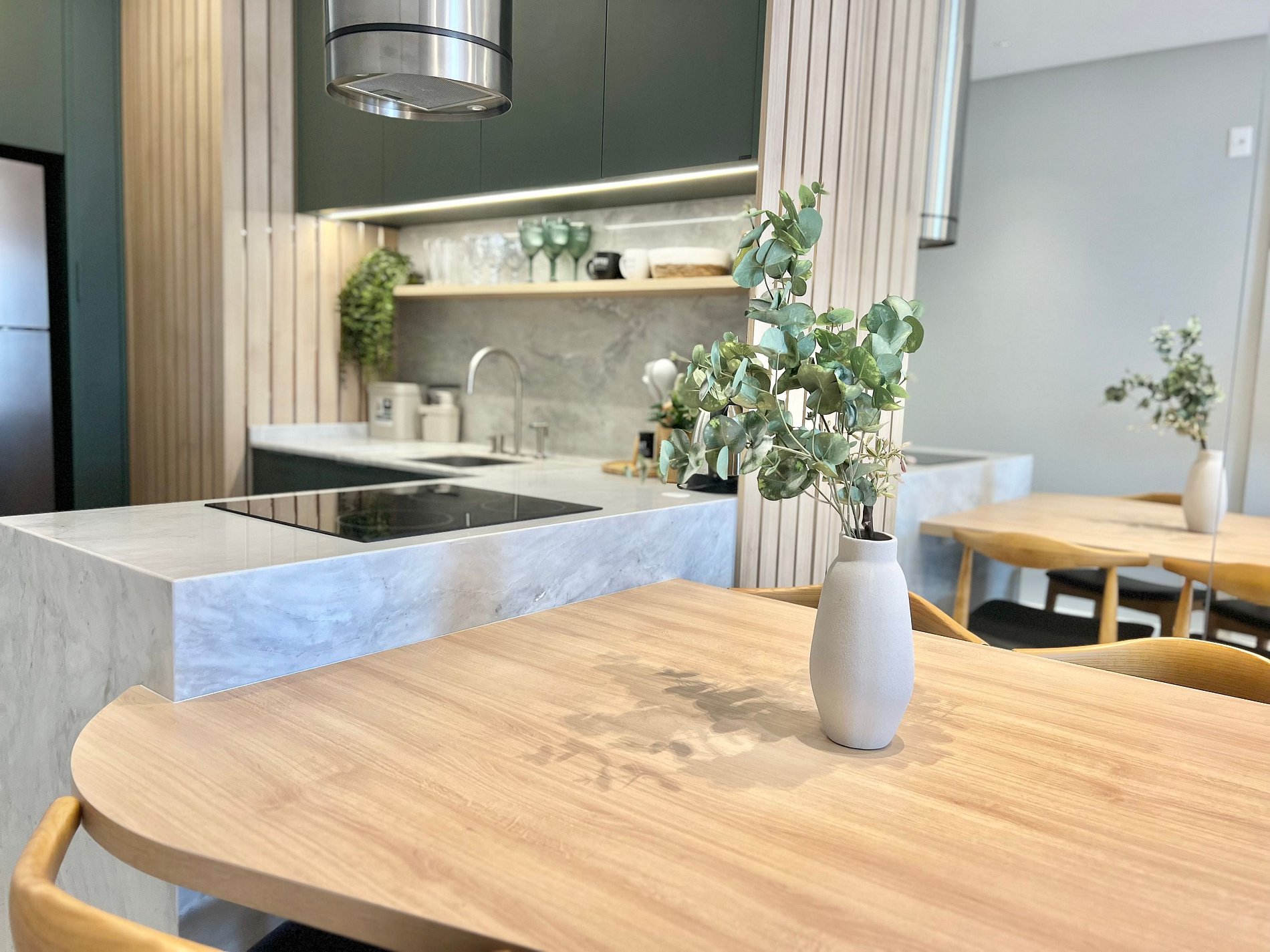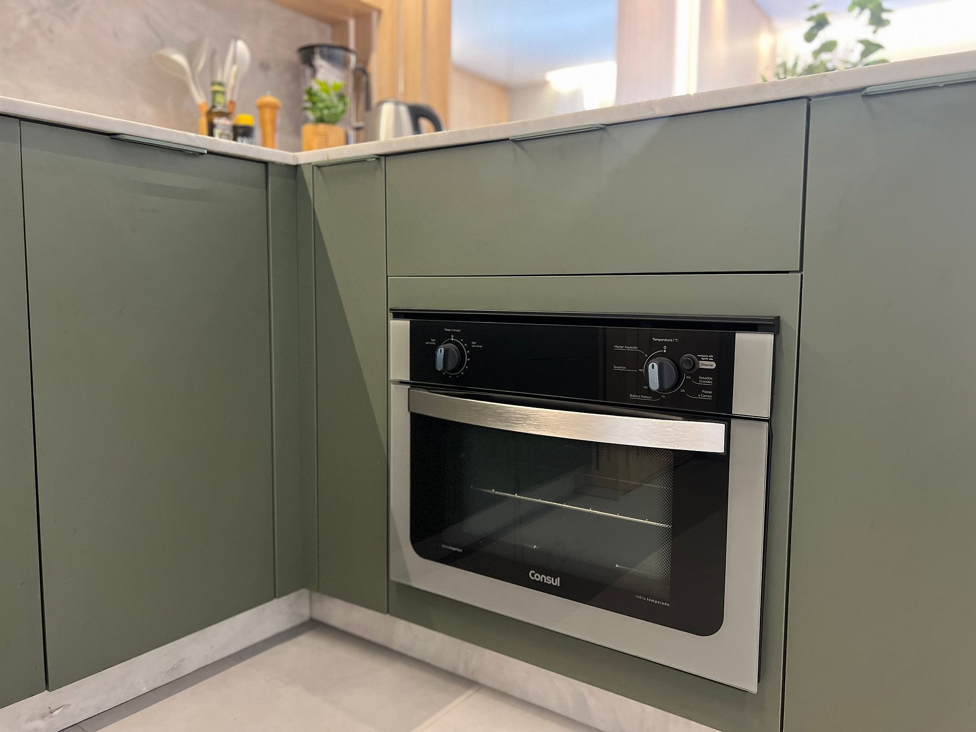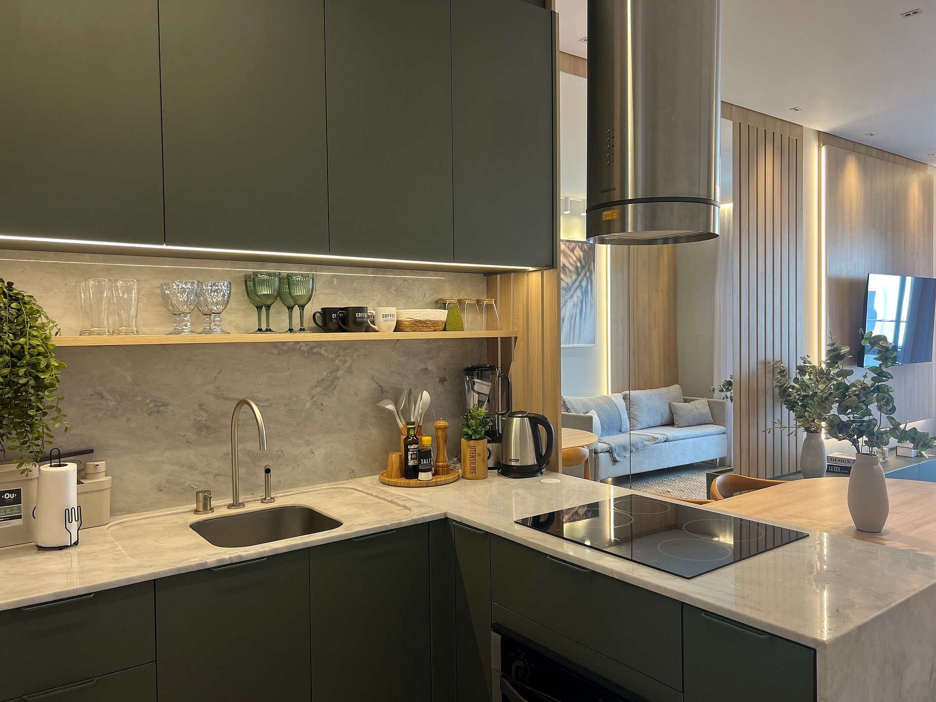 Cozinha: Fogão cooktop, geladeira, micro-ondas e utensílios de cozinha.