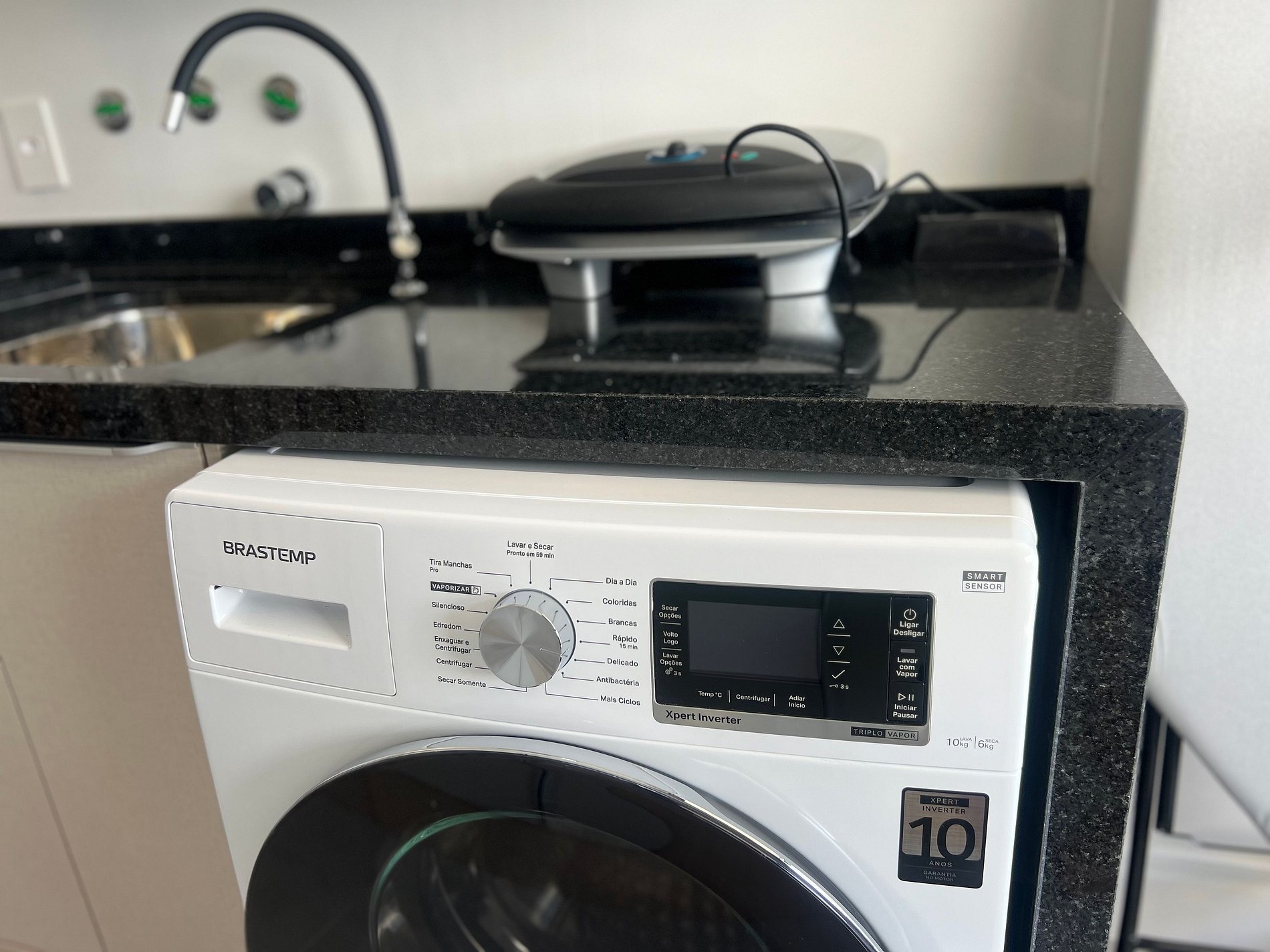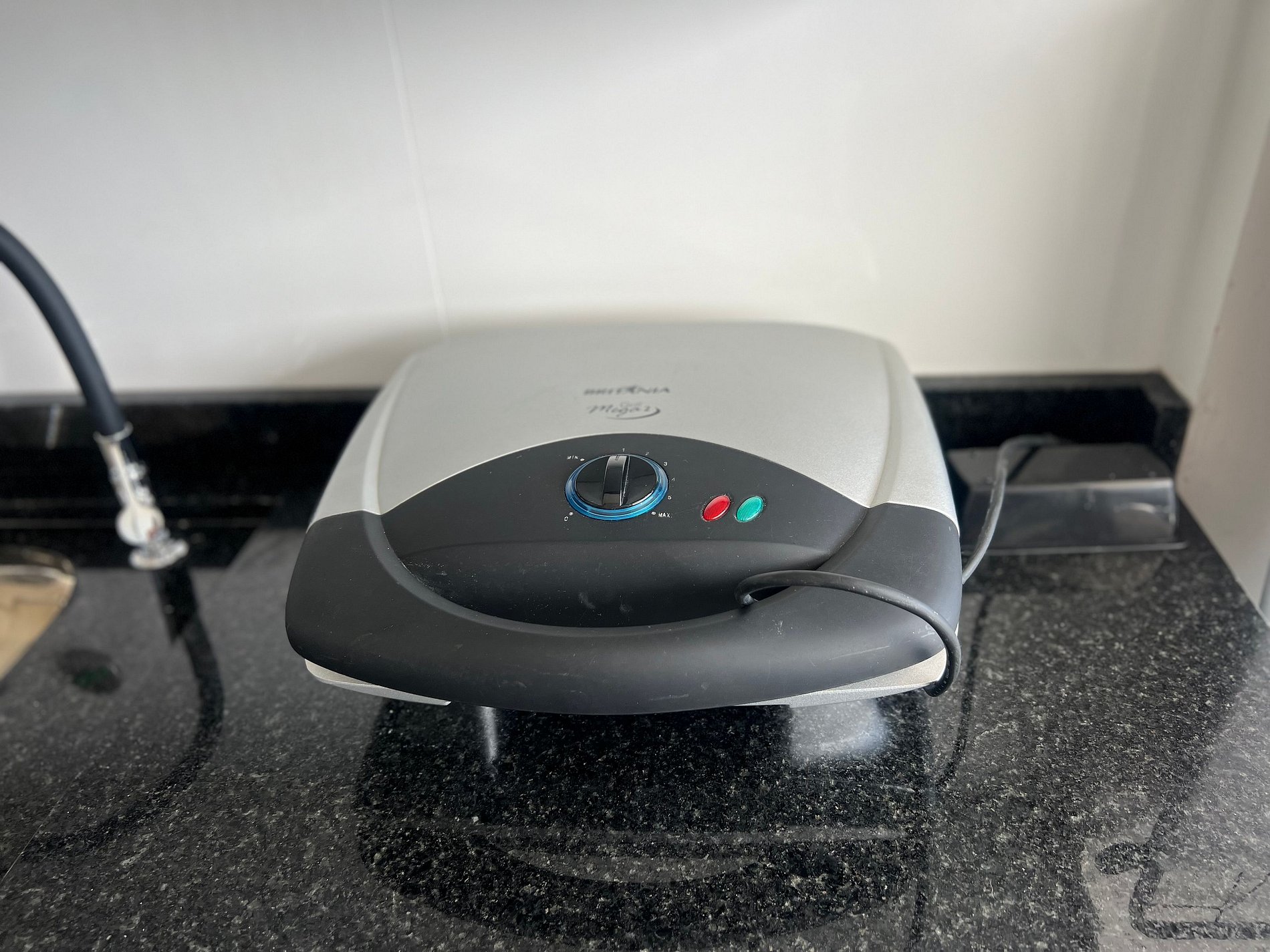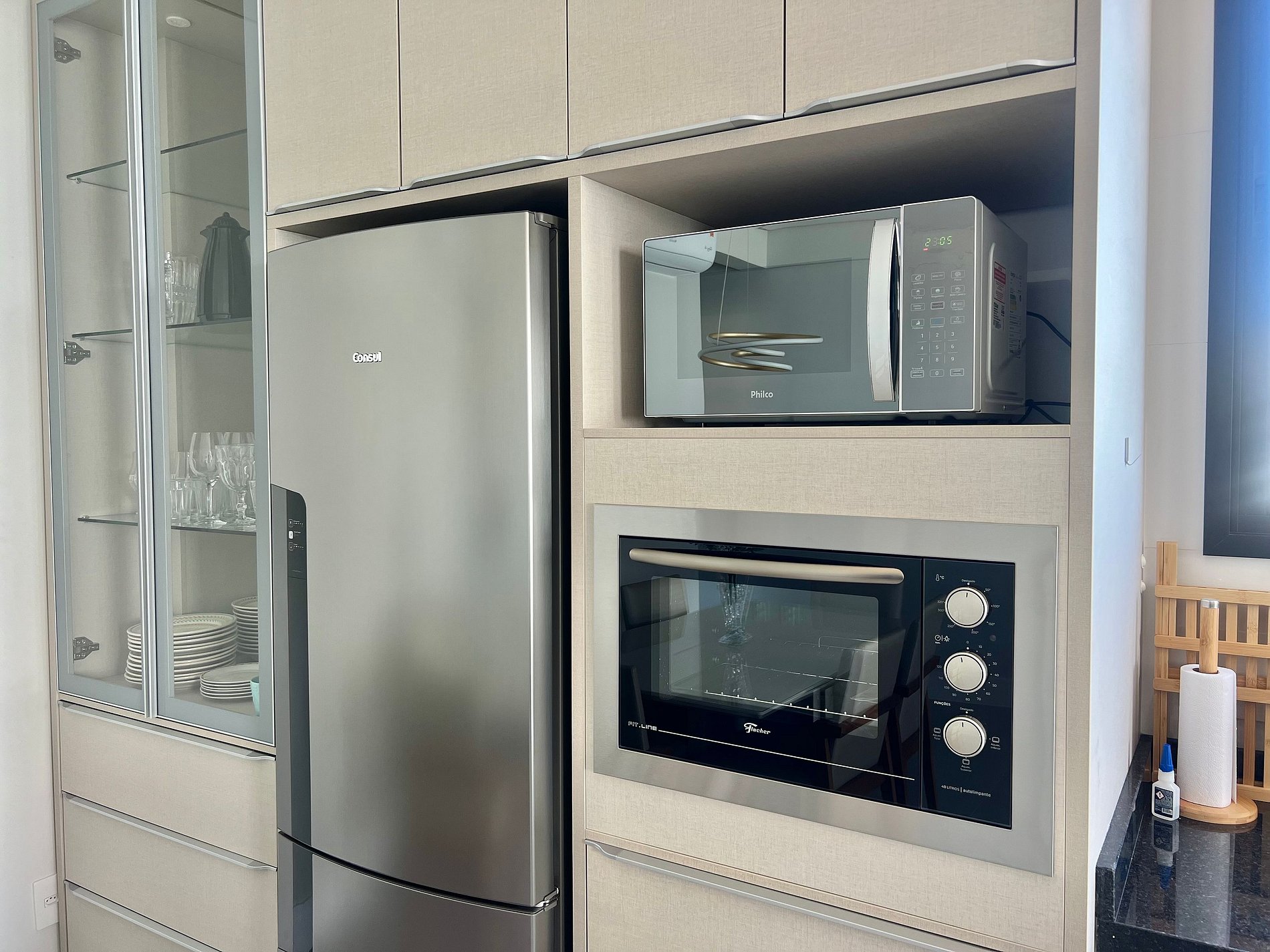 Cozinha: Fogão, forno, geladeira, liquidificador, airfryer, sanduicheira, micro-ondas e utensílios de cozinha.
