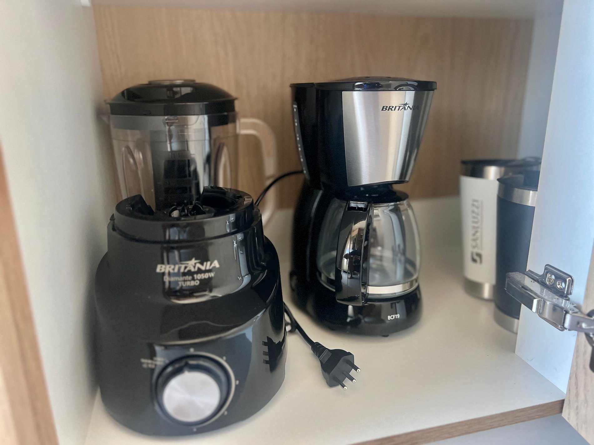 Geladeira, cafeteira, liquidificador, micro-ondas e utensílios básicos de cozinha.