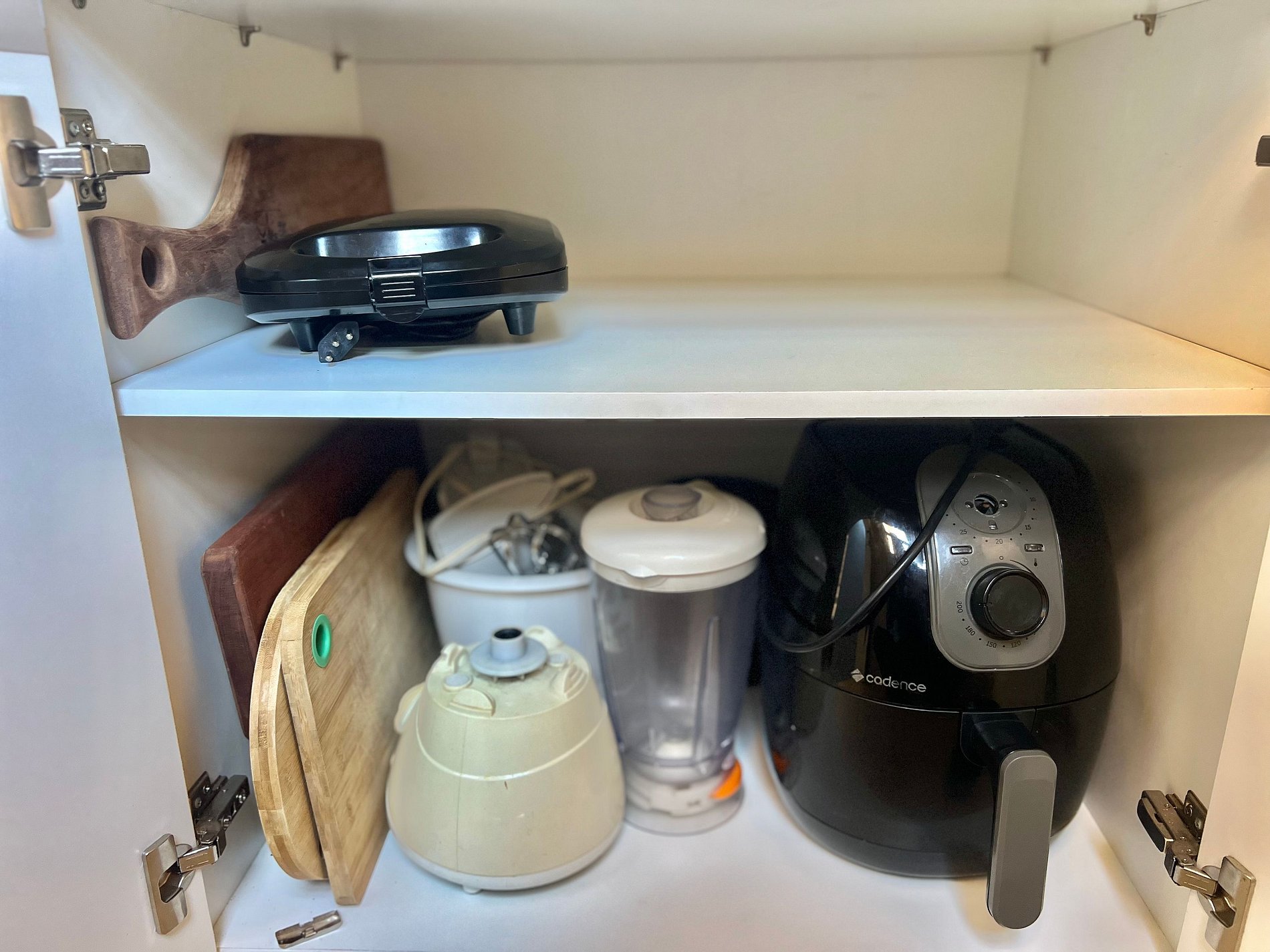 Cozinha: Fogão cooktop, geladeira, cafeteira, liquidificador, micro-ondas e utensílios de cozinha.