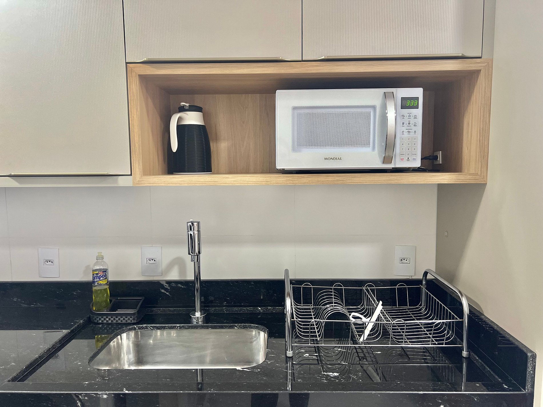 Cozinha: fogão, geladeira, micro-ondas e utensílios de cozinha.
