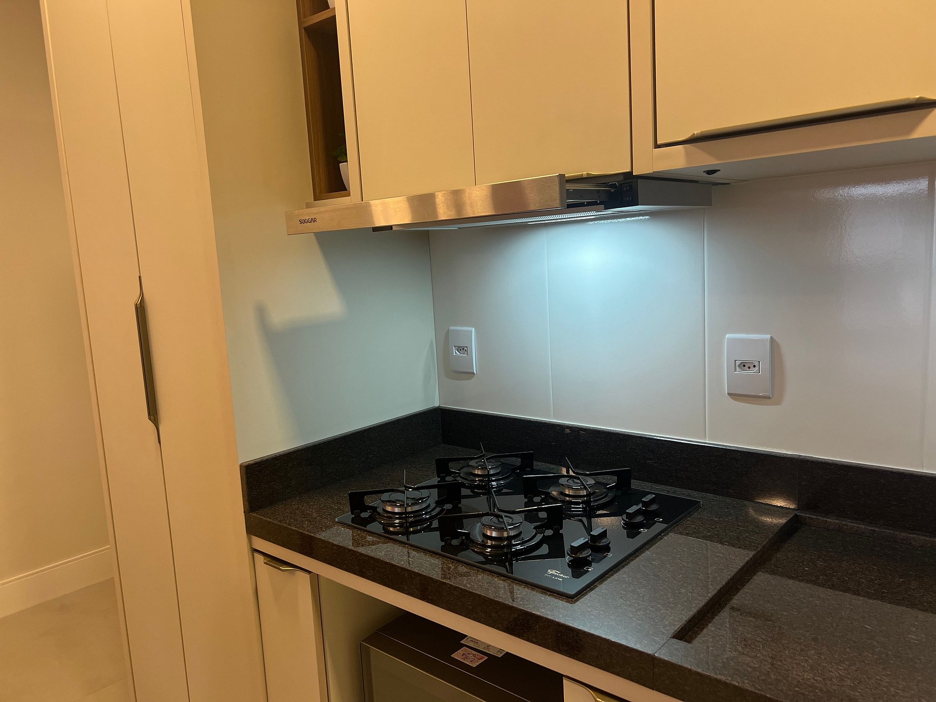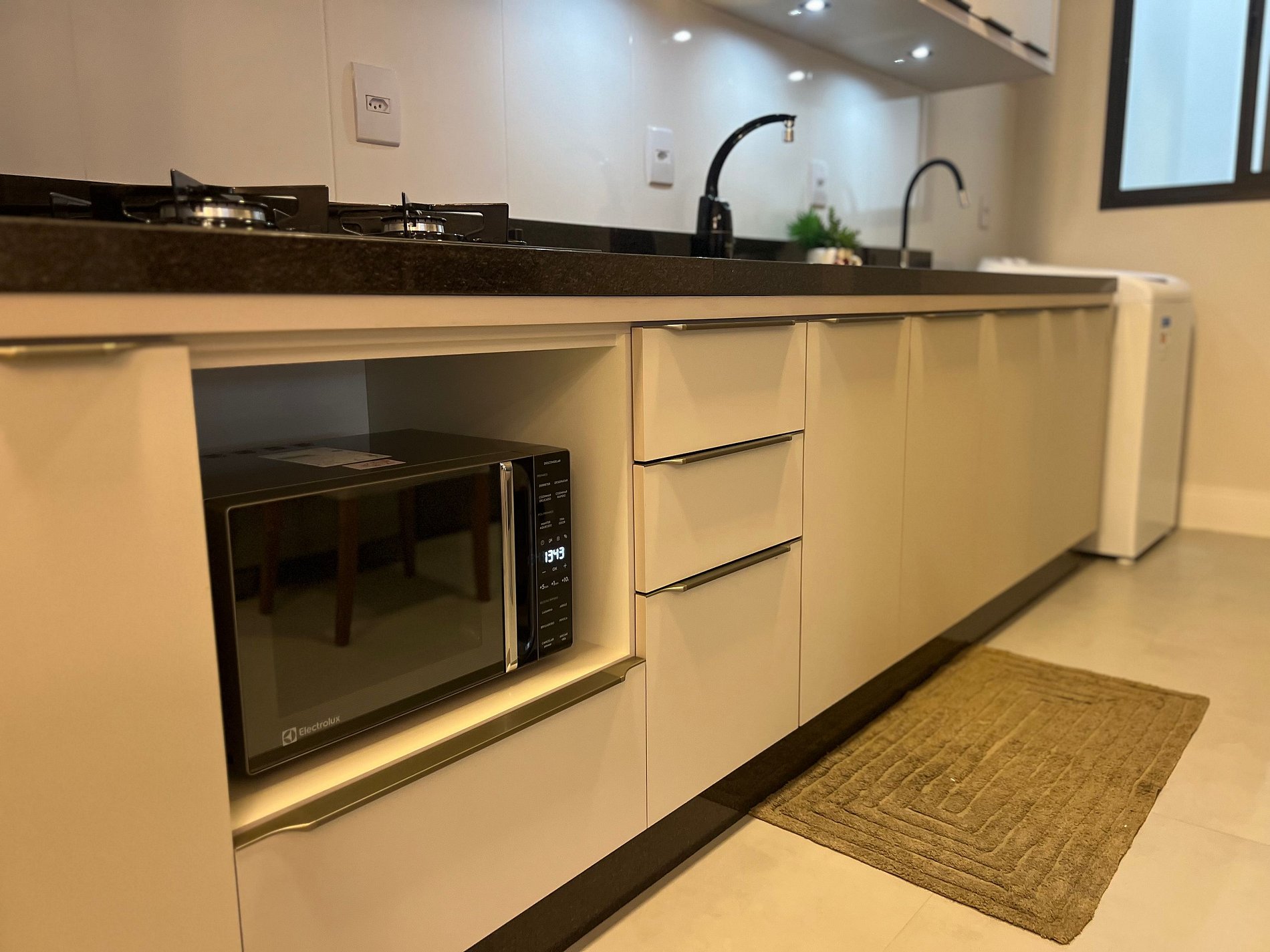 Cozinha: Fogão cooktop, geladeira, liquidificador, micro-ondas e utensílios de cozinha. (não possui forno)