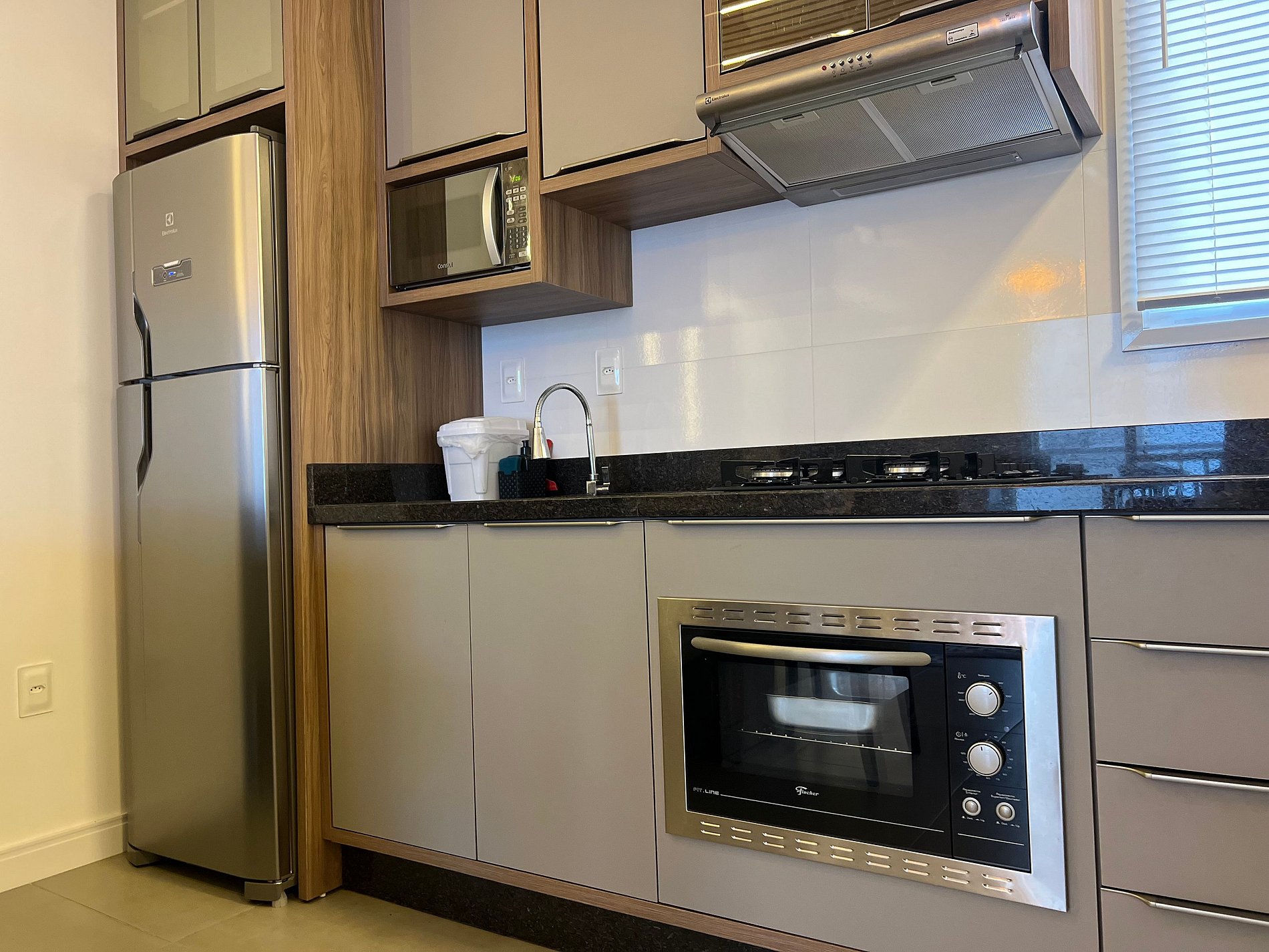 Cozinha: Fogão cooktop, geladeira, liquidificador, micro-ondas e utensílios de cozinha.