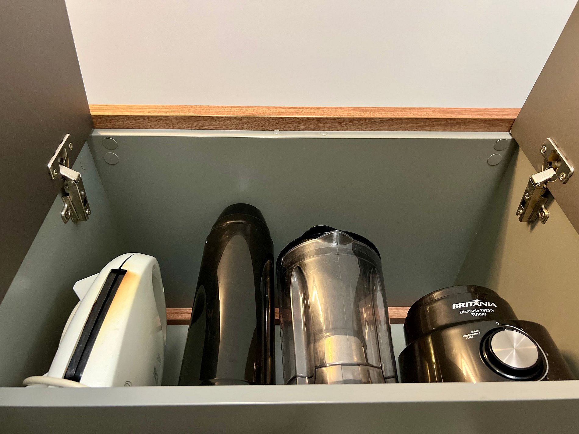 Cozinha: Fogão, forno, geladeira, liquidificador, micro-ondas, airfryer e utensílios de cozinha.