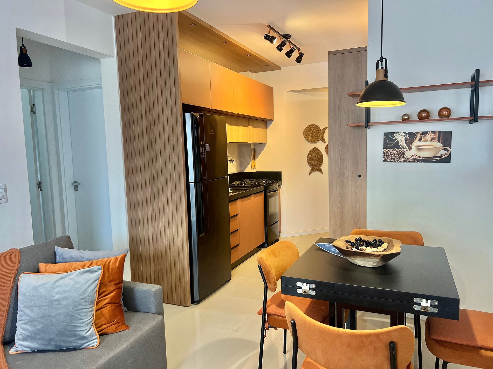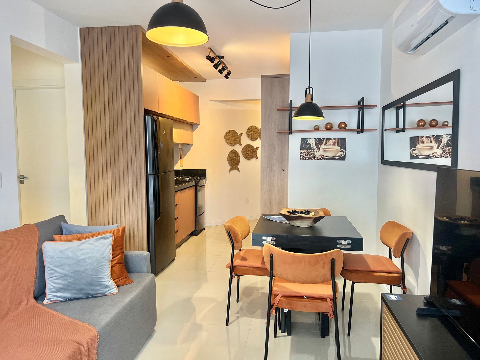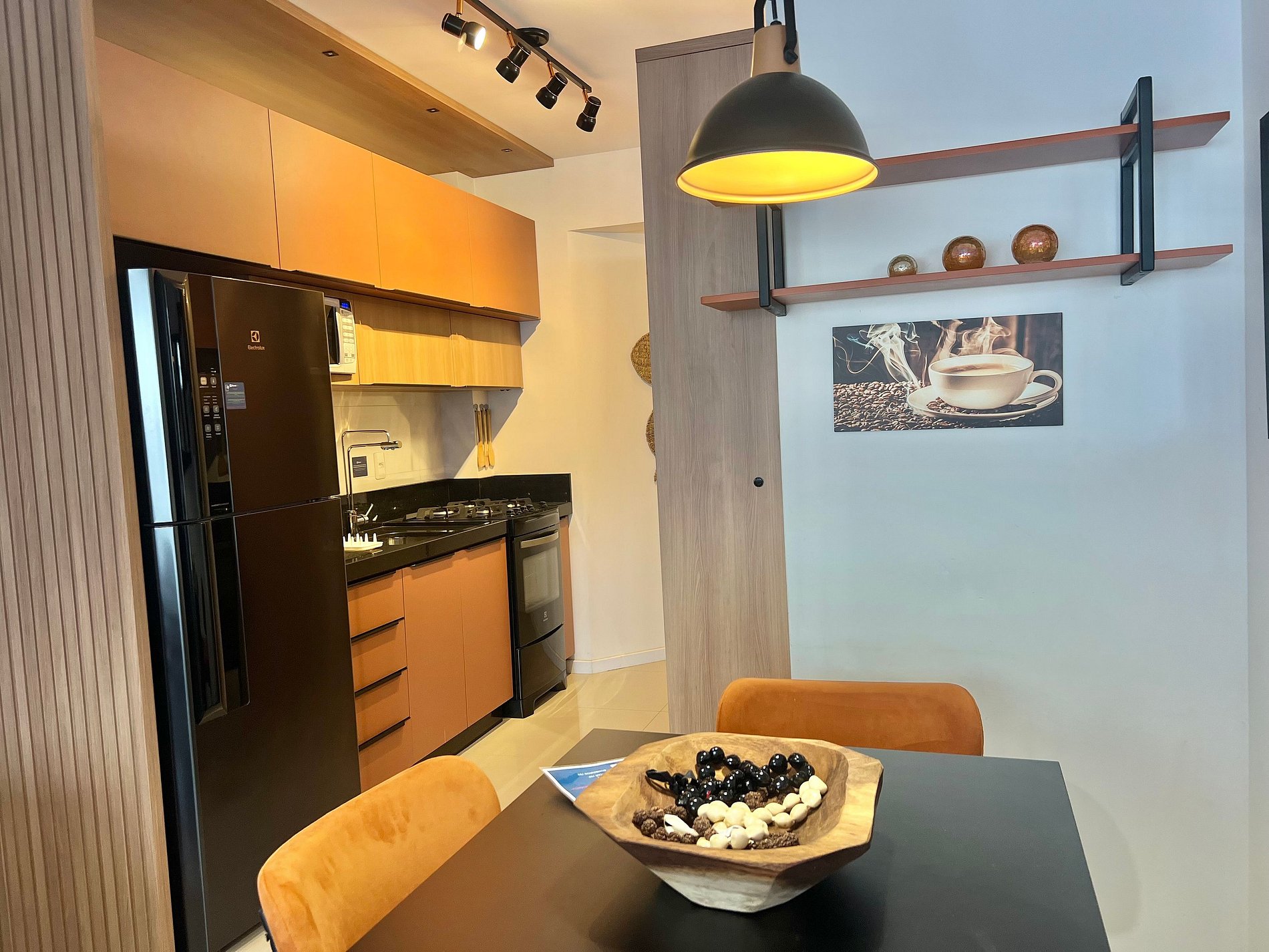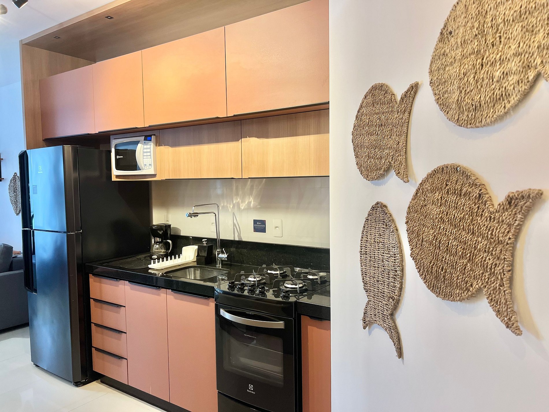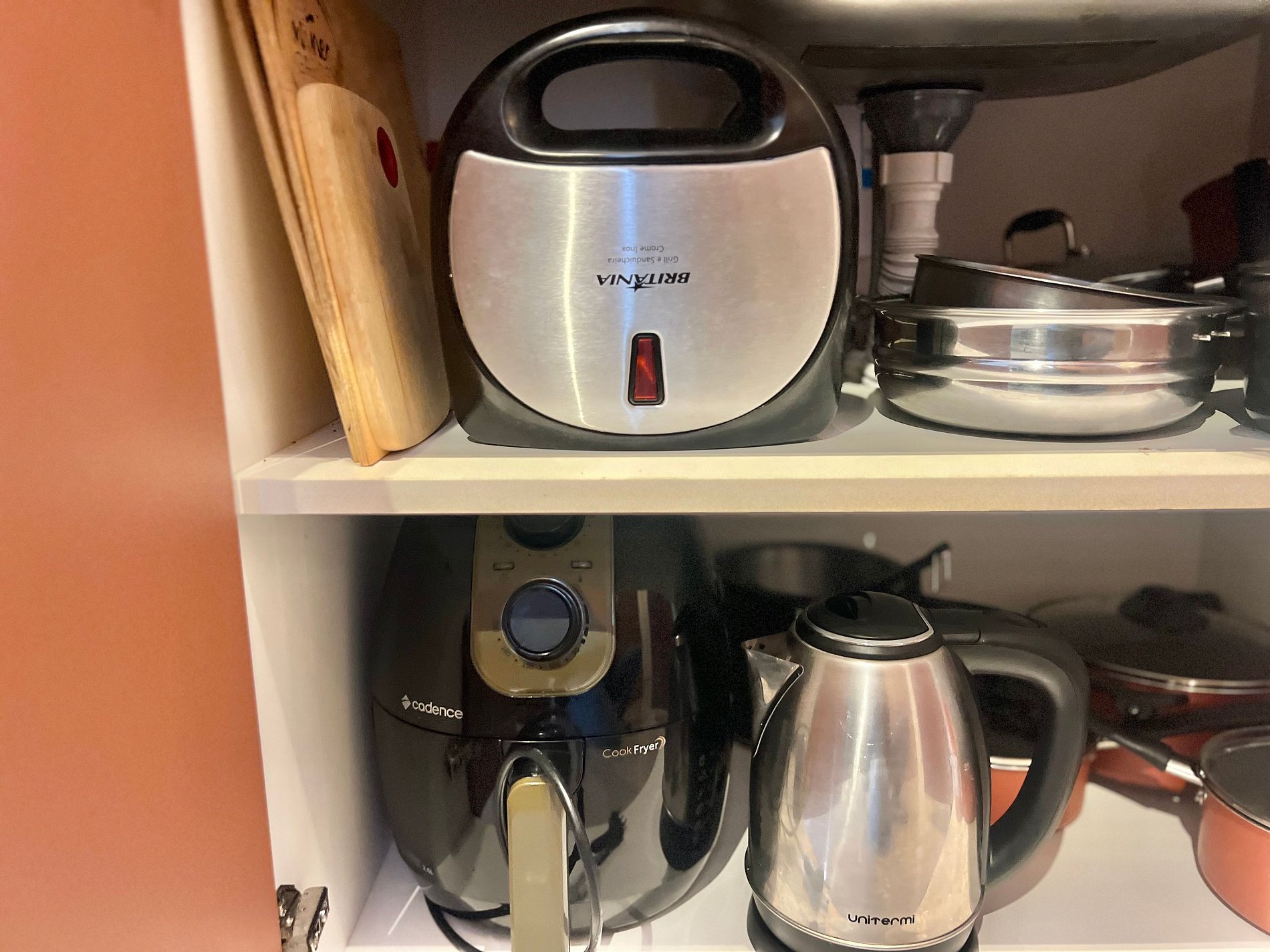 Geladeira, chaleira elétrica, sanduicheira, liquidificador, airfryer, cafeteira, micro-ondas, torneira com filtro e utensílios básicos de cozinha.