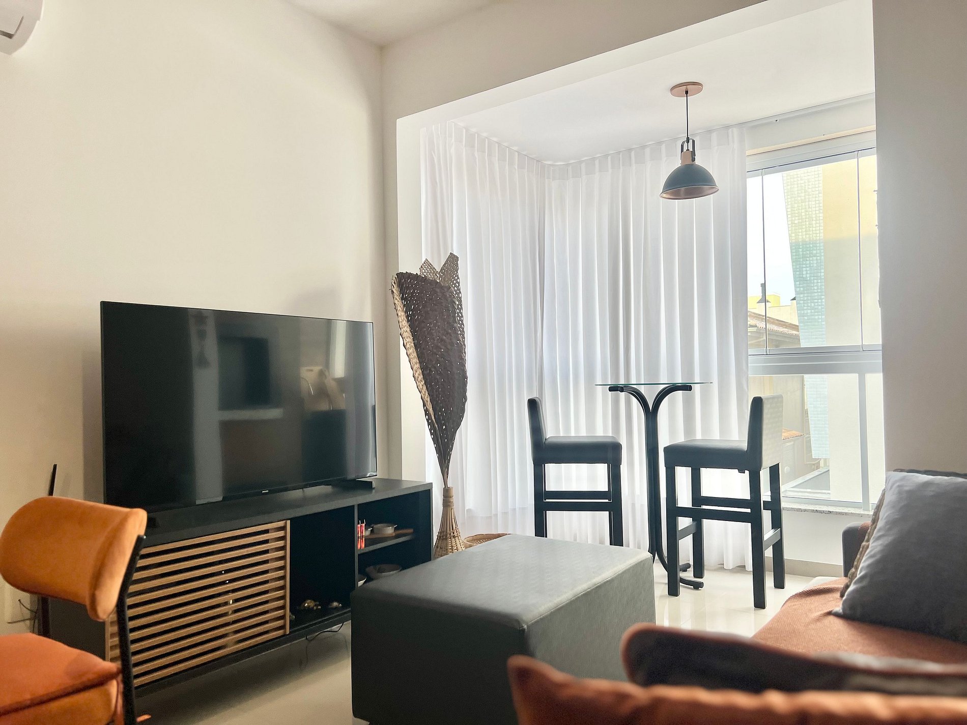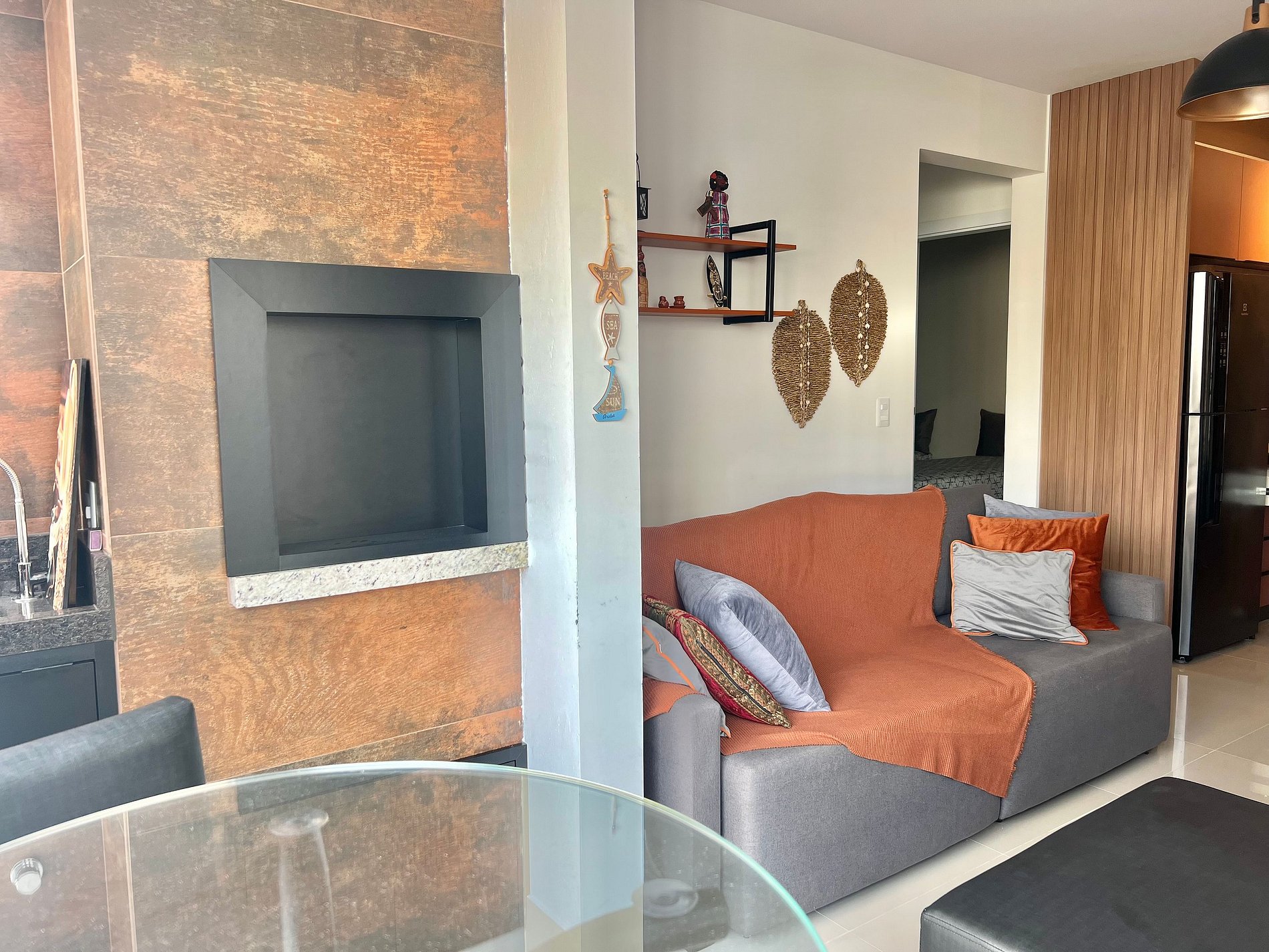 Lindo apartamento na Praia de Palmas, com dois quartos, sendo uma suíte, ar-condicionado em todos os ambientes e uma vaga de garagem.