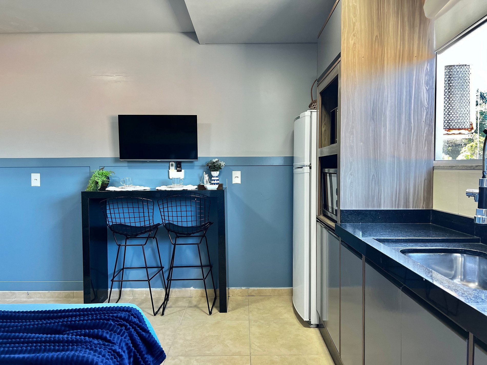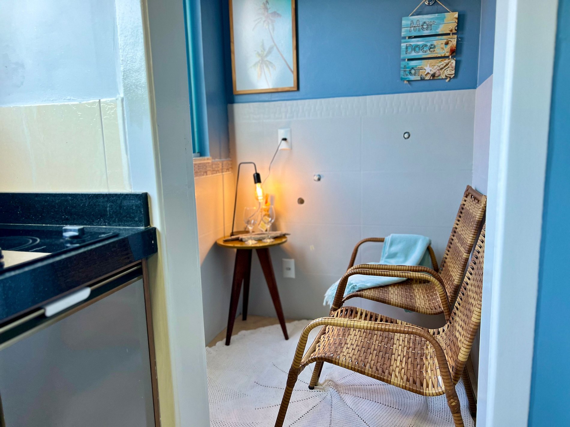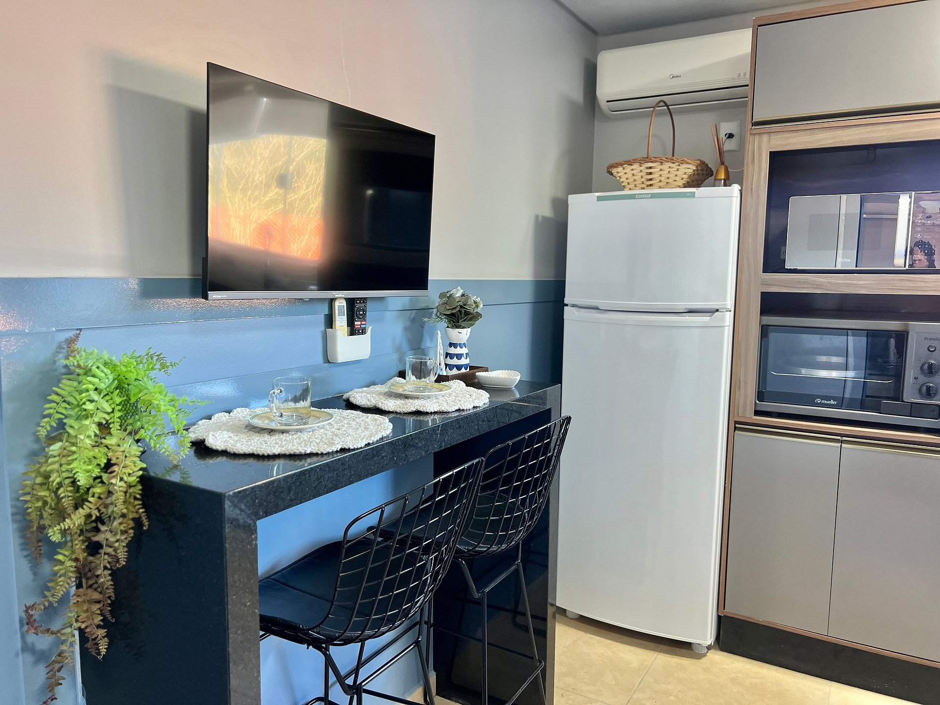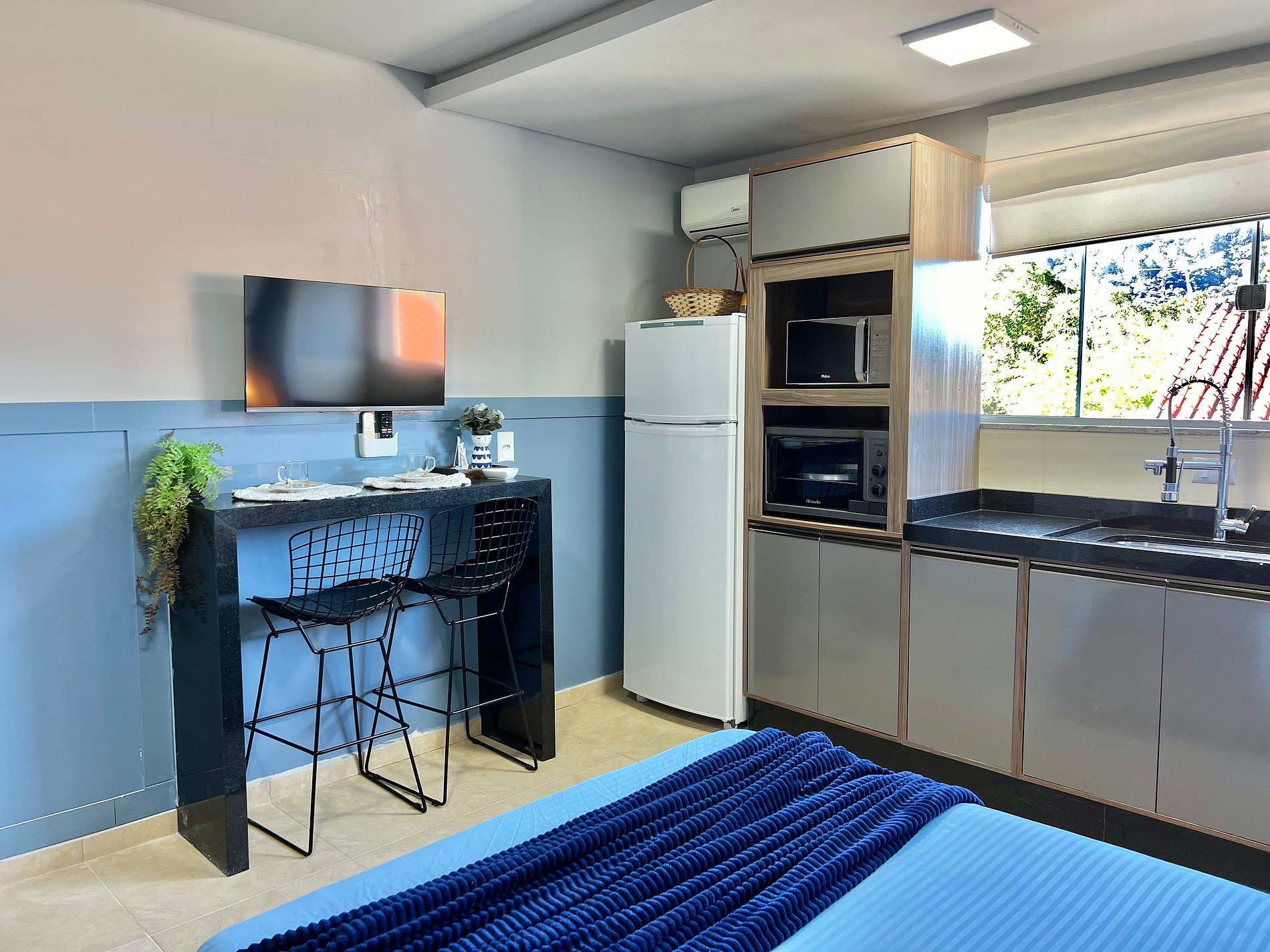 Na acomodação você irá encontrar: Cama casal e ar-condicionado. Cozinha: Fogão cooktop, geladeira, microondas, cafeteira, forno, utensílios de cozinha, Smart Tv, Internet Wifi.