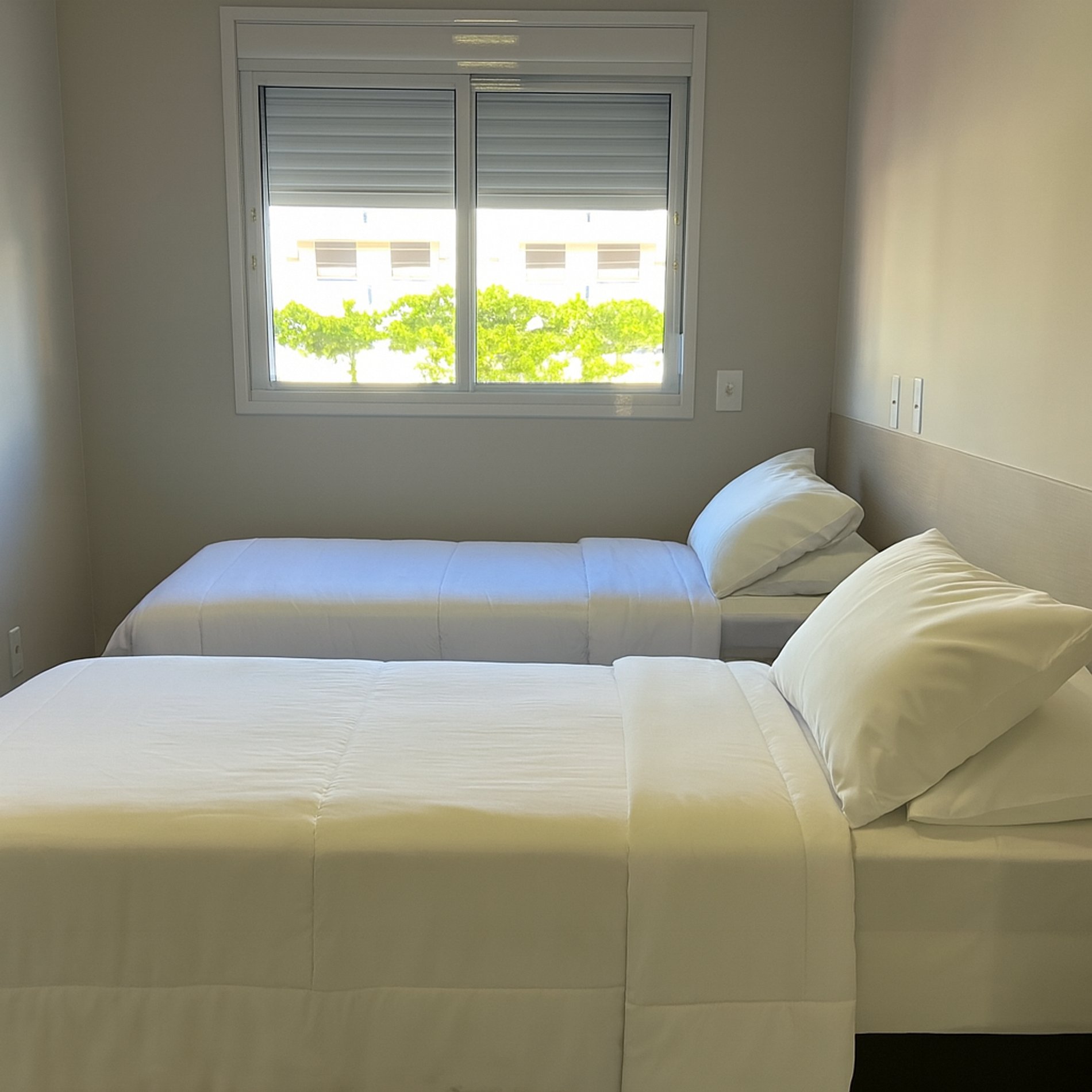 2 Camas Queen, 2 camas de solteiro, 1 sofá cama, ar-condicionado na sala e quartos, Smart TV na sala.