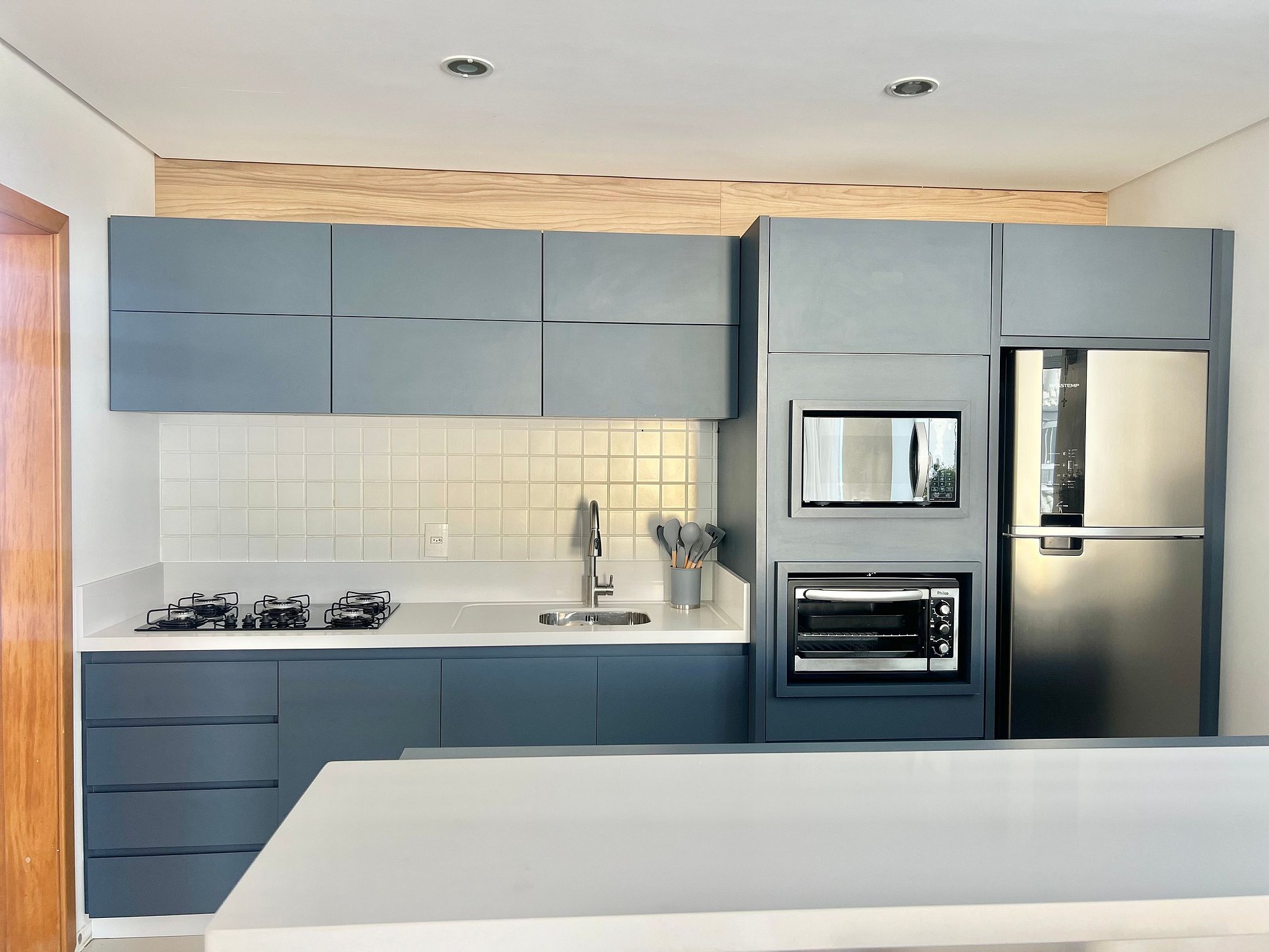 Cozinha: Fogão cooktop, geladeira, cafeteira, sanduicheira, air fryer, chaleira elétrica, liquidificador, micro-ondas, frigobar, adega climatizada e utensílios de cozinha.