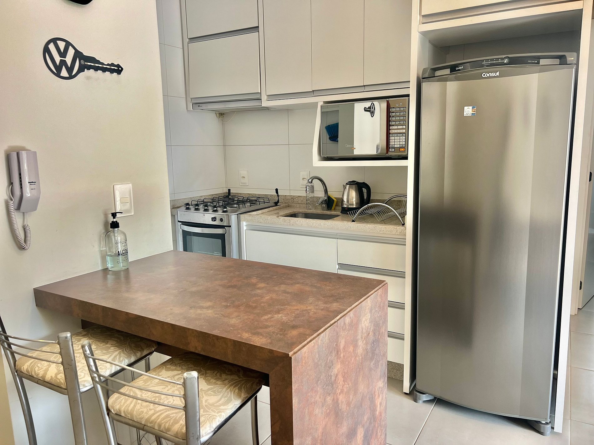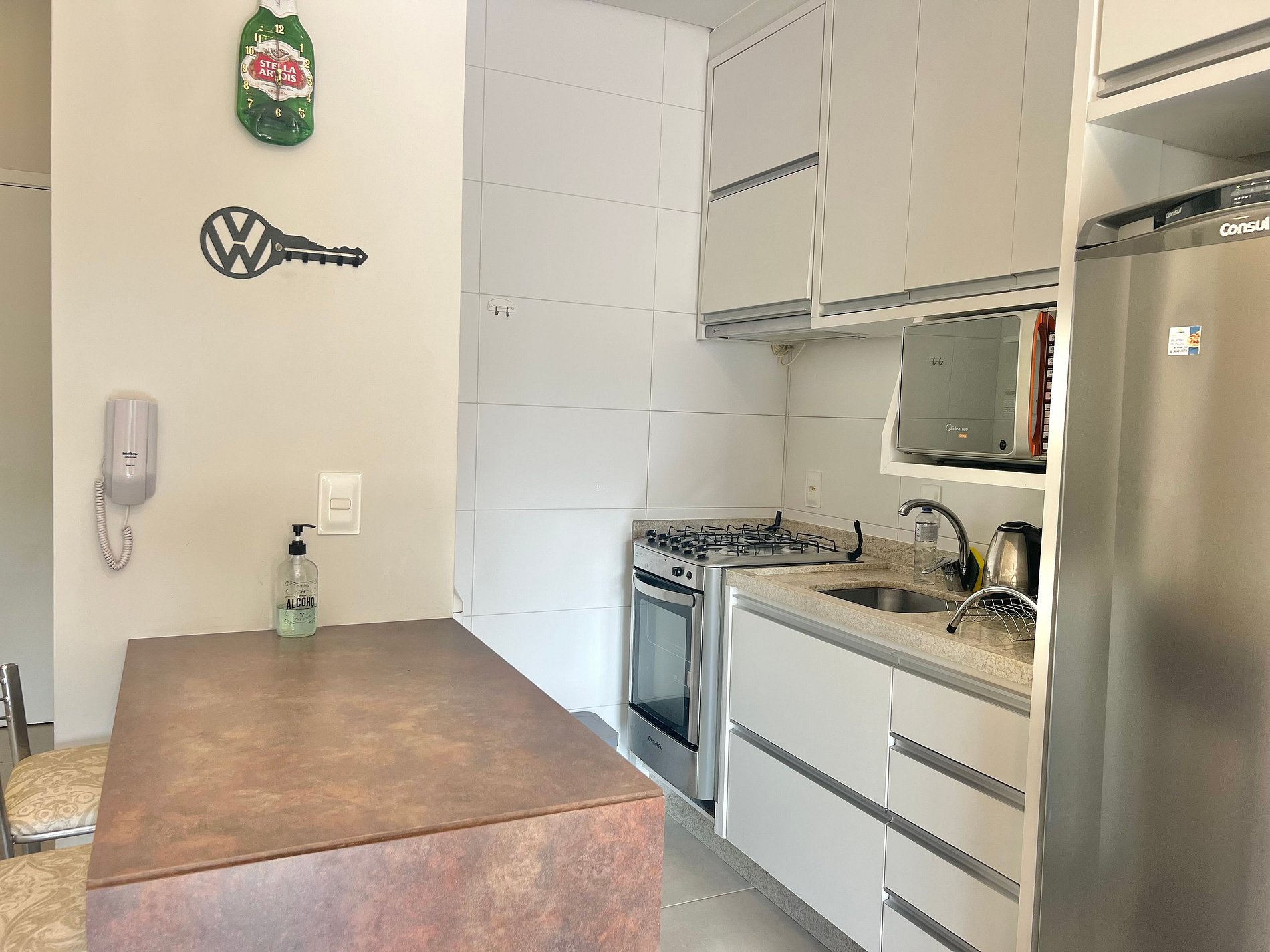 Cozinha: Fogão, forno, geladeira, cafeteira, liquidificador, micro-ondas e utensílios de cozinha.
