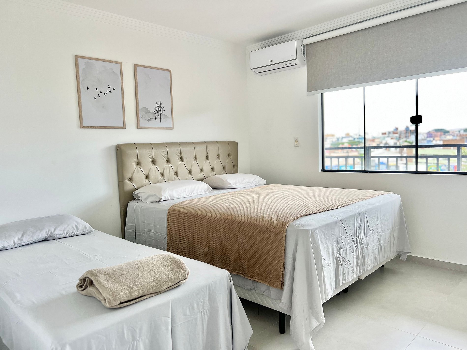 1 cama de casal, 1 cama queen e 2 camas de solteiro, ar-condicionado.