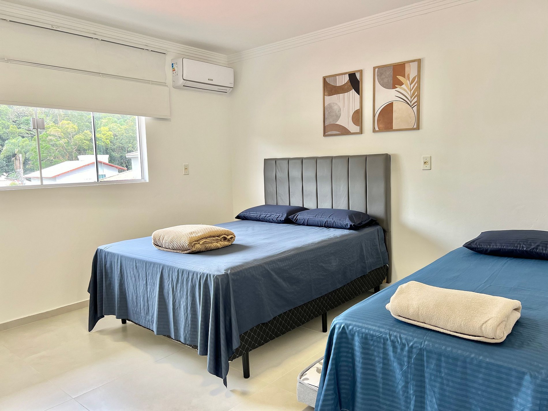 1 cama de casal, 1 cama queen e 2 camas de solteiro, ar-condicionado.