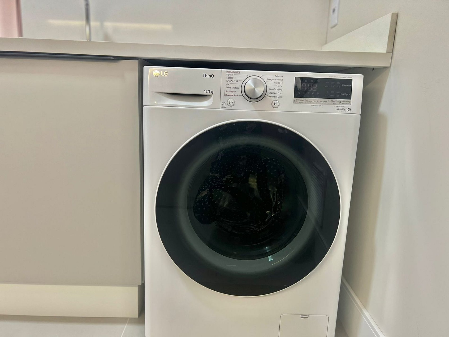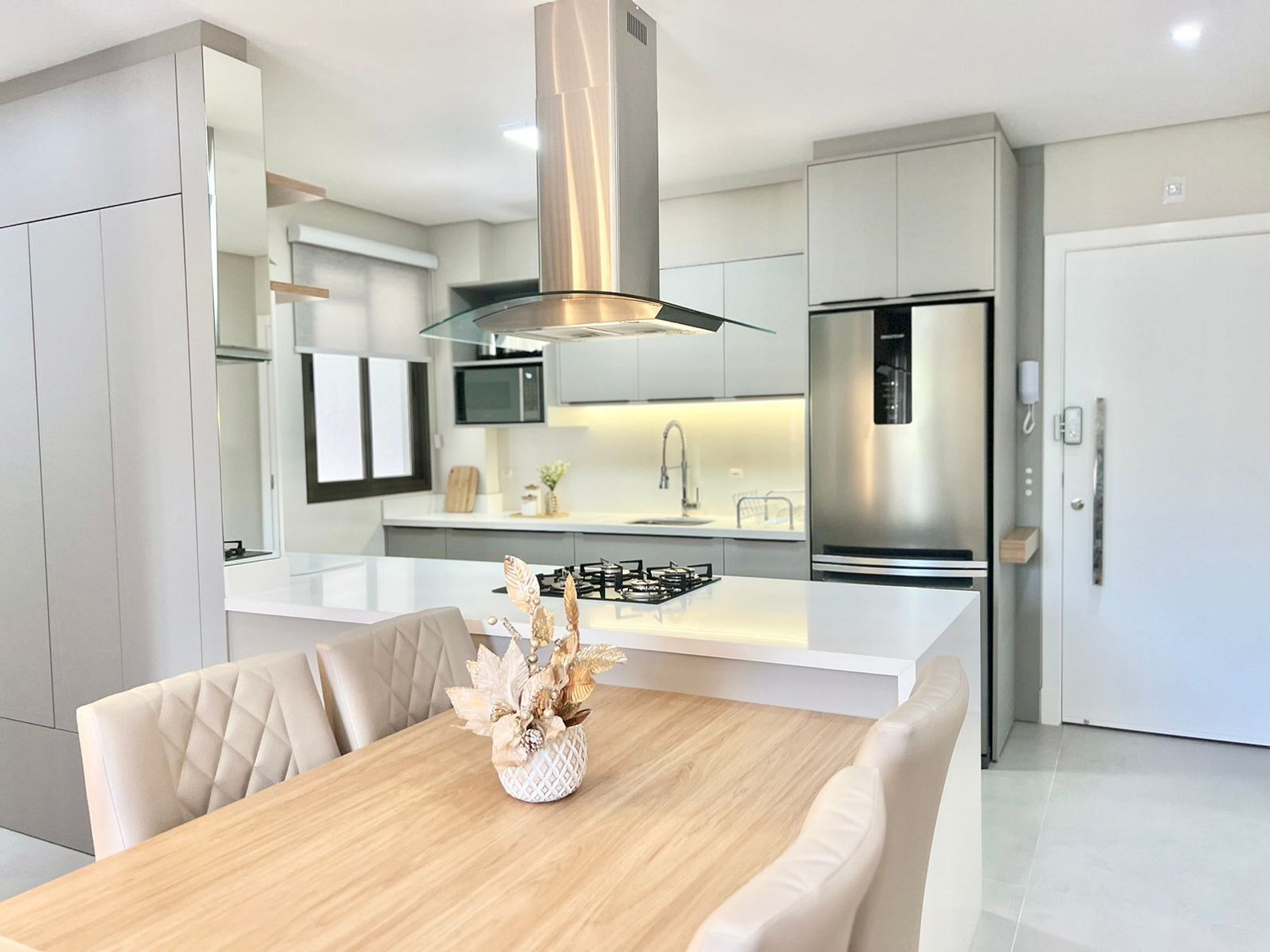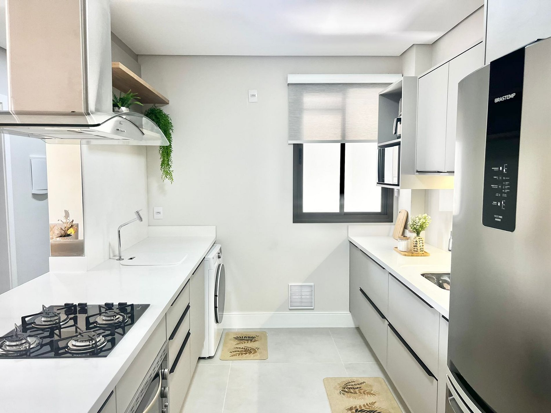 Cozinha: Fogão cooktop, airfryer, geladeira, cafeteira, liquidificador, micro-ondas e utensílios de cozinha.