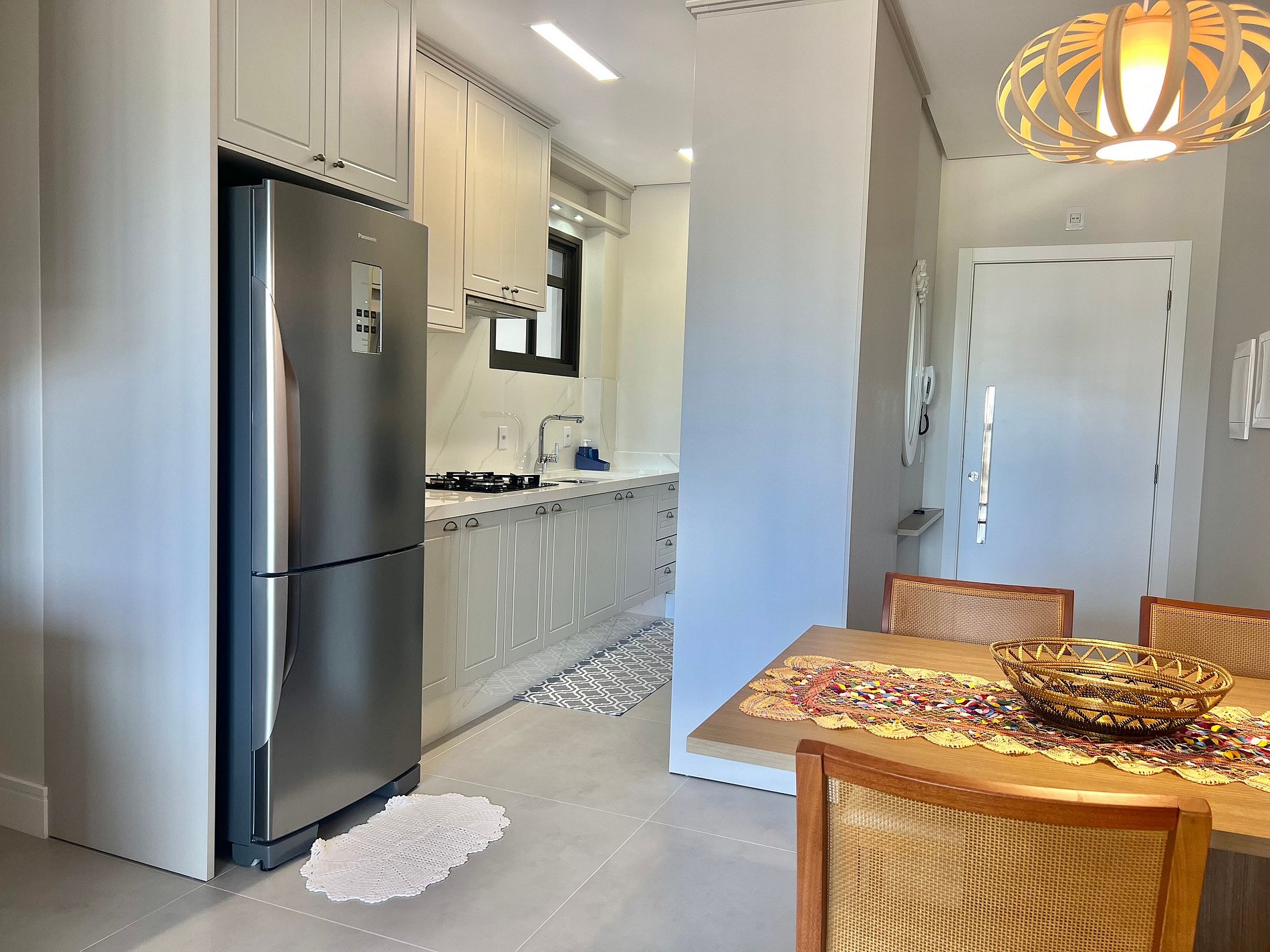 Cozinha: Fogão cooktop, geladeira, cafeteira, forno, micro-ondas, Cervejeira e utensílios de cozinha.
