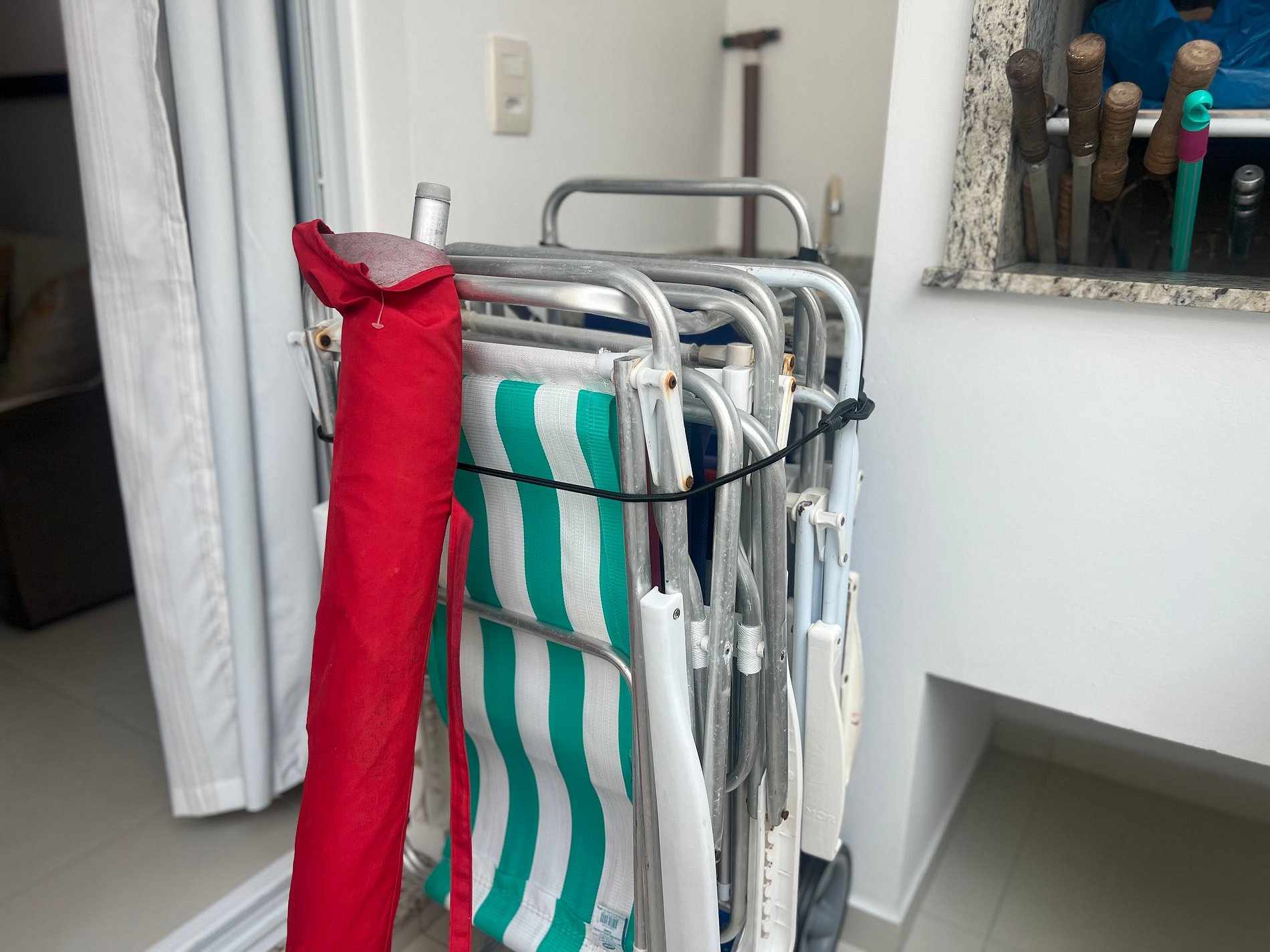 4 cadeiras, 1 carrinho e 1 guarda sol.
