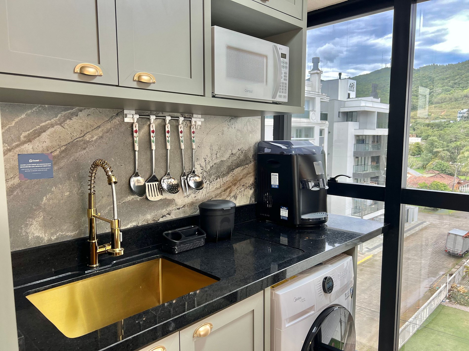 Cozinha: Fogão cooktop, geladeira, micro-ondas e utensílios de cozinha.