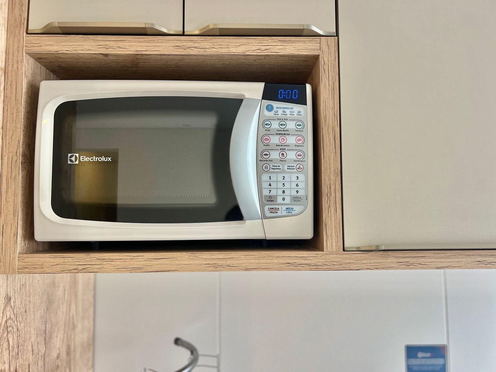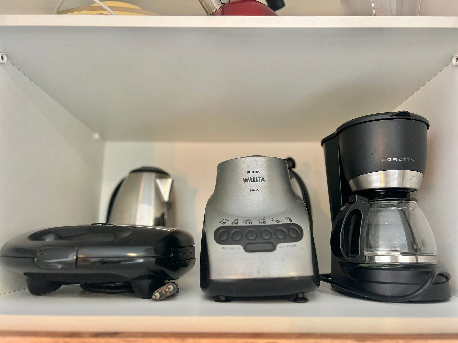 Cozinha: Fogão, geladeira, liquidificador, micro-ondas, sanduicheira, chaleira elétrica e utensílios de cozinha.