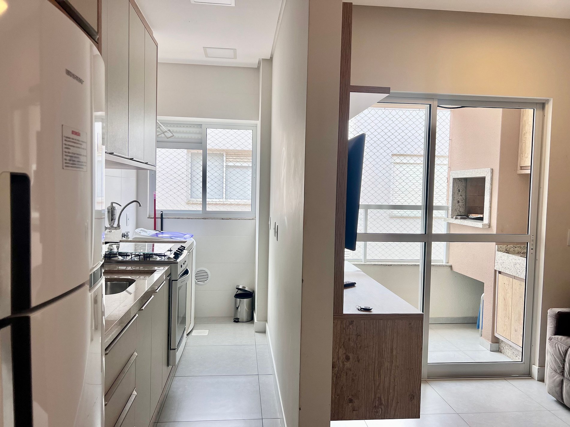 Apto possui 2 quartos, sendo 1 suíte, ambos possuem ar condicionado. Sala com TV Smart, Wi-fi, cozinha toda equipada e área de serviço com máquina de lavar, sacada com churrasqueira e mesa, 1 vaga de garagem coberta. Ambiente super preparado para receber os hóspedes da melhor forma.