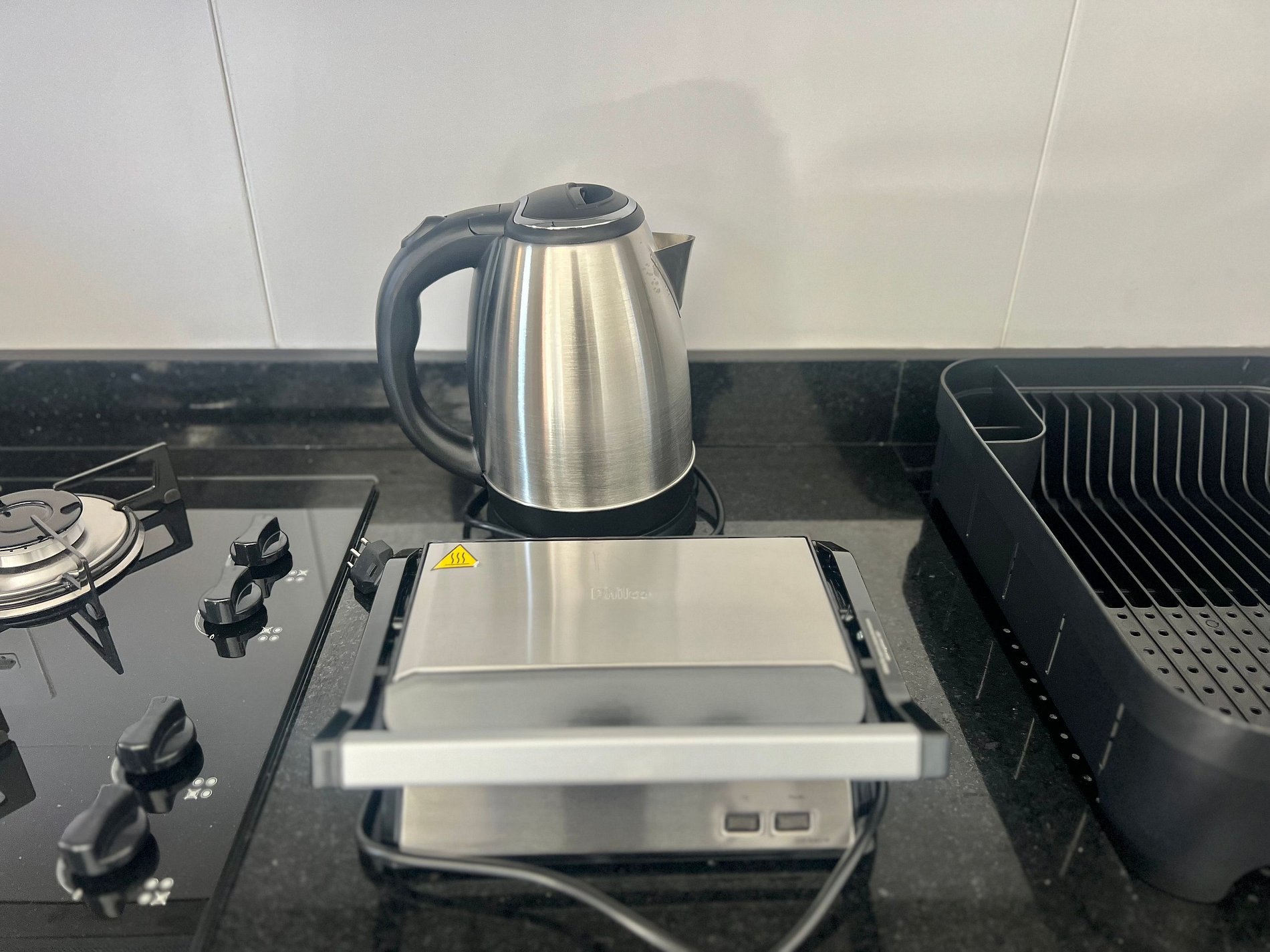 Geladeira, airfryer, chaleira elétrica, micro-ondas e utensílios básicos de cozinha