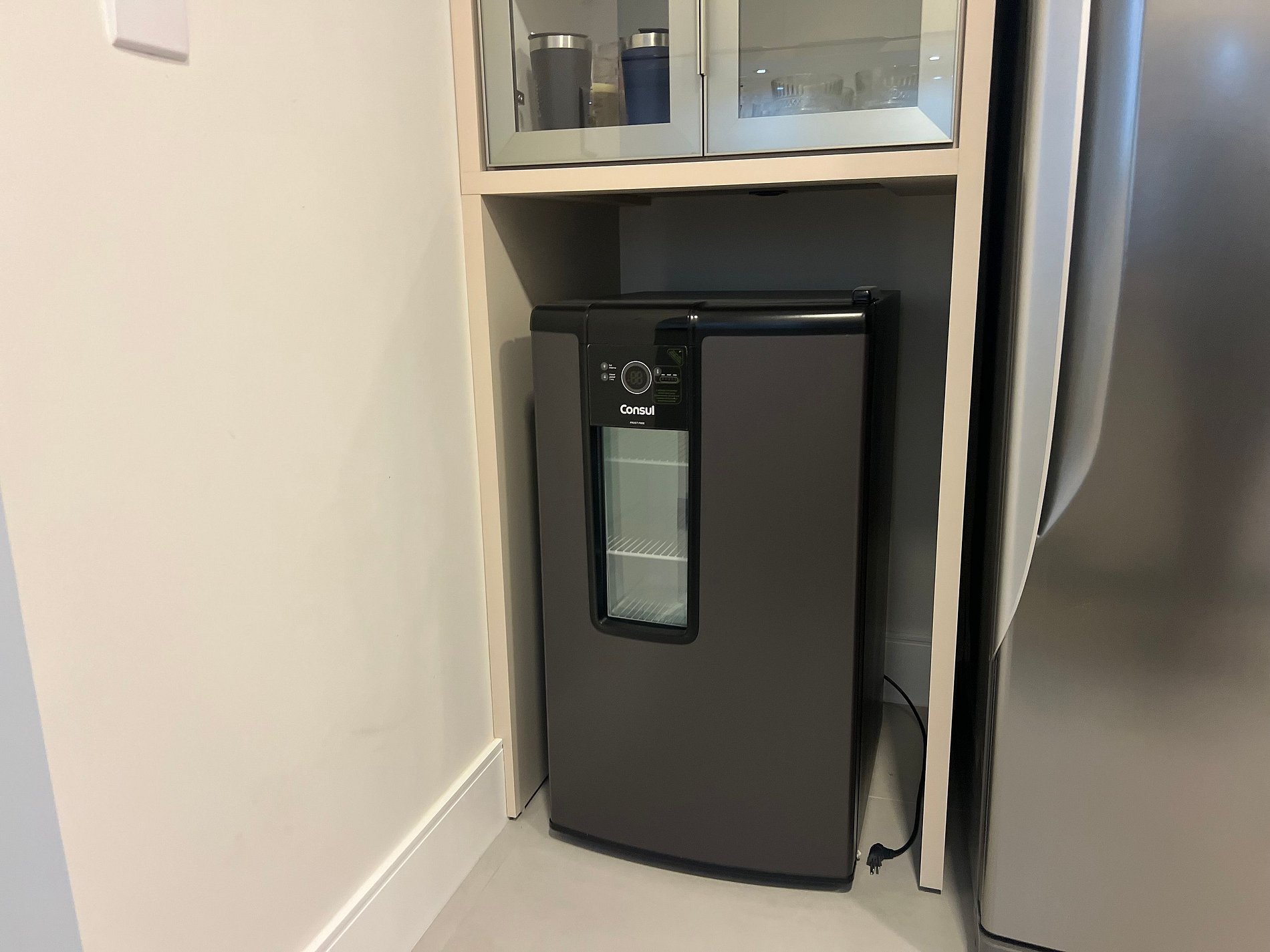 Cozinha: Fogão cooktop, geladeira, liquidificador, micro-ondas e utensílios de cozinha.