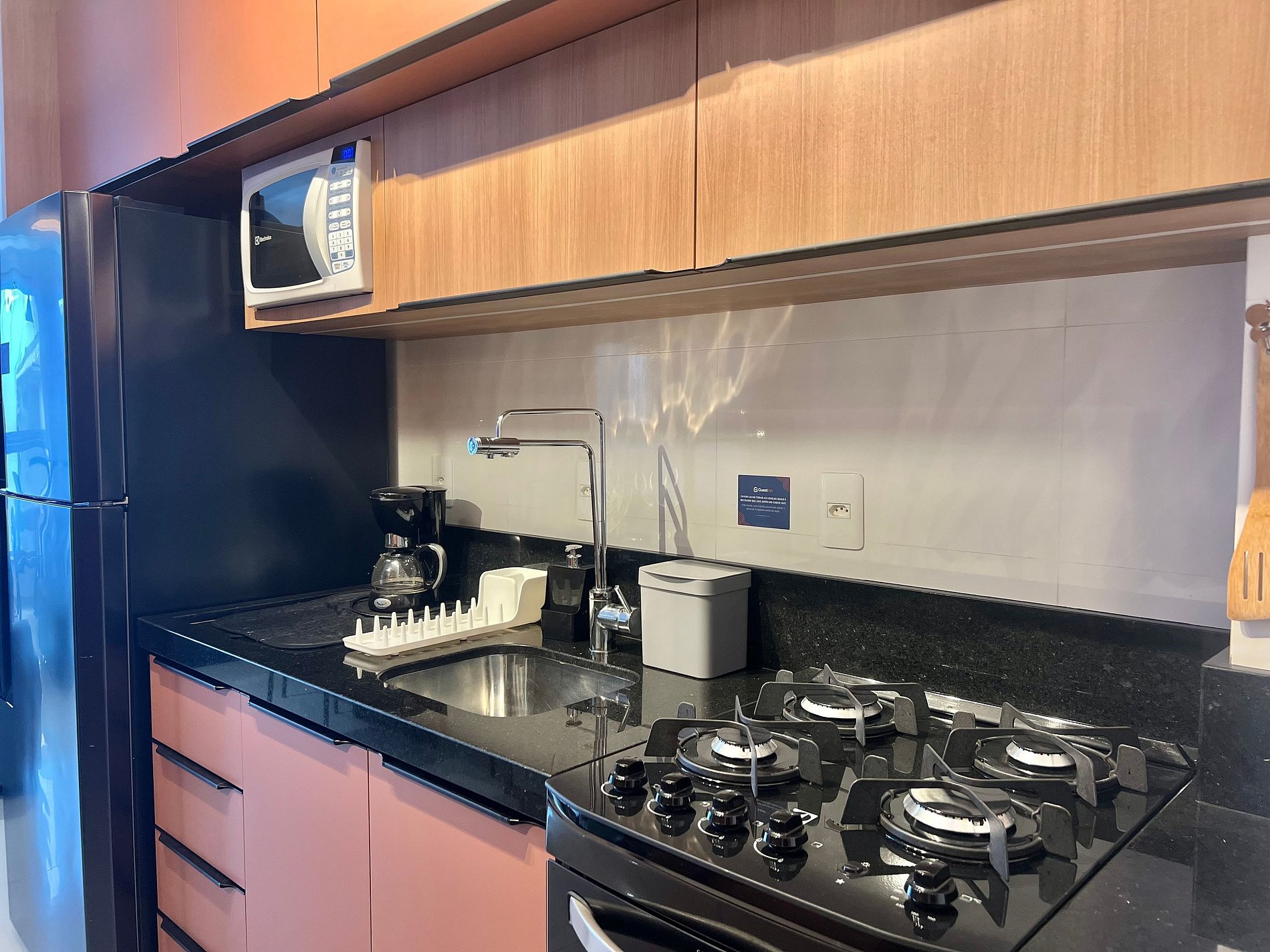 Geladeira, chaleira elétrica, sanduicheira, liquidificador, airfryer, cafeteira, micro-ondas, torneira com filtro e utensílios básicos de cozinha.